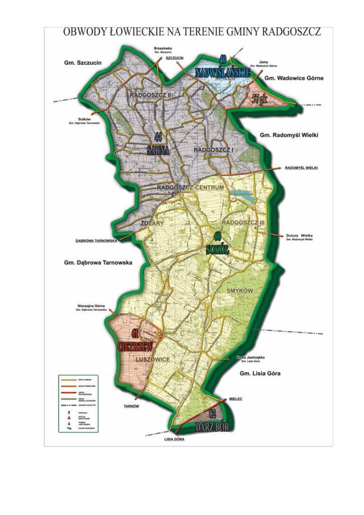 Koła łowieckie na terenie gminy Radgoszcz 1. 40 Koło łowieckie NADWIŚLAŃSKIE w Szczucinie Adres korespondencyjny: Ul. Zajezierze 5 33-230 Szczucin Czapla Antoni Prezes koła Mątwicki Mariusz Łowczy Łuszcz Czesław Skarbnik Kolano Bogdan tel. 502 490 224 2. 44 Koło Łowieckie ,,SARNA” w Radgoszczy Adres korespondencyjny: Ul. Śliczna 32a/52, 31-444 Kraków, tel. 661 834 519. E-mail: [email protected] Prezes koła Halina Wolak Łowczy Marian Sołtys 507407156 Vice łowczy Tadeusz Bugielski Skarbnik Hubert Miotła Sekretarz Tomasz Kopia 3. 60 Koło Łowieckie ,,SOKÓŁ” w Krakowie, 30-348 Kraków ul. Grota Roweckiego 51A/34 Prezes koła Edward Fryt ul. T. Kościuszki 37, 32-100 Proszowice 12 4153422, kom. 602 496 633 Podłowczy Piotr Krawczyk ul. Leśna 90A, 33-206 Luszowice tel. 608 506 625 4. 61 Koło Łowieckie ,,CIETRZEW” 33-200 Dąbrowa Tarnowska ul. Szarwarska 1 Prezes koła Głowacki Zygmunt ul. Szarwarska 1A/3 tel. 14 6422101 kom. 600 081 632 Łowczy Majka Krzysztof 5. 82 Koło łowieckie ,, DARZ BÓR’’ w Tarnowie 33-111 Koszyce Wielkie ul. Tarnowska 88 Prezes koła Jan Tarnowski Łowczy Stanisław Twardy Skarbnik Grzegorz Kórel tel. 502 511 150 6. 57 pk (Województwo Podkarpackie) Sporządziła: Ewa Chwałek Listopad 2011r. Wykaz obwodów łowieckich na terenie gminy Radgoszcz Na podstawie: 1. załącznika Nr 1 do Uchwały Nr VIII/92/07 Sejmiku Województwa Małopolskiego z dnia 28 maja 2007r. 2. załącznik do uchwały Nr XXVIII/503/08 Sejmiku Województwa Podkarpackiego z dnia 1 grudnia 2008 r. Numer obwodu Nazwa obszaru 40 Obszar obwodu (ha) Dąbrowica 7637 44 Radgoszcz 6395 60 Luszowice 7340 Opis granic obwodów łowieckich Północna granica obwodu biegnie rzeką Wisła, od przecięcia sie z drogą krajową Tarnów - Kielce do miejsca, gdzie granica województwa małopolskiego odchodzi od Wisły na południe. Granica wschodnia biegnie granicą administracyjną województwa małopolskiego, od Wisły, w kierunku południowym, przez zachodni skraj Nowej Wsi, przecina szosę Szczucin -Jaślany i przez zachodni skraj wsi Słupiec dochodzi do drogi biegnącej przez przysiółek Kasale. Drogą tą w kierunku południowym dochodzi do styku z droga Zabrnie - Wampierzów i dalej drogą Zabrnie Wampierzów do mostu na rzece Breń. Stąd granica obwodu biegnie w gorę rzeki Breń, do ujścia potoku Upust i dalej potokiem Upust, w gorę jego biegu do ujścia potoku Łoś, następnie w górę potoku Łoś do ujścia bezimiennego lewobrzeżnego dopływu do potoku Łoś i dalej dopływem tym do przecięcia sie z drogą Radgoszcz - Szczucin. Granica południowo zachodnia biegnie droga Radgoszcz Szczucin, od przecięcia się z bezimiennym lewobrzeżnym dopływem potoku Łoś (około 0,7km na północny zachód od skrzyżowania z drogą do wsi Jamy), do Szczucina i dalej droga krajowa Tarnów - Kielce do Wisły i punktu początkowego. Od północnego zachodu granica obwodu biegnie rzeka Breń, od przecięcia się z droga Smęgorzów - Szczucin do przecięcia sie z droga Szczucin - Małec. Stad droga ta biegnie na południowy wschód do Małca i do przecięcia się z lewobrzeżnym dopływem potoku Łoś. Wzdłuż tego dopływu (rowu) dochodzi do potoku Łoś. Tu skręca na południowy wschód i w górę potoku Łoś dochodzi do styku z granica województwa małopolskiego (jednocześnie północna granica gminy Radomyśl Wielki). Granica ta w kierunku wschodnim biegnie do miejsca, gdzie granica województwa odchodzi w kierunku północno zachodnim i dalej granica gminy Radomyśl Wielki dochodzi do drogi przysiółek Załuże - przysiółek Koniec i droga ta na południowy wschód do przecięcia sie z potokiem Jamnica. Stad granica obwodu biegnie w górę potoku Jamnica do przecięcia sie z szosa Radomyśl Wielki – Dabrowa Tarnowska. Dalej jako południowa granica, biegnie szosa Radomyśl Wielki - Dabrowa Tarnowska, w kierunku zachodnim od potoku Jamnica, przez Radgoszcz do styku z droga Nieczajna Górna - Sutków. Zachodnia granica obwodu biegnie droga Nieczajna Górna - Sutków do skrzyżowania z drogą biegnącą przez Gruszów Wielki. Droga ta biegnie ok. 200 m na zachód, po czym skręca na północ i droga przez zachodni skraj wsi Sutków, skręcając następnie na północny zachód i przez Podradwanie dochodzi do szosy Dąbrowa Tarnowska - Szczucin. Stad szosa ta w kierunku północno wschodnim granica obwodu dochodzi do mostu na rzece Breń i punktu początkowego. Północna granica obwodu biegnie szosa Dabrowa Tarnowska – Radomyśl Wielki, od skrzyżowania z droga do Nieczajnej Górnej, w kierunku północno wschodnim, przez Radgoszcz. Około 1.550m 61 Szarwark 4630 82 Żukowice 10403 stary nowy 2 57 TA pk za skrzyżowaniem z szosa do Szczucina granica obwodu skręca na drogę utwardzona i biegnie nią (jako wschodnia granica) w kierunku południowym około 700m, następnie skręca w kierunku wschodnim i biegnie około 500m, po czym ponownie skręca w kierunku południowym i przecina potok Dęba, dochodząc do przysiółka Poręby. z przysiółka Poręby biegnie w kierunku wschodnim do ponownego przecięcia sie z potokiem Dęba (w przysiółku Dębowiec), dalej biegnąc potokiem Dęba w górę jego biegu do przecięcia sie z szosa Mielec - Lisia Góra. Granica południowa obwodu biegnie szosa Mielec - Lisia Góra, od przecięcia sie z potokiem Dęba, na południowy zachód do skrzyżowania z droga do przysiółka Marek i z droga do wsi Lipiny (w Żukowicach Nowych).Droga lokalna w kierunku wsi Lipiny, około 300m, następnie północna granica administracyjna gminy Lisia Góra i po ok. 1.500 m, znów ta sama droga dochodzi do szosy Lipiny - Luszowice. Stad, jako granica zachodnia obwodu, biegnie droga Lipiny - Luszowice, przez Luszowice do przysiółka Podkościele. Tu skręca na północny zachód i droga przez Nieczajna Górna dociera do szosy Dabrowa Tarnowska - Radomyśl Wielki i punktu początkowego. Północna granica obwodu biegnie szosa Dabrowa Tarnowska 