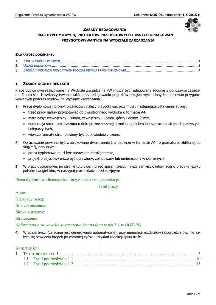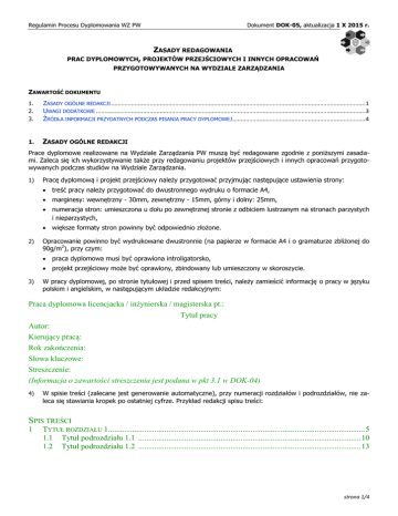 Regulamin Procesu Dyplomowania WZ PW Dokument DOK-05, aktualizacja 1 X 2015 r. ZASADY REDAGOWANIA PRAC DYPLOMOWYCH, PROJEKTÓW PRZEJŚCIOWYCH I INNYCH OPRACOWAŃ PRZYGOTOWYWANYCH NA WYDZIALE ZARZĄDZANIA ZAWARTOŚĆ DOKUMENTU 1. 2. 3. ZASADY OGÓLNE REDAKCJI ....................................................................................................................................................... 1 UWAGI DODATKOWE ................................................................................................................................................................ 3 ŹRÓDŁA INFORMACJI PRZYDATNYCH PODCZAS PISANIA PRACY DYPLOMOWEJ ............................................................................... 4 1. ZASADY OGÓLNE REDAKCJI Prace dyplomowe realizowane na Wydziale Zarządzania PW muszą być redagowane zgodnie z poniższymi zasadami. Zaleca się ich wykorzystywanie także przy redagowaniu projektów przejściowych i innych opracowań przygotowywanych podczas studiów na Wydziale Zarządzania. 1) Pracę dyplomową i projekt przejściowy należy przygotować przyjmując następujące ustawienia strony: treść pracy należy przygotować do dwustronnego wydruku o formacie A4, marginesy: wewnętrzny - 30mm, zewnętrzny - 15mm, górny i dolny: 25mm, numeracja stron: umieszczona u dołu po zewnętrznej stronie z odbiciem lustrzanym na stronach parzystych i nieparzystych, większe formaty stron powinny być odpowiednio złożone. 2) Opracowanie powinno być wydrukowane dwustronnie (na papierze w formacie A4 i o gramaturze zbliżonej do 90g/m2), przy czym: praca dyplomowa musi być oprawiona introligatorsko, projekt przejściowy może być oprawiony, zbindowany lub umieszczony w skoroszycie. 3) W pracy dyplomowej, po stronie tytułowej i przed spisem treści, należy zamieścić informację o pracy w języku polskim i angielskim, w następującym układzie redakcyjnym: Praca dyplomowa licencjacka / inżynierska / magisterska pt.: Tytuł pracy Autor: Kierujący pracą: Rok zakończenia: Słowa kluczowe: Streszczenie: (Informacja o zawartości streszczenia jest podana w pkt 3.1 w DOK-04) 4) W spisie treści (zalecane jest generowanie automatyczne), przy numeracji rozdziałów i podrozdziałów, nie zaleca się stawiania kropek po ostatniej cyfrze. Przykład redakcji spisu treści: SPIS TREŚCI 1 TYTUŁ ROZDZIAŁU 1 ................................................................................................................................ 5 1.1 Tytuł podrozdziału 1.1 ............................................................................................................... 10 1.2 Tytuł podrozdziału 1.2 ............................................................................................................... 13 strona 1/4 Regulamin Procesu Dyplomowania WZ PW 5) Dokument DOK-05, aktualizacja 1 X 2015 r. Redakcja rozdziałów i podrozdziałów: podział treści na rozdziały i podrozdziały musi być zgodny ze spisem treści, przy zachowaniu dwustopniowej hierarchii podziału (w uzasadnionych przypadkach, za zgodą promotora, można wprowadzić trzeci poziom numeracji), tytuły rozdziałów należy zapisać: od nowej strony, czcionką pogrubioną Times New Roman, kapitaliki, rozmiar 14, tytuły podrozdziałów: kontynuacja treści na stronie, czcionką pogrubioną Times New Roman, rozmiar 13, odstęp 18pkt przed akapitem i 6pkt po akapicie, wszystkie tytuły należy wyrównać do lewego marginesu, nie wprowadzać kropek po ostatniej cyfrze numeru rozdziału/podrozdziału i nie kończyć tytułu kropką, przykład: 1 TYTUŁ ROZDZIAŁU <treść> 1.1 Tytuł podrozdziału <treść> 6) Akapity: należy redagować bez wcięć, zapis czcionką Times New Roman o wielkości 12, z interlinią wielokrotną co 1,15 wiersza, z odstępem 4pkt przed akapitem i 0pkt po akapicie, nie stosować podkreśleń, a dla wymaganego wyróżnienia tekstu wykorzystać czcionkę pogrubioną lub kursywę, przy wyliczeniach należy stosować litery i symbole punktorów (np. w postaci kropki czy myślnika). przykład: Informacja zarządcza, powinna posiadać określone atrybuty, z których najistotniejsze to: (a) aktualność, (b) wiarygodność. Znaczenie tych atrybutów zostało wyjaśnione poniżej. (a) Aktualność Informacja zarządcza jest wynikiem interpretacji danych, które w działalności biznesowej ulegają ciągłym zmianom. Konieczne jest zapewnienie bieżącej aktualizacji danych. Niespełnienie tego warunku często jest spowodowane: • rozproszeniem danych w różnych źródłach danych: w zapisie cyfrowym, w formie drukowanej, • redundancją danych, • brakiem procedur aktualizacji danych lub brakiem realizacji tych procedur. . . . . . . 7) Z tekstu opracowania musi jednoznacznie wynikać, z jakich źródeł informacji korzystano podczas przygotowania opracowania, skąd pochodzą cytaty, dane liczbowe, wzory czy ilustracje zamieszczone w pracy. W tekście pracy należy podać źródło, z którego zaczerpnięto informacje, opisując je w postaci przypisu dolnego (w przypisie dolnym należy podać numer strony, z której pochodzi cytat, rysunek, tabela, itp.) oraz zamieścić w bibliografii. W spisie literatury zamieszcza się wszystkie źródła informacji (z podziałem na: bibliografia, akty prawne, źródła internetowe, inne źródła), z których autor korzystał w trakcie pisania pracy. Spis literatury sporządza się w porządku alfabetycznym uwzględniając nazwiska autorów lub tytuły (jeśli są to prace zbiorowe), opatrując każdą pozycję kolejnym numerem porządkowym ujętym w nawiasy [...]. Literatura obcojęzyczna pisana alfabetem inny niż łaciński (np. cyrylicą) podawana jest w oryginale lub transliteracji. strona 2/4 Regulamin Procesu Dyplomowania WZ PW Dokument DOK-05, aktualizacja 1 X 2015 r. Przykład: [1] Jaszkiewicz A. - Inżynieria oprogramowania. Helion, Gliwice 1997. [2] Lech P. - Metodyka ekonomicznej oceny przedsięwzięć informat