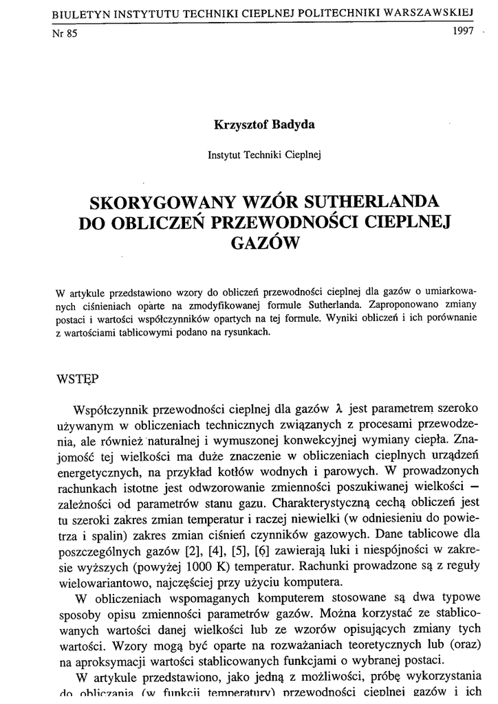 W artykule przedstawiono wzory do obliczeń przewodności cieplnej dla gazów o umiarkowanych ciśnieniach oparte na zmodyfikowanej formule Sutherlanda. Zaproponowano zmiany
