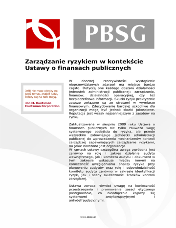 Zarządzanie ryzykiem w kontekście Ustawy o finansach publicznych Jeśli nie masz wiedzy na jakiś temat, znajdź ludzi, którzy się na nim znają. Jon M. Huntsman Huntsman Corporation W obecnej rzeczywistości wystąpienie nieprzewidzianych zdarzeń ma miejsce bardzo często. Dotyczą one każdego obszaru działalności jednostek administracji publicznej: zarządzania, finansów, działalności operacyjnej, czy też bezpieczeństwa informacji. Skutki ryzyk praktycznie zawsze związane są ze stratami w wymiarze finansowym. Zdecydowanie bardziej szkodliwe dla organizacji mogą być jednak skutki jakościowe. Reputacja jest wszak najcenniejszym z zasobów na rynku. Zaktualizowana w sierpniu 2009 roku Ustawa o finansach publicznych nie tylko zauważa wagę systemowego podejścia do ryzyka, ale przede wszystkim zobowiązuje jednostki administracji publicznej do wprowadzenia mechanizmów kontroli zarządczej zapewniających zarządzanie ryzykami, na jakie narażona jest organizacja. W ramach ustawy szczególna uwaga zwrócona jest zarówno na rolę i zakres działania audytu wewnętrznego, jak i komitetu audytu - dokument w tym zakresie wskazuje między innymi na konieczność uwzględniania analizy ryzyka przy planowaniu audytów oraz rolę i odpowiedzialność komitetu audytu zarówno w zakresie identyfikacji ryzyk, jak i oceny skuteczności środków kontroli zarządczej. Ustawa zwraca również uwagę na konieczność przestrzegania i promowania zasad etycznego postępowania, co nieodłącznie kojarzy się systemami antykorupcyjnymi i antydefraudacyjnymi. www.pbsg.pl Nasze podejście Usługi doradcze w zakresie dostosowania do wymagań Ustawy o finansach publicznych PBSG w ramach dostosowania do wymagań wynikających z Ustawy o finansach publicznych oferuje następujące rozwiązania: Szkolenia i warsztaty oraz doradztwo we wdrożenie modelu zintegrowanego zarządzania ryzykiem (wg COSO II) Efektem prac doradców jest udokumentowany i wdrożony system zarządzania ryzykiem zintegrowany z dotychczasową działalnością jednostki Szkolenia i warsztaty oraz doradztwo w zakresie organizacji wydziału/komórki audytu wewnętrznego W wyniku prac przeprowadzonych przez doradców PBSG w organizacji wdrożone zostają mechanizmy związane z planowaniem, realizacją i dokumentowaniem audytów Szkolenia i wdrożenie systemu przeciwdziałania zagrożeniom korupcyjnym Oprogramowanie Smart Architect, Smart Portal, Smart Audyt Oprogramowanie do modelowania I mapowania procesów pomaga w reorganizacji i usystematyzowaniu działań realizowanych w poszczególnych obszarach działania organizacji. Doskonalona podczas wielu projektów i zgodna z wymaganiami światowych standardów metodyka jest zawsze dostosowywana indywidualnie do Państwa potrzeb. W efekcie otrzymują Państwo profesjonalne wsparcie w wybranym obszarze zarządzania ryzykiem. Zrealizowaliśmy szereg projektów w zakresie zarządzania ryzykiem. Wsparliśmy naszą wiedzą i doświadczeniem firmy z sektora finansowego, energetycznego, produkcyjnego, jak również jednostki administracji publicznej (np. KRUS, ZUS, PKN, UDT, Urząd Marszałkowski Województwa Mazowieckiego, KNF). Budowaliśmy u naszych klientów korporacyjne mapy ryzyk, przygotowywaliśmy dokumentację procesu zarządzania ryzykiem, badaliśmy zgodność z wymogami ustawy SOX, testowaliśmy czynności kontrolne, wdrażaliśmy systemy bezpieczeństwa informacji. Zakres usług Oprogramowanie Risk Management Oprogramowanie PBSG pomaga w usystematyzowaniu procesu zarządzania ryzykiem w szczególności w zakresie zbierania, analizy i raportowania wartości poszczególnych ryzyk Nasze podejście opiera się na budowie zespołu projektowego składającego się z wyznaczonych pracowników z Państwa oraz naszej strony, stworzeniu harmonogramu działania oraz regularnych spotkaniach minimalizujących czas realizacji zadań i ewentualny wpływ na bieżące funkcjonowanie firmy. Nasze doświadczenie Zbudowany w oparciu o analizę ryzyka wystąpienia zdarzeń korupcyjnych system pomaga w minimalizacji i eliminowaniu potencjalnych ryzyk korupcyjnych. Projekty zarządzania ryzykiem wymagają wiedzy i doświadczenia oraz pełnego zaangażowania. Bardzo często organizacje nie mają zasobów w postaci czasu oraz osób potrzebnych do ich realizacji. Służymy w tym zakresie wsparciem. Oprogramowanie aCCelerate To światowej klasy rozwiązanie służące do budowy kompleksowego systemu zarządzania ryzykiem korporacyjnym. Zakres świadczonych przez nas usług obejmuje wdrożenie od podstaw całego procesu zarządzania ryzykiem, jak również wsparcie przy rozwijaniu poszczególnych jego części. Przeprowadzamy szkolenia i warsztaty. Zajmujemy się również wykonywaniem niezależnych przeglądów i audytów funkcjonujących w firmie rozwiązań, również w zakresie zgodności ze standardami COSO I i COSO II. www.pbsg.pl Standardowy projekt wdrożenia obejmuje następujące etapy: − Określenie zakresu projektu poprzez wyznaczenie komórek organizacyjnych i osób biorących udział w projekcie, − Przeprowadzenie szkoleń z zakresu zarządzania ryzykiem − Opracowanie metodyki zarządzania ryzykiem, − Identyfikacja ryzyk i odpowiadających im środków kontroli w poszczególnych obszarach działalności. − Analiza ryzyk w oparciu o ustaloną na wcześniejszym etapie metodykę oceny prawdopodobieństwa i skutków ich realizacji oraz metodykę oceny skuteczności funkcjonujących środków kontroli. − Wyznaczenie poziomów ryzyka, budowa mapy ryzyk oraz wyznaczenie poziomu akceptowalności. − − − Ustalenie reakcji na ryzyko. Wyznaczenie właścicieli ryzyk oraz menedżera ryzyka odpowiedzialnego za cały proces. Budowa dokumentacji procesu zarządzania ryzykiem W naszych projektach wspieramy się oprogramowaniem do zarządzania ryzykiem aCCelerate oraz Risk Management PBSG Jesteśmy firmą doradczą specjalizującą się w tematyce zarządzania ryzykiem. Wśród naszych klie