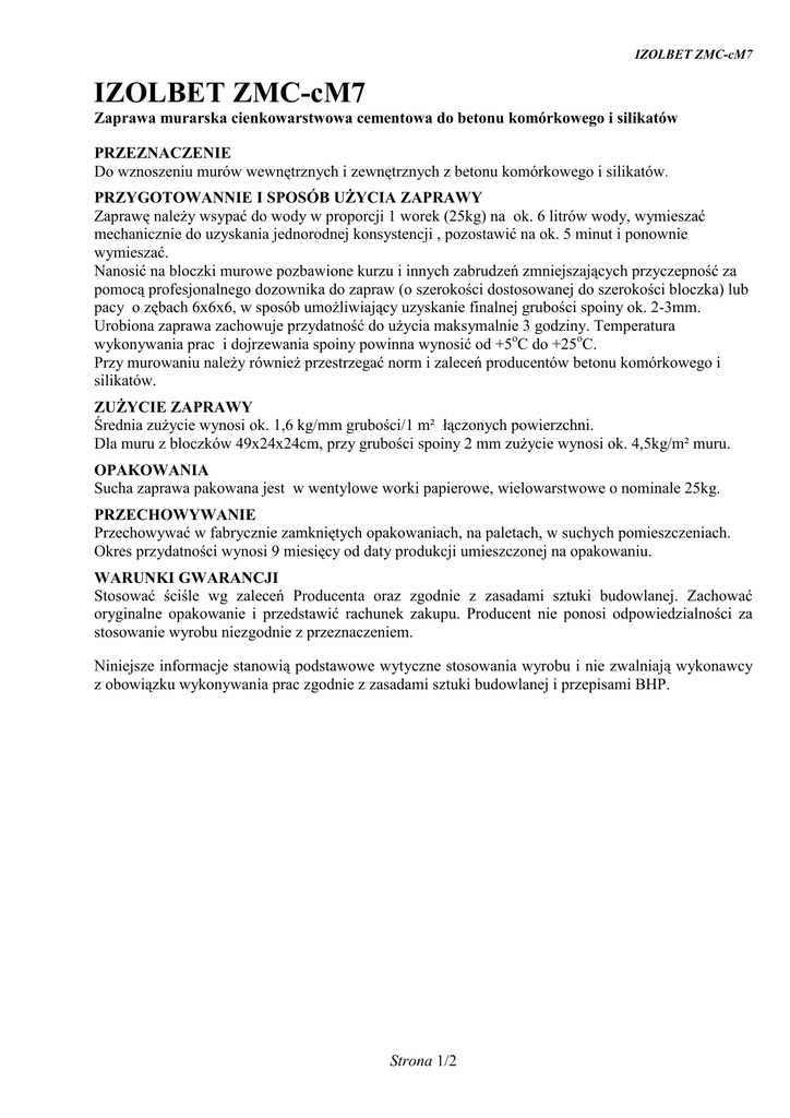 IZOLBET ZMC-cM7 IZOLBET ZMC-cM7 Zaprawa murarska cienkowarstwowa cementowa do betonu komórkowego i silikatów PRZEZNACZENIE Do wznoszeniu murów wewnętrznych i zewnętrznych z betonu komórkowego i silikatów. PRZYGOTOWANNIE I SPOSÓB UŻYCIA ZAPRAWY Zaprawę należy wsypać do wody w proporcji 1 worek (25kg) na ok. 6 litrów wody, wymieszać mechanicznie do uzyskania jednorodnej konsystencji , pozostawić na ok. 5 minut i ponownie wymieszać. Nanosić na bloczki murowe pozbawione kurzu i innych zabrudzeń zmniejszających przyczepność za pomocą profesjonalnego dozownika do zapraw (o szerokości dostosowanej do szerokości bloczka) lub pacy o zębach 6x6x6, w sposób umożliwiający uzyskanie finalnej grubości spoiny ok. 2-3mm. Urobiona zaprawa zachowuje przydatność do użycia maksymalnie 3 godziny. Temperatura wykonywania prac i dojrzewania spoiny powinna wynosić od +5oC do +25oC. Przy murowaniu należy również przestrzegać norm i zaleceń producentów betonu komórkowego i silikatów. ZUŻYCIE ZAPRAWY Średnia zużycie wynosi ok. 1,6 kg/mm grubości/1 m² łączonych powierzchni. Dla muru z bloczków 49x24x24cm, przy grubości spoiny 2 mm zużycie wynosi ok. 4,5kg/m² muru. OPAKOWANIA Sucha zaprawa pakowana jest w wentylowe worki papierowe, wielowarstwowe o nominale 25kg. PRZECHOWYWANIE Przechowywać w fabrycznie zamkniętych opakowaniach, na paletach, w suchych pomieszczeniach. Okres przydatności wynosi 9 miesięcy od daty produkcji umieszczonej na opakowaniu. WARUNKI GWARANCJI Stosować ściśle wg zaleceń Producenta oraz zgodnie z zasadami sztuki budowlanej. Zachować oryginalne opakowanie i przedstawić rachunek zakupu. Producent nie ponosi odpowiedzialności za stosowanie wyrobu niezgodnie z przeznaczeniem. Niniejsze informacje stanowią podstawowe wytyczne stosowania wyrobu i nie zwalniają wykonawcy z obowiązku wykonywania prac zgodnie z zasadami sztuki budowlanej i przepisami BHP. Strona 1/2 IZOLBET ZMC-cM7 OZNACZENIE: CE numer identyfikacyjny organu certyfikującego CPD-1488 IZOLBET Kazimierz Majchrzak i Wspólnicy Sp. Jawna ul. Kowalska 9 09-500 Gotynin 05 nr certyfikatu 1488-CPD-0020 PN-EN 998-2:2004 Wymagania dotyczące zapraw do murów Część 2: Zaprawa murarska Zaprawa murarska cementowa według projektu do cienkich spoin (T), do stosowania w elementach budowlanych podlegających wymaganiom konstrukcyjnym WŁAŚCIWOŚCI ŚWIEŻEJ I ZWIĄZANEJ ZAPRAWY ZMC-cM7 zgodnie z PN-EN 998-2:2004 Deklarowana cecha, przy Wartość L.p Jednost maksymalnej ilości 6,0 l wody deklarowa Sposób badania . ka na 25kg suchej zaprawy na 1 Czas zachowania właściwości roboczych 2 Zawartość chlorków NPD 3 Zawartość powietrza NPD 4 Wytrzymałość na ściskanie MPa >7 PN-EN 1015-11 5 Początkowa wytrzymałość spoiny na ścinanie MPa >0,30 PN-EN1052-3 6 Absorpcja wody Kg/m²mi n0,5 <0,2 PN-EN 1015-18 7 Przepuszczalność pary wodnejwspółczynnik dyfuzji µ 5/20 PN-EN 1745:2002 Tab. A.12 8 Gęstość stwardn.wysusz. zaprawy kg/m³ 1150-1200 PN-EN 1015-10 9 Współczynnik przewodzenia ciepła-λ 10,dry W/m*K 10 Trwałość: mrozoodporność – ubytek masy % 11 Trwałość :mrozoodporność- spadek wytrzymałości na zginanie % 12 Maksymalna frakcja kruszywa 0,6 13 Czas korekty świeżej mieszanki a) do silikatów b) do gazobetonu <3 <6 14 min min Reakcja na ogień 135 P=50%-0,37 PN-EN 1745:2002 P=90%Tab. A.12 0,41 PN-85/B-04500 <1,5 p.4.11 <30 Klasa A1 Strona 2/2 PN-EN 1015-9 PN-85/B-04500 p.4.11 PN-EN 1015-9: 2001 PN-EN998-1 Decyzja Komisji 96/603/WE