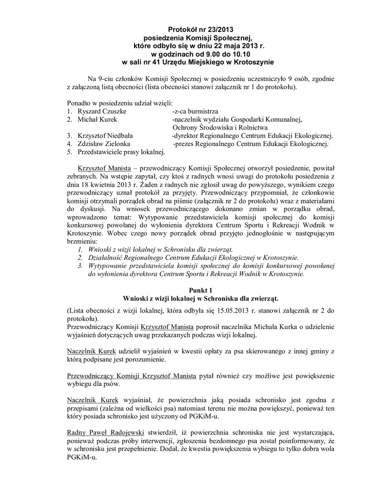 Protokół nr 23/2013 posiedzenia Komisji Społecznej, które odbyło się w dniu 22 maja 2013 r. w godzinach od 9.00 do 10.10 w sali nr 41 Urzędu Miejskiego w Krotoszynie Na 9-ciu członków Komisji Społecznej w posiedzeniu uczestniczyło 9 osób, zgodnie z załączoną listą obecności (lista obecności stanowi załącznik nr 1 do protokołu). Ponadto w posiedzeniu udział wzięli: 1. Ryszard Czuszke -z-ca burmistrza 2. Michał Kurek -naczelnik wydziału Gospodarki Komunalnej, Ochrony Środowiska i Rolnictwa 3. Krzysztof Niedbała -dyrektor Regionalnego Centrum Edukacji Ekologicznej. 4. Zdzisław Zielonka -prezes Regionalnego Centrum Edukacji Ekologicznej. 5. Przedstawiciele prasy lokalnej. Krzysztof Manista – przewodniczący Komisji Społecznej otworzył posiedzenie, powitał zebranych. Na wstępie zapytał, czy ktoś z radnych wnosi uwagi do protokołu posiedzenia z dnia 18 kwietnia 2013 r. Żaden z radnych nie zgłosił uwag do powyższego, wynikiem czego przewodniczący uznał protokół za przyjęty. Przewodniczący przypomniał, że członkowie komisji otrzymali porządek obrad na piśmie (załącznik nr 2 do protokołu) wraz z materiałami do dyskusji. Na wniosek przewodniczącego dokonano zmian w porządku obrad, wprowadzono temat: Wytypowanie przedstawiciela komisji społecznej do komisji konkursowej powołanej do wyłonienia dyrektora Centrum Sportu i Rekreacji Wodnik w Krotoszynie. Wobec czego nowy porządek obrad przyjęto jednogłośnie w następującym brzmieniu: 1. Wnioski z wizji lokalnej w Schronisku dla zwierząt. 2. Działalność Regionalnego Centrum Edukacji Ekologicznej w Krotoszynie. 3. Wytypowanie przedstawiciela komisji społecznej do komisji konkursowej powołanej do wyłonienia dyrektora Centrum Sportu i Rekreacji Wodnik w Krotoszynie. Punkt 1 Wnioski z wizji lokalnej w Schronisku dla zwierząt. (Lista obecności z wizji lokalnej, która odbyła się 15.05.2013 r. stanowi załącznik nr 2 do protokołu). Przewodniczący Komisji Krzysztof Manista poprosił naczelnika Michała Kurka o udzielenie wyjaśnień dotyczących uwag przekazanych podczas wizji lokalnej. Naczelnik Kurek udzielił wyjaśnień w kwestii opłaty za psa skierowanego z innej gminy z którą podpisane jest porozumienie. Przewodniczący Komisji Krzysztof Manista pytał również czy możliwe jest powiększenie wybiegu dla psów. Naczelnik Kurek wyjaśniał, że powierzchnia jaką posiada schronisko jest zgodna z przepisami (zależna od wielkości psa) natomiast terenu nie można powiększyć, ponieważ ten który posiada schronisko jest użyczony od PGKiM-u. Radny Paweł Radojewski stwierdził, iż powierzchnia schroniska nie jest wystarczająca, ponieważ podczas próby interwencji, zgłoszenia bezdomnego psa został poinformowany, że w schronisku jest przepełnienie. Dodał, że kwestia powiększenia wybiegu to tylko dobra wola PGKiM-u. Przewodniczący Manista pytał dalej czy jest możliwość podwyższenia płotu by nie zanieczyszczać schroniska śmieciami z wysypiska, sortowni śmieci. Naczelnik Kurek odpowiedział, że podwyższenie płotu na nic się nie zda, potrzebne jest założenie siatki a to leży w gestii PGKiM-u Przewodniczący pytał o możliwość remontu posadzek, dachów, pomieszczeń gospodarczych i deratyzację. Naczelnik Kurek wyjaśniał, iż remont posadzek oczywiście jest możliwy natomiast szczurów zawsze będzie dużo ponieważ jest to teren blisko wysypiska oraz specyficzne miejsce. Dodał również, że kończony jest remont pomieszczeń gospodarczych, dachy są w dobrym stanie należy poprawić przepływowość rynien, odpływów. Naczelnik tłumaczył, że wszystkie remonty prowadzone ze środków, które posiada schronisko a ogrom kosztów pochłaniają służby weterynaryjne, według naczelnika fundusze nie są należycie rozdzielane. Dodał również, iż od kilku tygodni nowym zarządcą schroniska jest EKO-Siódemka i może coś się zmieni w tej kwestii. Radny Jan Zych zwrócił uwagę obecnych, że wszystkim zwierzętom należy się szacunek aczkolwiek to człowiek jest najważniejszy. Po wyczerpaniu dyskusji komisja sformułowała następujące wnioski. Komisja Społeczna wnioskuje o poprawienie stanu technicznego płotu, posadzek w schronisku jak również o deratyzację oraz o pozyskanie terenu lub przydzielenie od PGKiM celem powiększenia wybiegu dla zwierząt. Ponadto komisja zwraca się o ponowne zamieszczenie na stronie Krotoszyna linku do adopcji bezdomnych zwierząt. Komisja Społeczna przyjęła wnioski jednogłośnie 8 głosami za, na 8 obecnych podczas głosowania. Punkt 2 Działalność Regionalnego Centrum Edukacji Ekologicznej w Krotoszynie. (Materiał stanowi załącznik nr 3 do protokołu) Przewodniczący Komisji Krzysztof Manista poprosił zaproszonych gości, dyrektora Krzysztofa Niedbałę i prezesa Zdzisława Zielonkę o głos w dyskusji. Radny Roman Olejnik pytał jakie imprezy przedstawione w sprawozdaniu są prowadzone głównie przez RCEE oraz w jaki sposób RCEE jest finansowane. Dyrektor Krzysztof Niedbała wyjaśniał, że wszystkie akcje przeprowadzane są przez RCEE inne podmioty są współorganizatorami. Jeśli chodzi o finansowanie to w głównej mierze RCEE jest finansowane przez Wojewódzki Fundusz Ochrony Środowiska i większość środków przeznaczona zostaje na nagrody do dzieci. Dodał, że dofinansowanie z gminy to 5%. Radny Roman Olejnik pytał dlaczego akcje nie trafiają do wszystkich szkół. Dyrektor Zdzisław Zielonka wyjaśniał, że wszystkie akcje kierowane są do Przedszkoli, Szkół Podstawowych i Gimnazjów, Technikum przeprowadza akcję nie uczestnicząc w niej. Dyrektor zaprosił do współpracy radnego Romana Olejnika. 2 Przewodniczący zwrócił uwagę na rewelacyjnie przeprowadzoną akcje „Posprzątaj po swoim psie” jaka miała miejsce w Zdunach, pytał czy w Krotoszynie też jest możliwość przeprowadzenie takiego zadania. Dyrektor Krzysztof Niedbała tłumaczył, iż akcja w Krotos