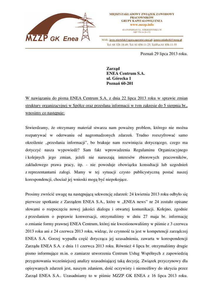 2013-07-29 Pismo MZZP GK ENEA do ENEA Centrum w sprawie