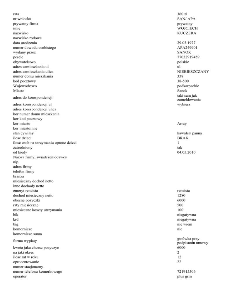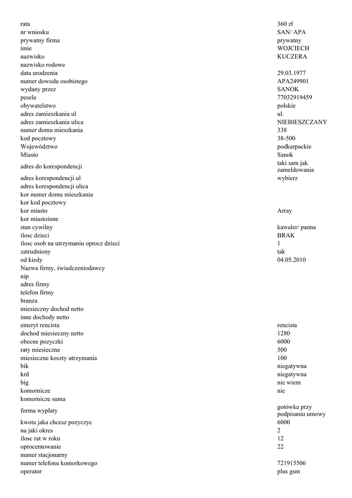 rata nr wniosku prywatny firma imie nazwisko nazwisko rodowe data urodzenia numer dowodu osobistego wydany przez pesele obywatelstwo adres zamieszkania ul adres zamieszkania ulica numer domu mieszkania kod pocztowy Województwo Miasto adres do korespondencji adres korespondencji ul adres korespondencji ulica kor numer domu mieszkania kor kod pocztowy kor miasto kor miastoinne stan cywilny ilosc dzieci ilosc osob na utrzymaniu oprocz dzieci zatrudniony od kiedy Nazwa firmy, świadczeniodawcy nip adres firmy telefon firmy branza miesieczny dochod netto inne dochody netto emeryt rencista dochod miesieczny netto obecne pozyczki raty miesieczne miesieczne koszty utrzymania bik krd big komornicze komornicze suma forma wyplaty kwota jaka chcesz pozyczyc na jaki okres ilosc rat w roku oprocentowanie numer stacjonarny numer telefonu komorkowego operator 360 zł SAN/ APA prywatny WOJCIECH KUCZERA 29.03.1977 APA249901 SANOK 77032919459 polskie ul. NIEBIESZCZANY 338 38-500 podkarpackie Sanok taki sam jak zameldowania wybierz Array kawaler/ panna BRAK 1 tak 04.05.2010 rencista 1280 6000 500 100 niegatywna niegatywna nie wiem nie gotówka przy podpisaniu umowy 6000 2 12 22 721915506 plus gsm adres email [email protected] zgodę na zamieszczenie i przetwarzanie moich danych osobowych w zbiorze danych Kasaszybka.pl, Oświadczam, że powyższe dane przekazuję dobrowolnie oraz przyjmuję do wiadomości, że wyrażam przysługuje mi prawo wglądu do swoich danych osobowych i ich poprawiania. Potwierdzam prawdziwość i kompletność podanych we wniosku informacji. zgodę/ (y) na zamieszczanie oraz przetwarzanie swoich danych osobowych w bazie danych Kasaszybka.pl. dla wszelkich celów marketingowych, w tym otrzymywania ofert, propozycji udziału w promocjach oraz materiałów marketingowych. Przyjmuję do wiadomości, że przysługuje wyrażam mi prawo wglądu do swoich danych osobowych i ich poprawiania oraz oświadczam, że przekazane wyżej dane przekazuje dobrowolnie. Zgodnie z Ustawą z dnia 18.07.2002 r. (Dz. U. nr 144, poz.1204) o świadczeniu usług drogą elektroniczną wyrażam zgodę na otrzymywanie informacji handlowych od firmy Kasaszybka.pl wyrażam drogą elektroniczną, w związku z wypełnionym i wysłanym przeze mnie formularzem kontaktowym w sprawie pożyczki gotówkowej w Kasaszybka.pl
