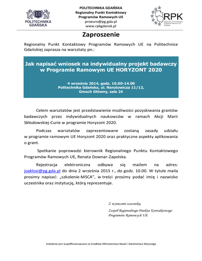 POLITECHNIKA GDAŃSKA Regionalny Punkt Kontaktowy Programów Ramowych UE [email protected] www.rpkgdansk.pl Zaproszenie Regionalny Punkt Kontaktowy Programów Ramowych UE na Politechnice Gdańskiej zaprasza na warsztaty pn.: Jak napisać wniosek na indywidualny projekt badawczy w Programie Ramowym UE HORYZONT 2020 4 września 2014, godz. 10.00-14.00 Politechnika Gdańska, ul. Narutowicza 11/12, Gmach Główny, sala 24 Celem warsztatów jest przedstawienie możliwości pozyskiwania grantów badawczych przez indywidualnych naukowców w ramach Akcji Marii Skłodowskiej-Curie w programie Horyzont 2020. Podczas warsztatów zaprezentowane zostaną zasady udziału w programie ramowym UE Horyzont 2020 oraz praktyczne aspekty aplikowania o grant. Spotkanie poprowadzi kierownik Regionalnego Punktu Kontaktowego Programów Ramowych UE, Renata Downar-Zapolska. Rejestracja elektroniczna odbywa się mailem na adres: [email protected] do dnia 2 września 2015 r., do godz. 10.00. W tytule maila prosimy napisać: „szkolenie-MSCA”, w treści prosimy podać imię i nazwisko uczestnika oraz instytucję, którą reprezentuje. Z wyrazami szacunku, Zespół Regionalnego Punktu Kontaktowego Programów Ramowych UE Szkolenie jest współfinansowane ze środków Ministerstwa Nauki i Szkolnictwa Wyższego