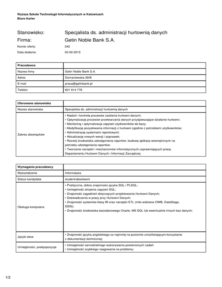 Wyższa Szkoła Technologii Informatycznych w Katowicach Biuro Karier Stanowisko: Specjalista ds. administracji hurtownią danych Firma: Getin Noble Bank S.A. Numer oferty: 242 Data dodania: 03-02-2015 Pracodawca Nazwa firmy Getin Noble Bank S.A. Adres Domaniewska 39/B E-mail [email protected] Telefon 601 914 778 Oferowane stanowisko Nazwa stanowiska Specjalista ds. administracji hurtownią danych • Nadzór i kontrolę procesów zasilania hurtowni danymi; • Optymalizację procesów przetwarzania danych przyśpieszające działanie hurtowni; • Monitoring i optymalizacja zapytań użytkowników do bazy; Zakres obowiązków • Modyfikację pozyskiwania informacji z hurtowni zgodnie z potrzebami użytkowników; • Administrację systemami raportowymi; • Aktualizację nowych wersji i poprawek; • Rozwój środowiska udostępniania raportów, budowę aplikacji wewnętrznych na potrzeby udostępniania raportów; • Tworzenie narzędzi i mechanizmów informatycznych usprawniających pracę Departamentu Hurtowni Danych i Informacji Zarządczej. Wymagania pracodawcy Wykształcenie Informatyka Status kandydata student/absolwent • Praktyczna, dobra znajomości języka SQL i PLSQL; • Umiejętność strojenia zapytań SQL; • Znajomość zagadnień dotyczących projektowania Hurtowni Danych; • Doświadczenia w pracy przy Hurtowni Danych; Obsługa komputera Języki obce Umiejętności, predyspozycje 1/2 • Znajomość systemów klasy BI oraz narzędzi ETL (mile widziane OWB, DataStage, SSIS); • Znajomość środowiska bazodanowego Oracle, MS SQL lub ewentualnie innych baz danych; • Znajomość języka angielskiego co najmniej na poziomie umożliwiającym korzystanie z dokumentacji technicznej; • Umiejętność samodzielnego wykonywania powierzonych zadań. • Umiejętność szybkiego reagowania na problemy; Warunki pracy Wymagane dokumenty CV, list motywacyjny Forma umowy umowa o pracę Czas zatrudnienia - Godzinowy wymiar pracy pełny etat Data rozpoczęcia pracy 2015-03-31 Inne świadczenia Rekrutacja Termin i forma zgłoszenia 03-03-2015, [email protected] Sposób kontaktowania się z firmą [email protected] Osoby zainteresowane naszą ofertą prosimy o przesłanie CV oraz listu motywacyjnego na poniższy adres wraz z klauzulą: Oświadczam, że wyrażam zgodę na przetwarzanie danych osobowych zawartych w mojej ofercie pracy dla potrzeb aktualnych i przyszłych procesów rekrutacji prowadzonych przez Dodatkowe informacje jednostki z grupy kapitałowej (w rozumieniu przepisów ustawy o ofercie publicznej i warunkach wprowadzania instrumentów finansowych do zorganizowanego systemu obrotu oraz spółkach publicznych), do której należy Getin Noble Bank SA z siedzibą w Warszawie przy ul. Przyokopowej 33 (zgodnie z ustawą z dnia 29.08.1997 r. O Ochronie Danych Osobowych, Dz. Ustaw nr 133 poz. 883 z późn. zm.). [email protected] z dopiskiem OFN/DHD/02/15/WSTI/Katowice w tytule wiadomości. Informujemy, że skontaktujemy się tylko z wybranymi kandydatami. 2/2