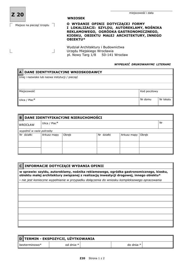 miejscowość i data Z 20 WNIOSEK Miejsce na pieczęć Urzędu O WYDANIE OPINII DOTYCZĄCEJ FORMY I LOKALIZACJI: SZYLDU, AUTOREKLAMY, NOŚNIKA REKLAMOWEGO, OGRÓDKA GASTRONOMICZNEGO, KIOSKU, OBIEKTU MAŁEJ ARCHITEKTURY, INNEGO OBIEKTU* Wydział Architektury i Budownictwa Urzędu Miejskiego Wrocławia pl. Nowy Targ 1/8 50-141 Wrocław WYPEŁNIĆ DRUKOWANYMI LITERAMI A DANE IDENTYFIKACYJNE WNIOSKODAWCY Imię i nazwisko lub nazwa instytucji / pieczęć Miejscowość Kod pocztowy Ulica / Plac* Nr domu Nr lokalu B DANE IDENTYFIKACYJNE NIERUCHOMOŚCI WROCŁAW Nr Ulica / Plac* wypełnić w razie potrzeby Nr działki Arkusz mapy Obręb Nr działki Arkusz mapy Obręb C INFORMACJE DOTYCZĄCE WYDANIA OPINII w sprawie: szyldu, autoreklamy, nośnika reklamowego, ogródka gastronomicznego, kiosku, obiektu małej architektury związanej z realizacją inwestycji drogowej, innego obiektu* - nie jest konieczne wypełnianie w przypadku dołączenia do wniosku kompleksowego opracowania D TERMIN - EKSPOZYCJI, UśYTKOWANIA bezterminowo* od dnia:* do dnia:* Z20 Strona 1 z 2 E DO WNIOSKU DOŁĄCZAM:* Ilość 1. fragment mapy z oznaczoną lokalizacją określający usytuowanie obiektu w terenie 2. projekt graficzny 3. lokalizację reklamy na elewacji 4. 5. 6. UWAGI: 1. Opinie wydawane są na podstawie Zarządzeń Prezydenta Wrocławia: a. nr 749/07 z dnia 2 kwietnia 2007 r. z późniejszymi zmianami, w sprawie określenia zasad udostępniania nieruchomości w celu umieszczania szyldów, autoreklam, nośników reklamowych, b. nr 4863/05 z dnia 7 marca 2005 r. z późniejszymi zmianami, w sprawie określania zasad organizowania w sezonie letnim ogródków gastronomicznych na gruntach stanowiących własność Gminy Wrocław i zarządzanych przez Gminę oraz w pasie drogowym dróg publicznych zarządzanych przez Prezydenta Wrocławia. 2. W przypadku szyldu, autoreklamy naleŜy przedłoŜyć projekt graficzny oraz lokalizację na obiekcie. 3. Mapy oraz informacje o adresie geodezyjnym terenu inwestycji moŜna uzyskać w Zarządzie Geodezji Kartografii i Katastru Miejskiego we Wrocławiu przy al. M. Kromera 44. 4. Opinia nie zwalnia z obowiązków wynikających z prawa budowlanego tzn. wystąpienia o pozwolenie na budowę lub zgłoszenia zamiaru prowadzenia robót budowlanych. podpis wnioskodawcy lub pełnomocnika * niepotrzebne skreślić Z20 Strona 2 z 2