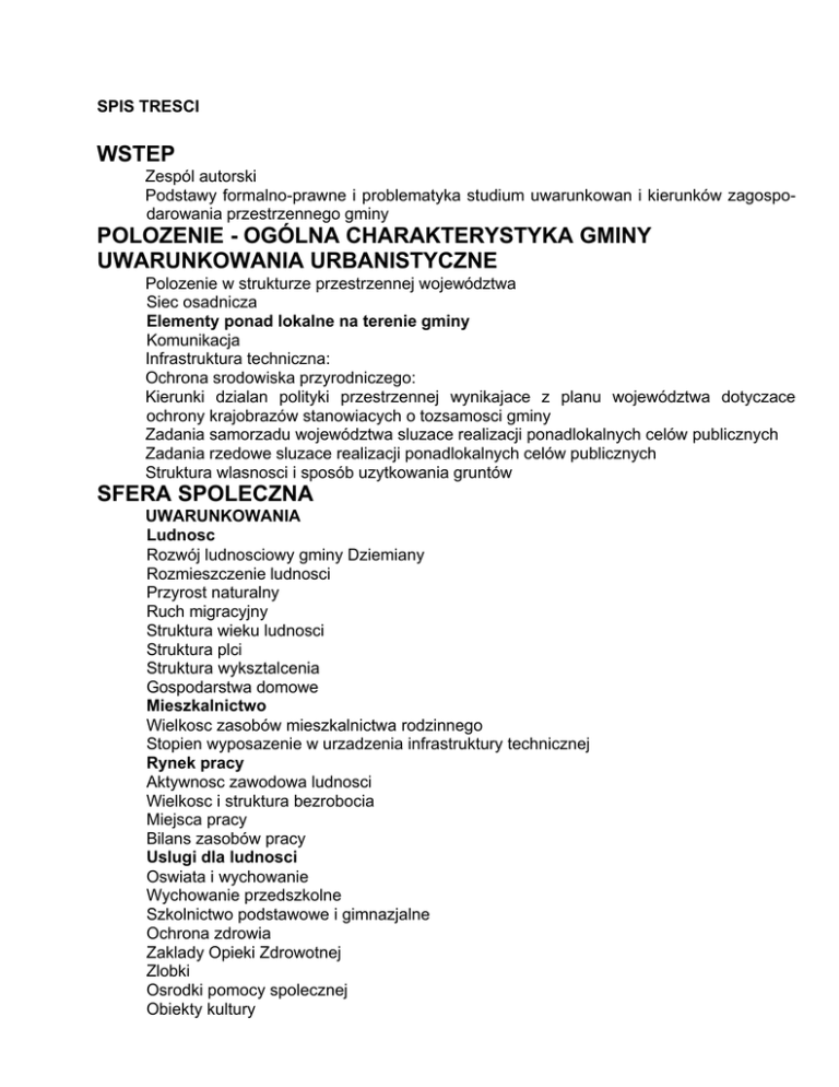 SPIS TRESCI WSTEP Zespól autorski Podstawy formalno-prawne i problematyka studium uwarunkowan i kierunków zagospodarowania przestrzennego gminy POLOZENIE - OGÓLNA CHARAKTERYSTYKA GMINY UWARUNKOWANIA URBANISTYCZNE Polozenie w strukturze przestrzennej województwa Siec osadnicza Elementy ponad lokalne na terenie gminy Komunikacja Infrastruktura techniczna: Ochrona srodowiska przyrodniczego: Kierunki dzialan polityki przestrzennej wynikajace z planu województwa dotyczace ochrony krajobrazów stanowiacych o tozsamosci gminy Zadania samorzadu województwa sluzace realizacji ponadlokalnych celów publicznych Zadania rzedowe sluzace realizacji ponadlokalnych celów publicznych Struktura wlasnosci i sposób uzytkowania gruntów SFERA SPOLECZNA UWARUNKOWANIA Ludnosc Rozwój ludnosciowy gminy Dziemiany Rozmieszczenie ludnosci Przyrost naturalny Ruch migracyjny Struktura wieku ludnosci Struktura plci Struktura wyksztalcenia Gospodarstwa domowe Mieszkalnictwo Wielkosc zasobów mieszkalnictwa rodzinnego Stopien wyposazenie w urzadzenia infrastruktury technicznej Rynek pracy Aktywnosc zawodowa ludnosci Wielkosc i struktura bezrobocia Miejsca pracy Bilans zasobów pracy Uslugi dla ludnosci Oswiata i wychowanie Wychowanie przedszkolne Szkolnictwo podstawowe i gimnazjalne Ochrona zdrowia Zaklady Opieki Zdrowotnej Zlobki Osrodki pomocy spolecznej Obiekty kultury 2 Biblioteki Obiekty sakralne Baza noclegowa Obiekty sportowe i rekreacyjne SFERA SPOLECZNA KIERUNKI Prognoza liczby ludnosci gminy Dziemiany do roku 2020 Zalozenia do prognozy Wyniki prognozy liczby ludnosci Prognoza liczby gospodarstw domowych Prognoza liczby osób aktywnych zawodowo Omówienie wyników prognozy INFRASTRUKTURA TECHNICZNA DIAGNOZA STANU ISTNIEJACEGO I UWARUNKOWANIA Zaopatrzenie w wode Odprowadzanie i oczyszczanie scieków Scieki sanitarne Scieki opadowe Regulacja stosunków wodnych Melioracje, zagrodzenie powodziowe Zagrozenia jakosci wód Unieszkodliwianie odpadów Zaopatrzenie w cieplo Zaopatrzenie w gaz Zaopatrzenie w energie elektryczna Telekomunikacja UWARUNKOWANIA Uwarunkowania zewnetrzne Wynikajace ze „Strategii rozwoju województwa pomorskiego”. Wynikajace z „Planu zagospodarowania przestrzennego województwa pomorskiego Wynikajace z projektu „Planu gospodarki odpadami dla województwa pomorskiego” Wynikajace z przepisów prawa Uwarunkowania wynikajace z analiz stanu istniejacego Uwarunkowania lokalizacji elektrowni wiatrowych Standardy obslugi Zaopatrzenie w wode. Odprowadzanie i oczyszczanie scieków. Zaopatrzenie w cieplo. Zaopatrzenie w gaz. Zaopatrzenie w energie elektryczna. Usuwanie i unieszkodliwianie odpadów. INFRASTRUKTURA TECHNICZNA KIERUNKI ROZWOJU Cele i zasady rozwoju. Propozycje rozwiazan Zaopatrzenie w wode. Odprowadzanie i oczyszczanie scieków Kanalizacja podcisnieniowa Kanalizacja cisnieniowa 3 Zaopatrzenie w gaz i cieplo Zaopatrzenie w energie elektryczna Unieszkodliwianie odpadów ROLNICTWO UWARUNKOWANIA Charakterystyka srodowiska przyrodniczego. Warunki przyrodnicze. Warunki klimatyczne Charakterystyka gleb. Zestawienie wyników badan zasobnosci, odczynu gleb oraz potrzeb wapnowania gminy Dziemiany Bonitacja gleb. Uzytkowanie gruntów Struktura obszarowa gospodarstw Produkcja rolna. Produkcja roslinna Produkcja zwierzeca ROLNICTWO KIERUNKI ROZWOJU PRODUKCJI ROLNEJ. KOMUNIKACJA UWARUNKOWANIA Polozenie gminy Dziemiany na tle ukladu komunikacyjnego kraju i regionu Obciazenie ruchem na drodze wojewódzkiej 235 Powiazania gminy komunikacja zbiorowa Klasyfikacja administracyjna dróg Klasyfikacja funkcjonalna Sciezki rowerowe KOMUNIKACJA KIERUNKI ROZWOJU UKLADU KOMUNIKACYJNEGO Uklad drogowy Uklad kolejowy ARCHEOLOGIA UWARUNKOWANIA Obiekty i strefy ochrony archeologicznej prawnie chronione Uwarunkowania i ograniczenia wynikajace z ochrony archeologicznego srodowiska kulturowego ARCHEOLOGIA KIERUNKI Ocena zagrozen archeologicznego srodowiska kulturowego Postulaty dotyczace ochrony i ksztaltowania archeologicznego srodowiska kulturowego SRODOWISKO PRZYRODNICZE UWARUNKOWANIA Ogólna charakterystyka gminy Zarys charakterystyki geomorfologicznej i geologicznej Wody powierzchniowe. Warunki klimatyczne 4 Zródla zanieczyszczen, zagrozen i degradacji srodowiska Stan czystosci wód powierzchniowych. Stan czystosci powietrza atmosferycznego. Lasy Bory i brzeziny bagienne Bory sosnowe swieze i mieszane Ubogie lasy bukowe i bukowo – debowe Lasy debowo – grabowe i swietliste dabrowy Olsy i zarosla wierzbowe Porolne nasadzenia drzew Obszary i obiekty chronione SRODOWISKO PRZYRODNICZE KIERUNKI Obszary objete ochrona na podstawie przepisów szczególnych Obszary wskazane do objecia ochrona na podstawie przepisów szczególnych Lokalne wartosci srodowiska przyrodniczego Zasady ochrony i wzmocnienia systemu terenów aktywnych biologicznie DZIEDZICTWO KULTUROWE UWARUNKOWANIA Wstep Rys historyczny Systematyka cech przedmiotu opracowania Opis ogólny. Formy osadnicze Zagroda Architektura Wartosci niematerialne Wartosci krajobrazowe Szczególowa systematyka cech poszczególnych miejscowosci i ich otoczenia krajobrazowego DZIEMIANY DUNAJKI JASTRZEBIE DZIEMIANSKIE KALISZ KASZUBSKI PIECHOWICE DABRÓWKA PLESY- RÓW RADUN SCHODNO TRZEBUN DYWAN Waloryzacja DZIEDZICTWO KULTUROWE KIERUNKI Wnioski i wytyczne dla ochrony wartosci i ksztaltowania srodowiska kulturowego Ogólne. Szczególowe. 5 URBANISTYKA- KIERUNKI ROZWOJU Kierunki gospodarcze Kierunki przestrzenne Obszary proponowane do objecia miejscowymi planami zagospodarowania przestrzennego LITERATURA KARTOGRAFIA ZALACZNIKI GRAFICZNE INFORMACJE DODATKOWE CELE PROGRAMU SAPARD ZAPROSZENIE DO SKLADANIA WNIOSKÓW O UDZIELENIE DOTACJI W ramach programu Innowacje i technologie dla rozwoju przedsiebiorstw ZAPROSZENIE DO SKLADANIA WNIOSKÓW O UDZIELENIE DOTACJI do Programu pomocowego Unii Europejskiej Phare 2001 Spójnosc Spoleczna i Gospodarcza (Phare 2001 SSG) Rozwój Malych i Srednich Przedsiebiorstw 6 WSTEP Zespól autorski studium W sklad zespolu autorskiego studium w