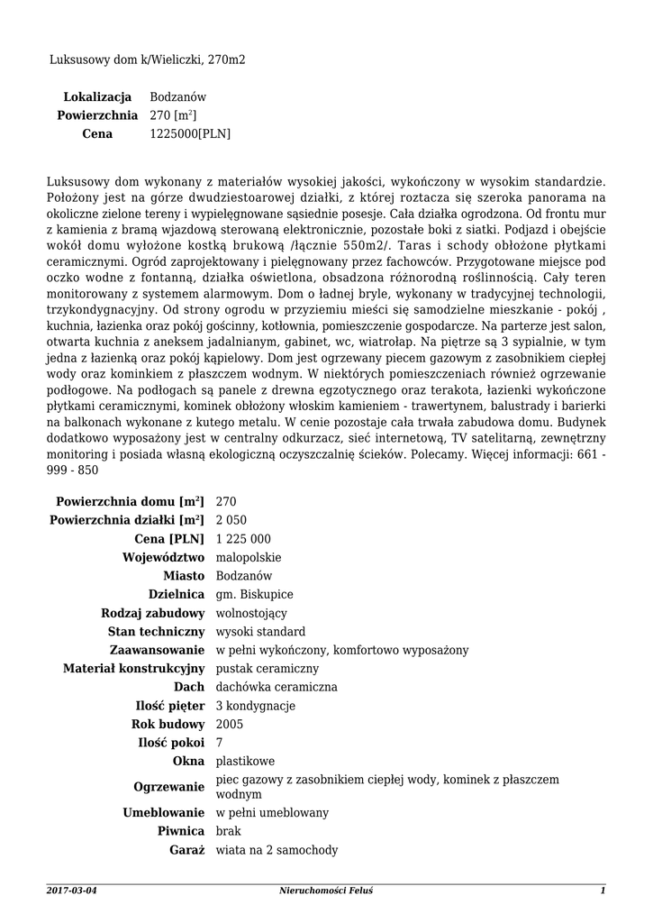 Luksusowy dom k/Wieliczki, 270m2 Lokalizacja Bodzanów Powierzchnia 270 [m2] Cena 1225000[PLN] Luksusowy dom wykonany z materiałów wysokiej jakości, wykończony w wysokim standardzie. Położony jest na górze dwudziestoarowej działki, z której roztacza się szeroka panorama na okoliczne zielone tereny i wypielęgnowane sąsiednie posesje. Cała działka ogrodzona. Od frontu mur z kamienia z bramą wjazdową sterowaną elektronicznie, pozostałe boki z siatki. Podjazd i obejście wokół domu wyłożone kostką brukową /łącznie 550m2/. Taras i schody obłożone płytkami ceramicznymi. Ogród zaprojektowany i pielęgnowany przez fachowców. Przygotowane miejsce pod oczko wodne z fontanną, działka oświetlona, obsadzona różnorodną roślinnością. Cały teren monitorowany z systemem alarmowym. Dom o ładnej bryle, wykonany w tradycyjnej technologii, trzykondygnacyjny. Od strony ogrodu w przyziemiu mieści się samodzielne mieszkanie - pokój , kuchnia, łazienka oraz pokój gościnny, kotłownia, pomieszczenie gospodarcze. Na parterze jest salon, otwarta kuchnia z aneksem jadalnianym, gabinet, wc, wiatrołap. Na piętrze są 3 sypialnie, w tym jedna z łazienką oraz pokój kąpielowy. Dom jest ogrzewany piecem gazowym z zasobnikiem ciepłej wody oraz kominkiem z płaszczem wodnym. W niektórych pomieszczeniach również ogrzewanie podłogowe. Na podłogach są panele z drewna egzotycznego oraz terakota, łazienki wykończone płytkami ceramicznymi, kominek obłożony włoskim kamieniem - trawertynem, balustrady i barierki na balkonach wykonane z kutego metalu. W cenie pozostaje cała trwała zabudowa domu. Budynek dodatkowo wyposażony jest w centralny odkurzacz, sieć internetową, TV satelitarną, zewnętrzny monitoring i posiada własną ekologiczną oczyszczalnię ścieków. Polecamy. Więcej informacji: 661 999 - 850 Powierzchnia domu [m2] 270 Powierzchnia działki [m2] 2 050 Cena [PLN] 1 225 000 Województwo malopolskie Miasto Bodzanów Dzielnica gm. Biskupice Rodzaj zabudowy wolnostojący Stan techniczny wysoki standard Zaawansowanie w pełni wykończony, komfortowo wyposażony Materiał konstrukcyjny pustak ceramiczny Dach dachówka ceramiczna Ilość pięter 3 kondygnacje Rok budowy 2005 Ilość pokoi 7 Okna plastikowe Ogrzewanie piec gazowy z zasobnikiem ciepłej wody, kominek z płaszczem wodnym Umeblowanie w pełni umeblowany Piwnica brak Garaż wiata na 2 samochody 2017-03-04 Nieruchomości Feluś 1 Zieleń pięknie urządzony ogród Zobacz wszystkie oferty z działu: Domy Kraków 2017-03-04 Nieruchomości Feluś 2