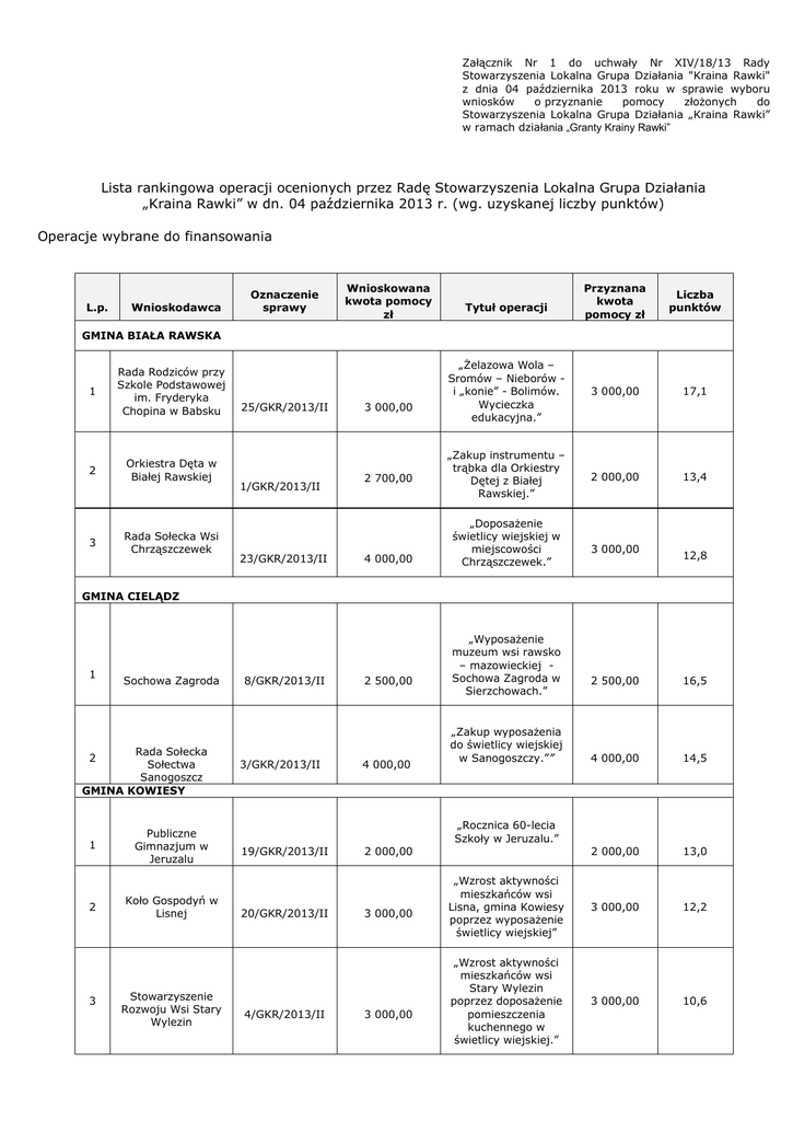 Załącznik Nr 1 do uchwały Nr XIV/18/13 Rady Stowarzyszenia Lokalna Grupa Działania "Kraina Rawki" z dnia 04 października 2013 roku w sprawie wyboru wniosków o przyznanie pomocy złożonych do Stowarzyszenia Lokalna Grupa Działania „Kraina Rawki” w ramach działania „Granty Krainy Rawki” Lista rankingowa operacji ocenionych przez Radę Stowarzyszenia Lokalna Grupa Działania „Kraina Rawki” w dn. 04 października 2013 r. (wg. uzyskanej liczby punktów) Operacje wybrane do finansowania L.p. Wnioskodawca Oznaczenie sprawy Wnioskowana kwota pomocy zł Przyznana kwota pomocy zł Liczba punktów „Żelazowa Wola – Sromów – Nieborów i „konie” - Bolimów. Wycieczka edukacyjna.” 3 000,00 17,1 „Zakup instrumentu – trąbka dla Orkiestry Dętej z Białej Rawskiej.” 2 000,00 13,4 Tytuł operacji GMINA BIAŁA RAWSKA 1 2 3 Rada Rodziców przy Szkole Podstawowej im. Fryderyka Chopina w Babsku Orkiestra Dęta w Białej Rawskiej Rada Sołecka Wsi Chrząszczewek 25/GKR/2013/II 1/GKR/2013/II 23/GKR/2013/II 3 000,00 2 700,00 4 000,00 „Doposażenie świetlicy wiejskiej w miejscowości Chrząszczewek.” 3 000,00 12,8 GMINA CIELĄDZ 1 Sochowa Zagroda Rada Sołecka 2 Sołectwa Sanogoszcz GMINA KOWIESY 1 Publiczne Gimnazjum w Jeruzalu 2 Koło Gospodyń w Lisnej 3 Stowarzyszenie Rozwoju Wsi Stary Wylezin 8/GKR/2013/II 3/GKR/2013/II 2 500,00 4 000,00 „Wyposażenie muzeum wsi rawsko – mazowieckiej Sochowa Zagroda w Sierzchowach.” 2 500,00 16,5 4 000,00 14,5 2 000,00 13,0 „Wzrost aktywności mieszkańców wsi Lisna, gmina Kowiesy poprzez wyposażenie świetlicy wiejskiej” 3 000,00 12,2 „Wzrost aktywności mieszkańców wsi Stary Wylezin poprzez doposażenie pomieszczenia kuchennego w świetlicy wiejskiej.” 3 000,00 10,6 „Zakup wyposażenia do świetlicy wiejskiej w Sanogoszczy.”” „Rocznica 60-lecia Szkoły w Jeruzalu.” 19/GKR/2013/II 20/GKR/2013/II 4/GKR/2013/II 2 000,00 3 000,00 3 000,00 GMINA RAWA MAZOWIECKA 1 2 3 4 Rada Sołecka Sołectwa Przewodowice Obrzędowy Zespół Ludowy „Wilkowianie” Koło Gospodyń Wiejskich w Linkowie Zespół Śpiewaczy z Boguszyc „Zakup wyposażenia siłowni oraz Sali fitness w Przewodowicach.” 3 000,00 18,1 „Porcelanowe wesele, czyli 20-lecia Obrzędowego Zespołu Ludowego „Wilkowianie” 2 000,00 14,0 4 000,00 „Zwiększenie integracji mieszkańców obszaru działania LGD „Kraina Rawki” poprzez zorganizowanie andrzejkowej imprezy integracyjnej w świetlicy w Starej Rossosze.” 1 500,00 13,9 18/GKR/2013/II 4 000,00 „Wyposażenie zespołu ludowego ‘Zespół Śpiewaczy z Boguszyc’ w stroje ludowe.” 1 500,00 13,4 12/GKR/2013/II 4 000,00 „Zakup wyposażenia (zaplecza gastronomicznego).” 4 000,00 14,1 13/GKR/2013/II 3 000,00 „Zakup instrumentów muzycznych i nagłośnienia.” 3 000,00 14,0 11/GKR/2013/II 1 000,00 „Zorganizowanie festynu wiejskiego w miejscowości Studzianki.” 1 000,00 12,1 5/GKR/2013/II 9/GKR/2013/II 6/GKR/2013/II 4 000,00 4 000,00 GMINA SADKOWICE 1 2 Sołectwo Wsi Nowy Kłopoczyn Stowarzyszenie Rozwoju Wsi Trębaczew Sołectwo Studzianki 3 Przewodniczący Rady /-/ Krzysztof Starczewski