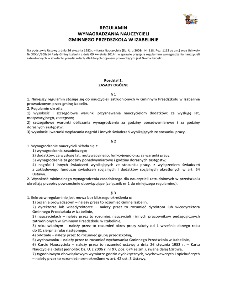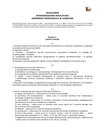 REGULAMIN WYNAGRADZANIA NAUCZYCIELI GMINNEGO PRZEDSZKOLA W IZABELINIE Na podstawie Ustawy z dnia 26 stycznia 1982r. – Karta Nauczyciela (Dz. U. z 2003r. Nr 118. Poz. 1112 ze zm.) oraz Uchwały Nr XXXVI/308/14 Rady Gminy Izabelin z dnia 09 kwietnia 2014r. w sprawie przyjęcia regulaminu wynagradzania nauczycieli zatrudnionych w szkołach i przedszkolach, dla których organem prowadzącym jest Gmina Izabelin. Rozdział 1. ZASADY OGÓLNE §1 1. Niniejszy regulamin stosuje się do nauczycieli zatrudnionych w Gminnym Przedszkolu w Izabelinie prowadzonym przez gminę Izabelin. 2. Regulamin określa: 1) wysokośd i szczegółowe warunki przyznawania nauczycielom dodatków: za wysługę lat, motywacyjnego, zastępstw; 2) szczegółowe warunki obliczania wynagrodzenia za godziny ponadwymiarowe i za godziny doraźnych zastępstw; 3) wysokośd i warunki wypłacania nagród i innych świadczeo wynikających ze stosunku pracy. §2 1. Wynagrodzenie nauczycieli składa się z: 1) wynagrodzenia zasadniczego; 2) dodatków: za wysługę lat, motywacyjnego, funkcyjnego oraz za warunki pracy; 3) wynagrodzenia za godziny ponadwymiarowe i godziny doraźnych zastępstw; 4) nagród i innych świadczeo wynikających ze stosunku pracy, z wyłączeniem świadczeo z zakładowego funduszu świadczeo socjalnych i dodatków socjalnych określonych w art. 54 Ustawy. 2. Wysokośd minimalnego wynagrodzenia zasadniczego dla nauczycieli zatrudnionych w przedszkolu określają przepisy powszechnie obowiązujące (załącznik nr 1 do niniejszego regulaminu). §3 1. Ilekrod w regulaminie jest mowa bez bliższego określenia o: 1) organie prowadzącym – należy przez to rozumied Gminę Izabelin, 2) dyrektorze lub wicedyrektorze – należy przez to rozumied dyrektora lub wicedyrektora Gminnego Przedszkola w Izabelinie, 3) nauczycielach – należy przez to rozumied nauczycieli i innych pracowników pedagogicznych zatrudnionych w Gminnym Przedszkolu w Izabelinie, 3) roku szkolnym – należy przez to rozumied okres pracy szkoły od 1 września danego roku do 31 sierpnia roku następnego, 4) oddziale – należy przez to rozumied grupę przedszkolną, 5) wychowanku – należy przez to rozumied wychowanka Gminnego Przedszkola w Izabelinie, 6) Karcie Nauczyciela – należy przez to rozumied ustawę z dnia 26 stycznia 1982 r. – Karta Nauczyciela (tekst jednolity: Dz. U. z 2006 r. nr 97, poz. 674 ze zm.), zwaną dalej Ustawą, 7) tygodniowym obowiązkowym wymiarze godzin dydaktycznych, wychowawczych i opiekuoczych – należy przez to rozumied norm określone w art. 42 ust. 3 Ustawy. 2 Rozdział 2. DODATEK ZA WYSŁUGĘ LAT §4 1. Wysokośd oraz zaliczanie okresów zatrudnienia i innych okresów uprawniających do dodatku za wysługę lat określa art. 33 Ustawy i przepisy wykonawcze. 2. Dodatek za wysługę lat przysługuje za dni, za które nauczyciel otrzymuje wynagrodzenie oraz za dni nieobecności w pracy z powodu choroby lub konieczności osobistego sprawowania opieki nad dzieckiem lub chorym członkiem rodziny, za które nauczyciel otrzymuje z tego tytułu zasiłek z ubezpieczenia społecznego. Rozdział 3. DODATEK MOTYWACYJNY §5 1. Nauczycielowi przysługuje dodatek motywacyjny w zależności od liczby realizowanych zadao i jakości świadczonej pracy za spełnienie następujących warunków ogólnych: 1) osiągnięcia w realizowanym procesie dydaktycznym, 2) osiągnięcia wychowawczo-opiekuocze, 3) wprowadzanie innowacji pedagogicznych skutkujących efektami w procesie kształcenia i wychowania, 4) zaangażowanie w realizację czynności i zajęd, o których mowa w art. 42 ust. 2 pkt. 2 Ustawy. 5) szczególnie efektywne wypełnianie zadao i obowiązków związanych z powierzoną funkcją, 6) realizowanie w przedszkolu zadao edukacyjnych wynikających z przyjętych przez organ prowadzący priorytetów w lokalnej polityce edukacyjnej. 2. Wysokośd środków finansowych przeznaczonych na dodatki motywacyjne dla nauczycieli wynoszą 15% wynagrodzenia zasadniczego nauczycieli zatrudnionych w przedszkolu. 3. Dodatek motywacyjny przyznaje się na czas określony nie krótszy niż jeden miesiąc i nie dłuższy niż rok. 4. Przyznanie dodatku motywacyjnego oraz określenie jego wysokości dla nauczycieli należy do kompetencji dyrektora, a dla dyrektora – do kompetencji Wójta Gminy Izabelin. 5. Dodatek motywacyjny wypłaca się z góry, w terminie wypłaty wynagrodzenia. §6 1. Przy ustalaniu prawa do dodatku motywacyjnego dla nauczycieli oraz jego wysokości uwzględnia się także: 1) uzyskiwanie przez wychowanków, z uwzględnieniem ich możliwości, dobrych wyników wychowawczo – dydaktycznych potwierdzonych sukcesami w konkursach, festiwalach, 2) doprowadzenie wychowanka do sukcesów naukowych, sportowych lub artystycznych w skali co najmniej międzyprzedszkolnej, 3) stosowanie aktywizujących metod nauczania, efektywne wykorzystywanie środków dydaktycznych, nowatorskie organizowanie pracy wychowanków i własnej, bądź inne przedsięwzięcia służące podniesieniu jakości pracy przedszkola, 4) umiejętne rozwiązywanie problemów wychowawczych we współpracy z rodzicami dzieci, atrakcyjne formy pracy, ilośd czasu poświęcanego wychowankom poza zajęciami edukacyjnymi, 5) rzetelne informowanie rodziców o postępach i trudnościach oraz rozpoznawanie środowiska wychowawczego dzieci i organizowanie pomocy, 6) rzetelne prowadzenie dokumentacji przebiegu nauczania, 3 7) respektowanie wymagao dotyczących dyscypliny pracy oraz terminowości w wykonywaniu zadao i zarządzeo, a także dbałośd o powierzone pomieszczenia, sprzęt i urządzenia, 8) czynny i efektywny udział w pracach rady pedagogicznej i jej zespołach zadaniowych, aktywnośd w organizowaniu imprez i uroczystości, 9) uczestniczenie w zorganizowanych formach doskonalenia zawodowego, a także podnoszenie umiejętności i kwalifikacji zawodowych w formie samokształcenia, 10) współdziałanie ze wszystkimi członkami społeczności przedszkolnej