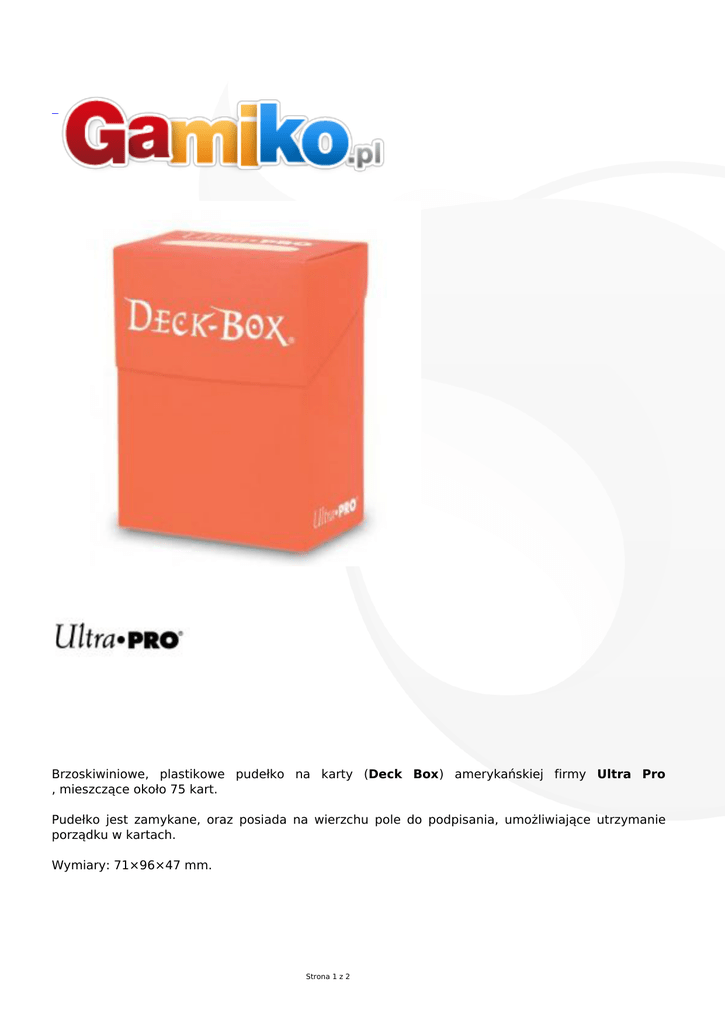 Brzoskiwiniowe, plastikowe pudełko na karty (Deck Box) amerykańskiej firmy Ultra Pro , mieszczące około 75 kart. Pudełko jest zamykane, oraz posiada na wierzchu pole do podpisania, umożliwiające utrzymanie porządku w kartach. Wymiary: 71×96×47 mm. Strona 1 z 2 Producent Ultra-Pro Strona 2 z 2