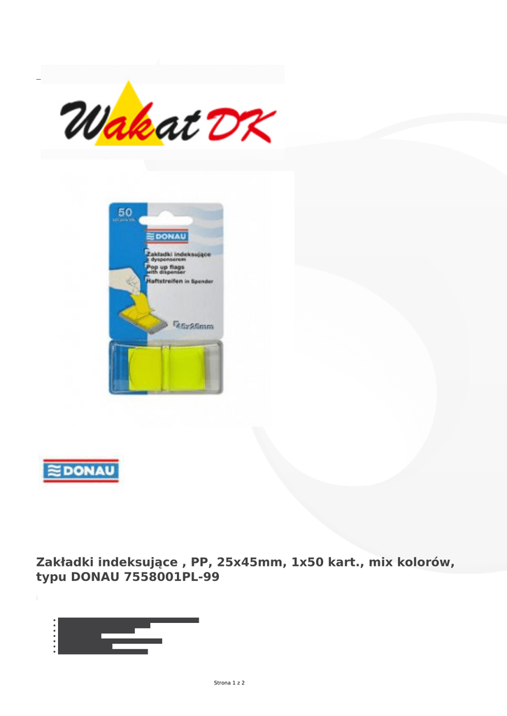 Zakładki indeksujące , PP, 25x45mm, 1x50 kart., mix kolorów, typu DONAU 7558001PL-99 idealne do pozostawienia wiadomości zarówno w biurze jak i domu ilość zakładek: 1x50 w rozmiarze 25x45mm wykonane z folii PP o grubości 60μm wielorazowe, cienkie można po nich pisać cienkopisami lub markerami dyspenser wykonany z PP zakładki w intensywnych, żywych kolorach Strona 1 z 2 klej usuwalny za pomocą wody mix kolorów (żółty, różowy, pomarańczowy, zielony) Strona 2 z 2