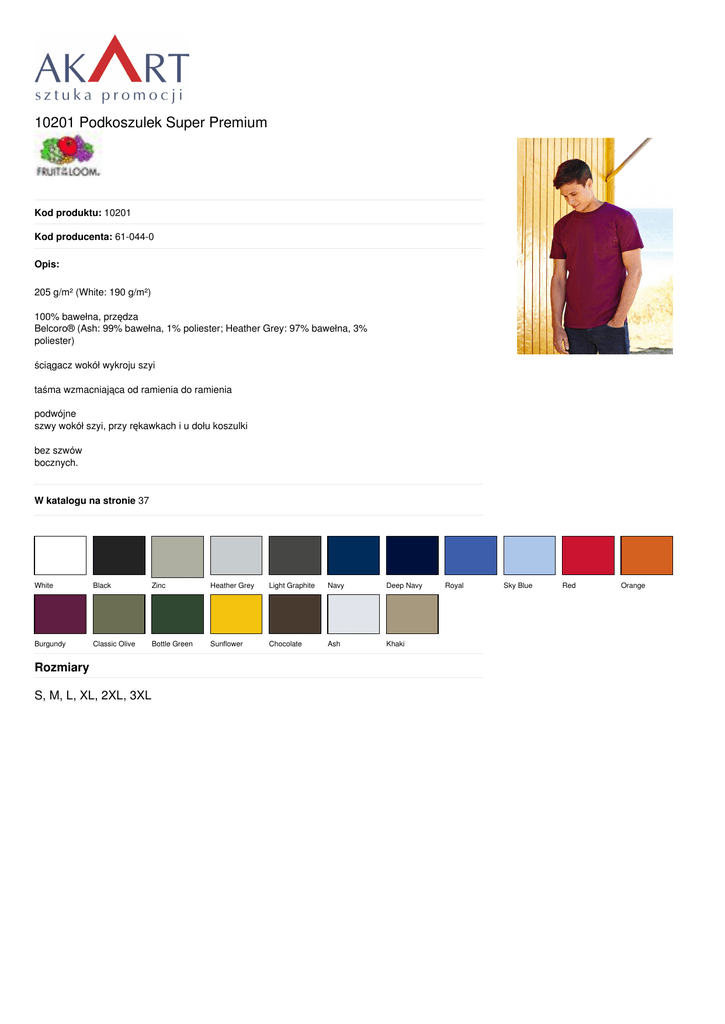 10201 Podkoszulek Super Premium Kod produktu: 10201 Kod producenta: 61-044-0 Opis: 205 g/m² (White: 190 g/m²) 100% bawełna, przędza Belcoro® (Ash: 99% bawełna, 1% poliester; Heather Grey: 97% bawełna, 3% poliester) ściągacz wokół wykroju szyi taśma wzmacniająca od ramienia do ramienia podwójne szwy wokół szyi, przy rękawkach i u dołu koszulki bez szwów bocznych. W katalogu na stronie 37 White Black Zinc Heather Grey Light Graphite Navy Deep Navy Burgundy Classic Olive Bottle Green Sunflower Chocolate Ash Khaki Rozmiary S, M, L, XL, 2XL, 3XL Royal Sky Blue Red Orange