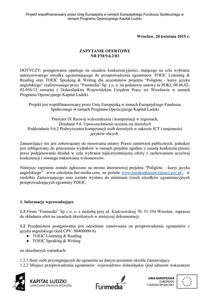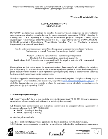 Projekt współfinansowany przez Unię Europejską w ramach Europejskiego Funduszu Społecznego w ramach Programu Operacyjnego Kapitał Ludzki. Wrocław, 20 kwietnia 2015 r. ZAPYTANIE OFERTOWE NR FM/9.6.2/03 DOTYCZY: postępowania opartego na zasadzie konkurencyjności, mającego na celu wybranie autoryzowanego ośrodka egzaminującego do przeprowadzenia egzaminów TOEIC Listening & Reading oraz TOEIC Speaking & Writing dla uczestników projektu “Poliglota - kursy języka angielskiego” realizowanego przez “Funmedia” Sp. z o. o. na podstawie umowy nr POKL.09.06.0202-056/13 zawartej z Dolnośląskim Wojewódzkim Urzędem Pracy we Wrocławiu w ramach Programu Operacyjnego Kapitał Ludzki. Projekt jest współfinansowany przez Unię Europejską w ramach Europejskiego Funduszu Społecznego w ramach Programu Operacyjnego Kapitał Ludzki Priorytet IX Rozwój wykształcenia i kompetencji w regionach, Działanie 9.6. Upowszechnienie uczenia się dorosłych Poddziałanie 9.6.2 Podwyższenie kompetencji osób dorosłych w zakresie ICT i znajomości języków obcych. Zamawiający nie jest zobowiązany do stosowania ustawy Prawo zamówień publicznych, jednakże jest zobligowany do ponoszenia wydatków w ramach projektu zgodnie z zasadą konkurencyjności przez podejmowanie działań w celu wybrania najkorzystniejszej oferty z zachowaniem uczciwej konkurencji i równego traktowania wykonawców. Niniejsze zapytanie zostało ogłoszone na stronie internetowej projektu “Poliglota – kursy języka angielskiego” www.szkolenia.fun-media.com, na portalu www.bazakonkurencyjnosci.gov.pl/, w siedzibie Zamawiającego oraz zostało wysłane do minimum trzech ośrodków egzaminacyjnych przeprowadzających egzaminy TOEIC. 1. Informacje wprowadzające 1.1 Firma “Funmedia” Sp z o. o. z siedzibą przy ul. Kiełczowskiej 70, 51-354 Wrocław, zaprasza do składania ofert na zasadach określonych w niniejszej dokumentacji. 1.2 Przedmiotem postępowania jest udzielenie zamówienia na przeprowadzenie egzaminów z języka angielskiego (kod CPV: 80400000-8) ● TOEIC Listening & Reading ● TOEIC Speaking & Writing na określonych warunkach: 1.2.1 Ilość osób przystępujących do egzaminu na danym poziomie określa Zamawiający. 1.2.2 Miejsce przeprowadzenia egzaminów: województwo dolnośląskie (pod adresem wskazanym Projekt współfinansowany przez Unię Europejską w ramach Europejskiego Funduszu Społecznego w ramach Programu Operacyjnego Kapitał Ludzki. przez Wykonawcę). 1.2.3 Okres, w którym odbędą się egzaminy dla wszystkich uczestników: maj 2015-czerwiec 2015 1.2.4 Szczegółowe terminy zostaną ustalone między Zamawiającym a Wykonawcą. 1.2.5 Ilość osób przystępujących do egzaminu w poszczególnych terminach zostanie ustalona przez Zamawiającego. 1.2.6 Wykonawca ponosi wszelkie koszty związane z przeprowadzeniem egzaminu, takie jak wynajem sali spełniającej wymogi przeprowadzenia egzaminu, zabezpieczenie sprzętu, koszt zatrudnienia egzaminatorów oraz obsługa techniczna egzaminu. 1.2.7 Wykonawca zobowiązuje się do dostarczenia Zamawiającemu dokumentacji na potrzeby projektu m.in. kserokopii wydanych certyfikatów oraz list obecności sporządzonych w trakcie egzaminów (do trzech dni po przeprowadzeniu egzaminu). 1.2.8 Wykonawca zobowiązuje się do oznaczenia sal, w których będą przeprowadzane egzaminy, zgodnie z wytycznymi w zakresie oznaczania projektów w ramach Programu Operacyjnego Kapitał Ludzki. 1.3 Postępowanie zostanie przeprowadzone zgodnie z zasadą konkurencyjności określoną w ramach Programu Operacyjnego Kapitał Ludzki. 2. Opis przedmiotu zamówienia 2.1 Przedmiotem zamówienia jest organizacja i przeprowadzenie egzaminów z języka angielskiego TOEIC Listening & Reading oraz TOEIC Speaking & Writing W związku z powyższym, Wykonawca zobowiązany jest: - zapewnić wykwalifikowaną kadrę egzaminacyjną, -zapewnić osobom egzaminowanym odpowiednie komplety materiałów egzaminacyjnych, - zapewnić odpowiednio wyposażone sale do przeprowadzenia egzaminów, - zapewnić realizację zamówienia w sposób rzetelny, ze szczególną starannością. Wykonawca ma obowiązek wypełnić wszystkie formalności umożliwiające uczestnikom projektu “Poliglota - kursy języka angielskiego” przystąpienie do egzaminu oraz w przypadku uzyskania przez nich pozytywnego wyniku egzaminu - umożliwiające otrzymanie stosownego certyfikatu. 2.2 Zamawiający nie dopuszcza możliwości składania ofert częściowych. 2.3 Usługa zostanie wykonana w ramach projektu “Poliglota - kursy języka angielskiego” nr POKL.09.06.02-02-056/13. Wynagrodzenie Wykonawcy z tytułu świadczonych usług będzie współfinansowane ze środków Unii Europejskiej pochodzących z Europejskiego Funduszu Społecznego w ramach Programu Operacyjnego Kapitał Ludzki. 3. Warunki udziału w postępowaniu 3.1 Wykonawca powinien: - posiadać ważny certyfikat (lub innego rodzaju zaświadczenie) uprawniający go do przeprowadzenia przedmiotowych egzaminów, - posiadać uprawnienia do wykonywania określonej działalności lub czynności, jeżeli przepisy prawa nakładają obowiązek ich posiadania, Projekt współfinansowany przez Unię Europejską w ramach Europejskiego Funduszu Społecznego w ramach Programu Operacyjnego Kapitał Ludzki. - posiadać doświadczenie, wiedzę, potencjał techniczny oraz osoby zdolne do wykonania zamówienia, - znajdować się w sytuacji ekonomicznej i finansowej zapewniającej wykonanie zamówienia. 3.2 O udzielenie zamówienia mogą ubiegać się Wykonawcy, którzy nie podlegają wykluczeniu z postępowania o udzielenie zamówienia z powodu braku powiązań osobowych lub kapitałowych z Zamawiającym w rozumieniu wytycznych w zakresie kwalifikowania wydatków w ramach Programu Operacyjnego Kapitał Ludzki z dnia 1.07.2013 r. Wytyczne są dostępne na: http://www.efs.gov.pl/Wiadomosci/Documents/Wytyczne_v_9.pdf 4. Przygotowanie oferty Oferent może złożyć jedn