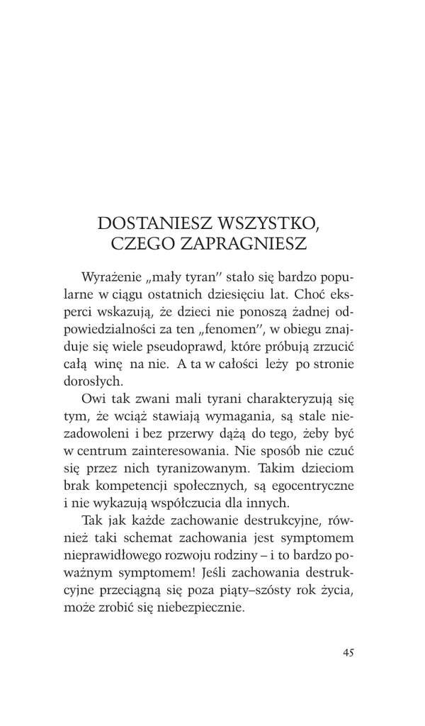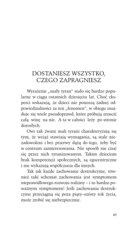 DOSTANIESZ WSZYSTKO, CZEGO ZAPRAGNIESZ Wyrażenie „mały tyran’’ stało się bardzo popularne w ciągu ostatnich dziesięciu lat. Choć eksperci wskazują, że dzieci nie ponoszą żadnej odpowiedzialności za ten „fenomen’’, w obiegu znajduje się wiele pseudoprawd, które próbują zrzucić całą winę na nie. A ta w całości leży po stronie dorosłych. Owi tak zwani mali tyrani charakteryzują się tym, że wciąż stawiają wymagania, są stale niezadowoleni i bez przerwy dążą do tego, żeby być w centrum zainteresowania. Nie sposób nie czuć się przez nich tyranizowanym. Takim dzieciom brak kompetencji społecznych, są egocentryczne i nie wykazują współczucia dla innych. Tak jak każde zachowanie destrukcyjne, również taki schemat zachowania jest symptomem nieprawidłowego rozwoju rodziny – i to bardzo poważnym symptomem! Jeśli zachowania destrukcyjne przeciągną się poza piąty–szósty rok życia, może zrobić się niebezpiecznie. 45 Granice demokracji Takie dzieci spotkamy często w rodzinach, którym pozornie trudno cokolwiek zarzucić, a rodzice są świadomi swojej roli wychowawczej i wiele się nad nią zastanawiają. Ogólnie rzecz biorąc, przyczyn tego zjawiska można szukać w nieszczęsnej tendencji do upraszczania skomplikowanych problemów. Jest tak, gdy nowe idee torują sobie drogę w społeczeństwie albo gdy specjaliści dzielą się nowymi odkryciami z opinią publiczną. W ostatnich latach rozpowszechnił się pogląd, że dzieci mają prawo znać uzasadnienie decyzji rodziców. Ta zasada zrodziła się w pokoleniu, które zostało wychowane za pomocą rozkazów i posłuszeństwa – i słusznie czuło brak uzasadnienia dla tego typu wychowania. Była to zatem dobrze pomyślana idea, która jednak – jak wiele innych dobrze pomyślanych idei – uległa trywializacji. Skutki nie dały na siebie długo czekać: kilka lat później pojawiły się hordy dzieci, które były niemalże uzależnione od uzasadnień. Niezależnie od tego, co się do nich mówiło, pytały ciągle: a dlaczego? – i można było mieć pewność, że odpowiedź ich wcale nie interesuje lub że użyją jej przeciw swoim rodzicom. Powyższa zasada była także wypaczana przez rodziców, którzy manipulowali dziećmi, podając im takie lub inne uzasadnienia swoich decyzji. Podobnie pozytywna idea leży u podstaw zjawiska „małych tyranów’’. W zamierzeniu chodziło o to, aby dać dzieciom pewien wpływ na ich 46 własną sytuację. Dzieci miały przestać być przymuszane, a rodzice mieli zrezygnować z roli dyktatora. Problem polega jednak na tym, że niestety rzeczywistość wygląda zupełnie inaczej: dzieci stały się dyktatorami i odmawiają rodzicom prawa do podejmowania decyzji. Przykład: ostatnio miałem przyjemność rozmawiać z rodzicami dziecka-tyrana. Chodziło o dwuipółletnią dziewczynkę, która nie pozwalała odetchnąć swojej rodzinie. Najlepszym tego dowodem były śniadania, przy których miała do dyspozycji trzynaście różnych potraw, a jednak żadna jej nie odpowiadała. Wolałaby pewnie mieć czternaście zupełnie innych. Podobny dramat rozgrywał się w czasie pozostałych posiłków i przy różnych innych okazjach. Oboje rodzice byli dobrze wykształceni i na szczęście nie stracili przy tym wszystkim poczucia humoru. Uznali jednak, że sytuacja w domu staje się powoli nie do zniesienia. Byli przekonani, że dziecko powinno się traktować dokładnie tak samo jak innych ludzi. A ponieważ cieszyli się dobrą sytuacją finansową i dysponowali sporymi rezerwami uczuć, od początku zdecydowali, że nie pozwolą, aby ich córce czegokolwiek brakowało. Znamy więcej przykładów z przeszłości, kiedy dochodziło do przedziwnego zjawiska działań wychowawczych wywołujących skutki odwrotne do zamierzonych. W latach trzydziestych dwudziestego wieku zauważono, że dzieci, które są stale krytykowane przez rodziców i innych dorosłych, tracą wiarę w siebie – z czego wyciągnięto wnio47 sek, że dzieci powinno się stale chwalić. Przeoczono jednak fakt, że dzieci tak samo mogą cierpieć z powodu nadmiaru pochwał, jak i z nadmiaru krytyki. W dyskusji na temat właściwego wychowania często wpadano w pułapkę polaryzacji stanowisk i myślenia dychotomicznego – tak jakby były tylko dwie możliwości: czerń i biel. Dzieci współdziałają Wiele artykułów na temat wychowania traktuje o dziecięcej zdolności i woli do współdziałania. Dzieci współdziałają – to znaczy: naśladują w swoim działaniu i myśleniu dorosłych. To naśladowanie może być proste albo odwrotne. Dziecko, które stale styka się z przemocą w domu, może te zachowania naśladować, kierując swoją agresję na zewnątrz, ale może też kierować ją przeciw sobie, przejawiając tak zwane zachowania autodestrukcyjne. Współdziałanie może też mieć klasyczny charakter, kiedy dziecko swoim zachowaniem wprost informuje rodziców, co robią źle i co powinni zmienić. Dotyczy to na przykład dorosłych, którzy pozwalają się tyranizować. Przekładając to na nasz język, zachowanie dzieci mówi coś takiego: – Wiem, że chcecie dla mnie jak najlepiej i staracie się, żebym było szczęśliwe i zadowolone. Ale dajecie mi nie to, co trzeba, dlatego wciąż jestem niezadowolone i roszczeniowe. Nie dlatego, że dostaję za dużo tego, co dobre, tylko dlatego, że dostaję za dużo tego, co niepotrzebne. W moim 48 wieku nie wiem jeszcze, co jest dla mnie dobre, a co złe – a w każdym razie nie potrafię tego wyrazić słowami. Wie to jednak mój organizm, dlatego jestem zadowolone i szczęśliwe, kiedy dostaję to, co dla mnie dobre, i niezadowolone, kiedy dostaję to, co dla mnie złe. To wszystko dzieje się jednak poza moją świadomością. Moje reakcje są niezależne ode mnie i mogę mieć jedynie nadzieję, że będziecie potrafili je właściwie zinterpretować i zrozumiecie, co między nami jest nie w porzą