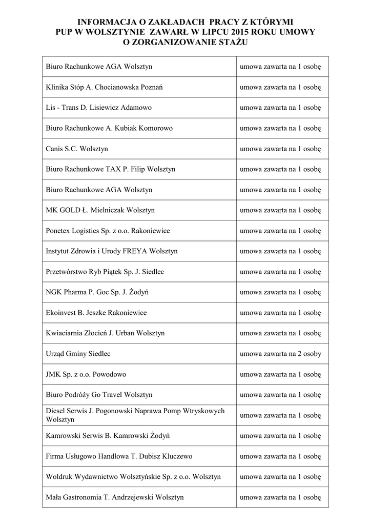 INFORMACJA O ZAKŁADACH PRACY Z KTÓRYMI PUP W WOLSZTYNIE ZAWARŁ W LIPCU 2015 ROKU UMOWY O ZORGANIZOWANIE STAŻU Biuro Rachunkowe AGA Wolsztyn umowa zawarta na 1 osobę Klinika Stóp A. Chocianowska Poznań umowa zawarta na 1 osobę Lis - Trans D. Lisiewicz Adamowo umowa zawarta na 1 osobę Biuro Rachunkowe A. Kubiak Komorowo umowa zawarta na 1 osobę Canis S.C. Wolsztyn umowa zawarta na 1 osobę Biuro Rachunkowe TAX P. Filip Wolsztyn umowa zawarta na 1 osobę Biuro Rachunkowe AGA Wolsztyn umowa zawarta na 1 osobę MK GOLD Ł. Mielniczak Wolsztyn umowa zawarta na 1 osobę Ponetex Logistics Sp. z o.o. Rakoniewice umowa zawarta na 1 osobę Instytut Zdrowia i Urody FREYA Wolsztyn umowa zawarta na 1 osobę Przetwórstwo Ryb Piątek Sp. J. Siedlec umowa zawarta na 1 osobę NGK Pharma P. Goc Sp. J. Żodyń umowa zawarta na 1 osobę Ekoinvest B. Jeszke Rakoniewice umowa zawarta na 1 osobę Kwiaciarnia Złocień J. Urban Wolsztyn umowa zawarta na 1 osobę Urząd Gminy Siedlec umowa zawarta na 2 osoby JMK Sp. z o.o. Powodowo umowa zawarta na 1 osobę Biuro Podróży Go Travel Wolsztyn umowa zawarta na 1 osobę Diesel Serwis J. Pogonowski Naprawa Pomp Wtryskowych Wolsztyn umowa zawarta na 1 osobę Kamrowski Serwis B. Kamrowski Żodyń umowa zawarta na 1 osobę Firma Usługowo Handlowa T. Dubisz Kluczewo umowa zawarta na 1 osobę Woldruk Wydawnictwo Wolsztyńskie Sp. z o.o. Wolsztyn umowa zawarta na 1 osobę Mała Gastronomia T. Andrzejewski Wolsztyn umowa zawarta na 1 osobę Spedco I. Wojtkowiak Wolsztyn umowa zawarta na 1 osobę Przychodnia na Wodnej Gabinet Stomatologiczny lek. stom. J. Dziedziejko – Firlej Wolsztyn umowa zawarta na 1 osobę ARiMR Wolsztyn umowa zawarta na 2 osoby Rachbud S.C. Bucz umowa zawarta na 1 osobę PUP Wolsztyn umowa zawarta na 1 osobę Starostwo Powiatowe Wolsztyn umowa zawarta na 2 osoby Biuro Rachunkowe K. Szafrańska Wolsztyn umowa zawarta na 1 osobę INFORMACJA O ZAKŁADACH PRACY Z KTÓRYMI PUP W WOLSZTYNIE ZAWARŁ W LIPCU 2015 ROKU UMOWY O PRACE INTERWENCYJNE Związek Międzygminny OBRA Berzyna umowa zawarta na 1 osobę Zakład Ogólnobudowlany M. Klecha Przemęt umowa zawarta na 1 osobę Starostwo Powiatowe Wolsztyn umowa zawarta na 2osoby