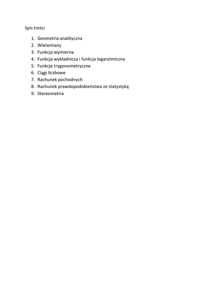 Spis treści 1. 2. 3. 4. 5. 6. 7. 8. 9. Geometria analityczna Wielomiany Funkcja wymierna Funkcja wykładnicza i funkcja logarytmiczna Funkcje trygonometryczne Ciągi liczbowe Rachunek pochodnych Rachunek prawdopodobieństwa ze statystyką Stereometria