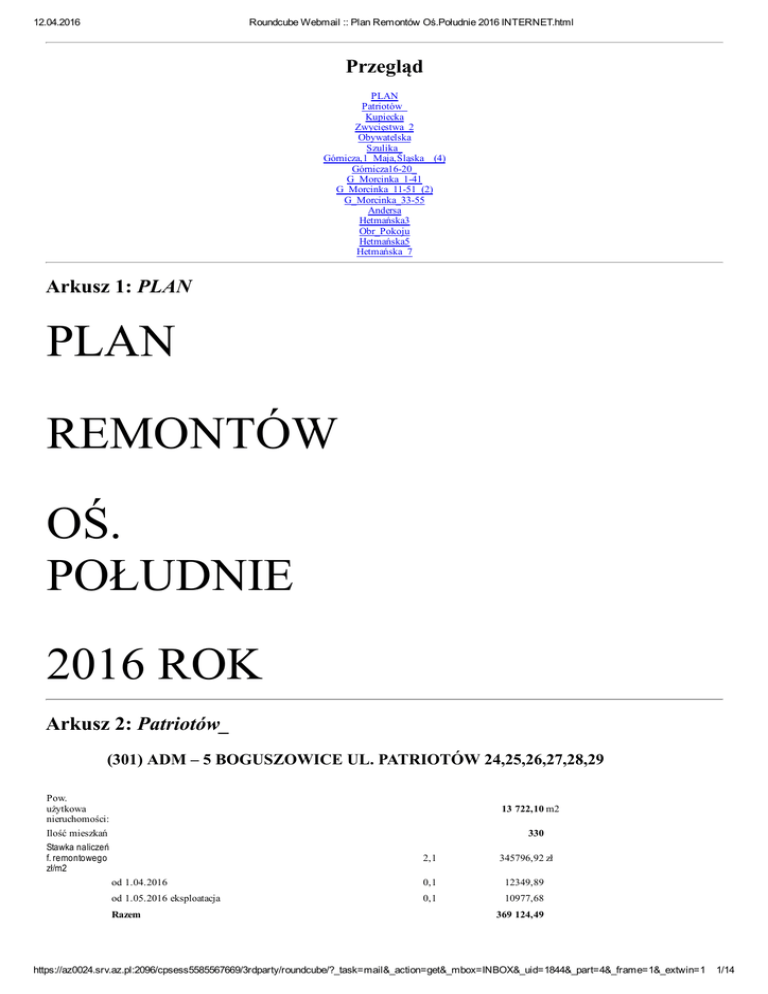 12.04.2016 Roundcube Webmail :: Plan Remontów Oś.Południe 2016 INTERNET.html Przegląd PLAN Patriotów_ Kupiecka Zwycięstwa_2 Obywatelska Szulika_ Górnicza,1_Maja,Śląska__(4) Górnicza1620_ G_Morcinka_141 G_Morcinka_1151_(2) G_Morcinka_3355 Andersa Hetmańska3 Obr_Pokoju Hetmańska5 Hetmańska_7 Arkusz 1: PLAN PLAN REMONTÓW OŚ. POŁUDNIE 2016 ROK Arkusz 2: Patriotów_ (301) ADM – 5 BOGUSZOWICE UL. PATRIOTÓW 24,25,26,27,28,29 Pow. użytkowa nieruchomości: Ilość mieszkań Stawka naliczeń f. remontowego zł/m2 13 722,10 m2 330 2,1 345796,92 zł od 1.04.2016 0,1 12349,89 od 1.05.2016 eksploatacja 0,1 Razem 10977,68 369 124,49 https://az0024.srv.az.pl:2096/cpsess5585567669/3rdparty/roundcube/?_task=mail&_action=get&_mbox=INBOX&_uid=1844&_part=4&_frame=1&_extwin=1 1/14 12.04.2016 Roundcube Webmail :: Plan Remontów Oś.Południe 2016 INTERNET.html Bilans zamknięcia 2015/BO 2016 109 427,00 zł 369 124,49 zł/ rok Naliczenia RAZEM: Lp 478 551,49 zł Rodzaj robót BO Naliczenia Przychody do dyspozycji Lokalizacja PLAN 109 427 369 124 478 551 WYKONANIE 1 Wykonawstwo własne 60 000 2 Remont pieców 10 000 3 Docieplenie ścian 350 000 4 Docieplenie ścian Uchwała Zarządu Nr 1/03/2016 Patriotów 28 z dnia 22.01.2016 5 Remont domofonów Patriotów 29 1 000 6 Remont instalacji odgromowej Patriotów 29 9 000 7 Projekt na docieplenie Patriotów 28 2 500 8 Roboty awaryjne Patriotów 29 Razem 432 500 Zadłużenie nieruchomości 301 z tytułu opłaty eksploatacyjnej potocznie „czynszu” na dzień 31.12.2015 r wynosi 91 406,54 zł Arkusz 3: Kupiecka (302) ADM – 10 CHWAŁOWCE UL. KUPIECKA 14,14A,16 Pow. użytkowa nieruchomości: 9 871,20 m2 Ilość mieszkań 180 Stawka naliczeń f. remontowego 2,20 Od 1.04.2016 0,2 Razem 17 768,16 278 367,84 Bilans zamknięcia 2015/BO 2016 Fundusz remont. Naliczenia: 137 324,00 zł. 278 367,84 zł/ rok Razem Lp 260599,68 zł 141 043,84 Rodzaj robót BO Naliczenia Przychody do dyspozycji Lokalizacja plan 137 324 278 368 wykonanie 141 044 https://az0024.srv.az.pl:2096/cpsess5585567669/3rdparty/roundcube/?_task=mail&_action=get&_mbox=INBOX&_uid=1844&_part=4&_frame=1&_extwin=1 2/14 12.04.2016 Roundcube Webmail :: Plan Remontów Oś.Południe 2016 INTERNET.html 1. 56 000 Wykonawstwo własne 2 Wymiana drzwi zewnętrznych Kupiecka 16 26 000 3 Projekt na docieplenie Kupiecka 14 3 000 4 Roboty awaryjne Razem 85 000 Zadłużenie na nieruchomości 302 z tytułu opłaty eksploatacyjnej potocznie „czynszu” na dzień 31.12.2015 r. wynosi 104 693,59 zł Arkusz 4: Zwycięstwa_2 (303) ADM – 10 CHWAŁOWICE UL. ZWYCIĘSTWA 2 Pow. użytkowa nieruchomości: Ilość mieszkań Naliczenia f. remontowego 1 193,92 m2 24 2,20 Od 1.04.2016 Razem Bilans zamknięcia 2015/BO 2016 0,3 31 519,49 3223,58 34743,07 10 459,00 zł. https://az0024.srv.az.pl:2096/cpsess5585567669/3rdparty/roundcube/?_task=mail&_action=get&_mbox=INBOX&_uid=1844&_part=4&_frame=1&_extwin=1 3/14 12.04.2016 Roundcube Webmail :: Plan Remontów Oś.Południe 2016 INTERNET.html Fundusz remontowy naliczenia: 34 743,07 zł/ rok Razem Lp 24 284,07 Rodzaj robót BO Naliczenia Przychody do dyspozycji 1 Wykonawstwo własne 2 Remont pieców 3 Projekt na docieplenie 4 Roboty awaryjne plan 10 459 34 743 24 284 6 000 1 000 wykonanie 2 000 Razem 9 000 Zadłużenie nieruchomości 303 z tytułu opłaty eksploatacyjnej potocznie „czynszu” na dzień 31.12.2015 r. wynosi 6 570,22 zł Arkusz 5: Obywatelska ( 304) ADM – 10 CHWAŁOWICE UL. OBYWATELSKA 1,3,5,7,9 Pow. użytkowa nieruchomości: Ilość mieszkań 3 959,20 m2 97 Fundusz remontowy naliczenia zł/m2 Pow. Obywatelska 1 4,36 39 940,56 763,39 m2 Obywatelska 3 4,36 43 043,14 822,69 m2 Obywatelska 5 4,36 43 043,14 822,69 m2 Obywatelska 7 4,36 42 119,17 805,03 m2 Obywatelska 9 1,96 18 934,31 805,03 m2 187 080,32 Fundusz pożyczkowy spłata Obywatelska 5 3 29 616,84 822,69 m2 Obywatelska 1 Obywatelska 3 3,68 33 711,30 763,39 m2 3,66 33 513,60 763,06 m2 Obywatelska 7 3,51 33 907,86 805,03 m2 Obywatelska 9 0 0,00 805,03 m2 130 749,60 Bilans zamknięcia 2015/BO 2016 Naliczenia 27 468,00 187 080,32 zł/ rok RAZEM: Lp Rodzaj robót 214 548,32 zł Lokalizacja plan wykonanie https://az0024.srv.az.pl:2096/cpsess5585567669/3rdparty/roundcube/?_task=mail&_action=get&_mbox=INBOX&_uid=1844&_part=4&_frame=1&_extwin=1 4/14 12.04.2016 Roundcube Webmail :: Plan Remontów Oś.Południe 2016 INTERNET.html BO Naliczenia Przychody do dyspozycji 1. Wykonawstwo własne 2 3 4 27 468 187 080 214 548 24 000 Spłata docieplenia Obywatelska 1,3,5,7 131 675,56 Malowanie kl. schod. Obywatelska 1 29 000,00 Roboty awaryjne Razem 184 676 Zadłużenie nieruchomości 304 z tytułu opłaty eksploatacyjnej potocznie „czynszu” na dzień 31.12.2015 r. wynosi 12 492,54 zł Arkusz 6: Szulika_ (305) ADM – 10 CHWAŁOWICE UL. SZULIKA 12,14,16,18 Pow. użytkowa nieruchomości: Ilość mieszkań Stawka naliczeń f. remontowego 1 160,52 m2 24 Od 1.05.2016 eksploatacja 3,46 48 184,79 zł/rok 0,87 8 077 zł/rok Razem 56 262 zł/rok Bilans zamknięcia 2015/BO 2016 Naliczenia 134 574,00 zl. 56 262,01 zł/ rok RAZEM: 78 311,99 zł Lp Rodzaj robót BO Naliczenia Przychody do dyspozycji 1. Wykonawstwo własne 2 Remont pieców 3 Malowanie klatek schodowych 4 Roboty awaryjne Lokalizacja plan 134 574 56 262 78 312 wykonanie 6 000 1 000 Razem Szulika 16,18 22 000 29 000 Zadłużenie nieruchomości 305 z tytułu opłaty eksploatacyjnej potocznie „ czynszu” na dzień 31.12.2015 r. wynosi 8 567,98 zł https://az0024.srv.az.pl:2096/cpsess5585567669/3rdparty/roundcube/?_task=mail&_action=get&_mbox=INBOX&_uid=1844&_part=4&_frame=1&_extwin=1 5/14 12.04.2016 Roundcube Webmail :: Plan Remontów Oś.Południe 2016 INTERNET.html Arkusz 7: Górnicza,1_Maja,Śląska__(4) (306) ADM – 11 CHWAŁOWICE UL. GÓRNICZA 2,6,8,10,14 1MAJA 93 ŚLĄSKA 2,2A Pow. użytkowa nieruchomości: 11 344,75 m2 Ilość mieszkań 271 Stawka naliczeń f. remontowego Stawka naliczeń f. specjalny Od 1.05.2016 eksploatacja 1,8 245 046,60 zł/rok 2,0 272