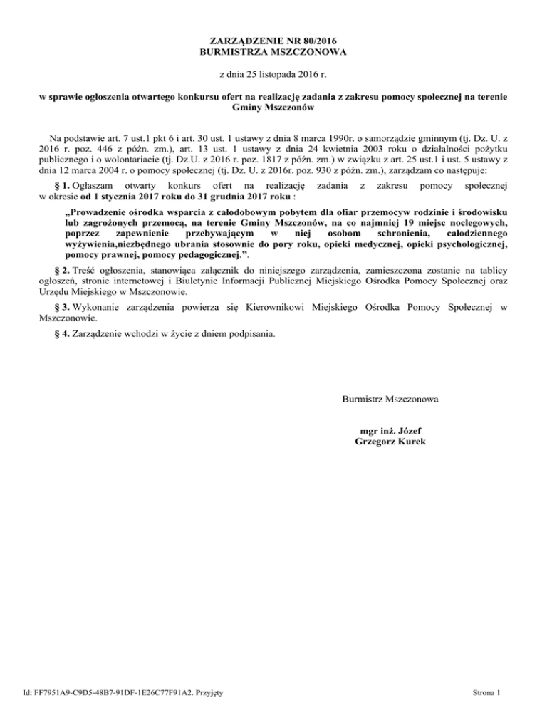 ZARZĄDZENIE NR 80/2016 BURMISTRZA MSZCZONOWA z dnia 25 listopada 2016 r. w sprawie ogłoszenia otwartego konkursu ofert na realizację zadania z zakresu pomocy społecznej na terenie Gminy Mszczonów Na podstawie art. 7 ust.1 pkt 6 i art. 30 ust. 1 ustawy z dnia 8 marca 1990r. o samorządzie gminnym (tj. Dz. U. z 2016 r. poz. 446 z późn. zm.), art. 13 ust. 1 ustawy z dnia 24 kwietnia 2003 roku o działalności pożytku publicznego i o wolontariacie (tj. Dz.U. z 2016 r. poz. 1817 z późn. zm.) w związku z art. 25 ust.1 i ust. 5 ustawy z dnia 12 marca 2004 r. o pomocy społecznej (tj. Dz. U. z 2016r. poz. 930 z późn. zm.), zarządzam co następuje: § 1. Ogłaszam otwarty konkurs ofert na realizację w okresie od 1 stycznia 2017 roku do 31 grudnia 2017 roku : zadania z zakresu pomocy społecznej „Prowadzenie ośrodka wsparcia z całodobowym pobytem dla ofiar przemocyw rodzinie i środowisku lub zagrożonych przemocą, na terenie Gminy Mszczonów, na co najmniej 19 miejsc noclegowych, poprzez zapewnienie przebywającym w niej osobom schronienia, całodziennego wyżywienia,niezbędnego ubrania stosownie do pory roku, opieki medycznej, opieki psychologicznej, pomocy prawnej, pomocy pedagogicznej.”. § 2. Treść ogłoszenia, stanowiąca załącznik do niniejszego zarządzenia, zamieszczona zostanie na tablicy ogłoszeń, stronie internetowej i Biuletynie Informacji Publicznej Miejskiego Ośrodka Pomocy Społecznej oraz Urzędu Miejskiego w Mszczonowie. § 3. Wykonanie zarządzenia powierza się Kierownikowi Miejskiego Ośrodka Pomocy Społecznej w Mszczonowie. § 4. Zarządzenie wchodzi w życie z dniem podpisania. Burmistrz Mszczonowa mgr inż. Józef Grzegorz Kurek Id: FF7951A9-C9D5-48B7-91DF-1E26C77F91A2. Przyjęty Strona 1 Załącznik do Zarządzenia Nr 80/2016 Burmistrza Mszczonowa z dnia 25 listopada 2016 r. Ogłoszenie otwartego konkursu ofert na realizację zadania z zakresu pomocy społecznej na terenie Gminy Mszczonów BURMISTRZ MSZCZONOWA informuje o możliwości przyznania dotacji z Budżetu Gminy Mszczonów na wsparcie realizacji zleconego zadania publicznego z zakresu pomocy społecznej: organizacjom pozarządowym, o których mowa w art. 3 ust. 2 ustawy z dnia 24 kwietnia 2003 roku o działalności pożytku publicznego i o wolontariacie (tj. Dz.U. z 2016 r. poz. 1817 z późn. zm.) oraz podmiotom wymienionym w art. 3 ust. 3 tej ustawy, prowadzącym działalność w zakresie pomocy społecznej, zwanym „podmiotami uprawnionymi”. (Załącznik Nr 1 zawiera informacje o organizacjach pozarządowych i innych organizacjach działalności pożytku publicznego) Na podstawie art. 13 ust. 1 i ust. 2 ustawy z dnia 24 kwietnia 2003 roku o działalności pożytku publicznego i o wolontariacie (tj. Dz.U. z 2016 r. poz. 1817 z późn. zm.) w związkuz art. 25 ustawy z dnia 12 marca 2004 r. o pomocy społecznej (tj. Dz. U. z 2016r. poz. 930 z późn. zm.) Burmistrz Miasta Mszczonowa ogłasza otwarty konkurs ofert na realizację zadania z zakresu pomocy społecznej: I. Rodzaj zadania „Prowadzenie ośrodka wsparcia z całodobowym pobytem dla ofiar przemocyw rodzinie i środowisku lub zagrożonych przemocą, na terenie Gminy Mszczonów, na co najmniej 19 miejsc noclegowych, poprzez zapewnienie przebywającym w niej osobom schronienia, całodziennego wyżywienia, niezbędnego ubrania stosownie do pory roku, opieki medycznej, opieki psychologicznej, pomocy prawnej, pomocy pedagogicznejprzez okresod 1 stycznia 2017r. do 31 grudnia 2017r.” II. Wysokość dotacji Zamawiający przeznacza na realizację całego zadania kwotę 55 000,00zł (słownie: pięćdziesiąt pięć tysięcy złotych). III. Zasady przyznawania dotacji 1. Środki finansowe przekazane w ramach dofinansowania (dotacja) muszą być wydatkowane do dnia określonego w umowie i nie mogą być przeznaczone na pokrycie kosztów poniesionych przed podpisaniem umowy. 2. Środki nie wydane lub wydane niezgodnie z przeznaczeniem podlegają zwrotowi. 3. Dotacje będą przekazywane na podstawie umowy określającej zasady dofinansowania zadania, kontroli jego przebiegu, jak również udokumentowania jego realizacji. Środki będą przyznawane w transzach w miarę wykonywania zadania. 4. Organizacja może złożyć jedną ofertę i otrzymać jedną dotację na realizację zadania. IV. Termin i warunki realizacji zadania 1. Zadanie realizowane będzie w okresie od dnia 01 stycznia 2017 roku do dnia 31 grudnia 2017 roku i polegać będzie na prowadzeniu ośrodka wsparcia z całodobowym pobytem dla ofiar przemocy w rodzinie i środowisku lub zagrożonych przemocą, na terenie Gminy Mszczonów, na co najmniej 19 miejsc noclegowych, poprzez zapewnienie przebywającym w niej osobom schronienia, całodziennego wyżywienia, niezbędnego ubrania stosownie do pory roku, opieki medycznej, opieki psychologicznej, pomocy prawnej, pomocy pedagogicznej. Id: FF7951A9-C9D5-48B7-91DF-1E26C77F91A2. Przyjęty Strona 1 2. Pomiot realizujący zadanie zobowiązany będzie złożyć sprawozdanie z wykonania zadania publicznego. Wzór sprawozdania stanowi załącznik do rozporządzenia Ministra Rodziny, Pracy i Polityki Społecznej w sprawie wzorów ofert i ramowych wzorów umów dotyczących realizacji zadań publicznych oraz wzorów sprawozdań z wykonania tych zadań (Dz.U. z 2016 r. poz. 1300). Wzory sprawozdania dostępne są w siedzibie Miejskiego Ośrodka Pomocy Społecznej w Mszczonowie. Wzór sprawozdania z realizacji zadnia publicznego stanowi Załącznik nr 6. V. Termin składania ofert 1. Oferty należy składać do dnia 22 grudnia 2016r. do godziny 900 w siedzibie Miejskiego Ośrodka Pomocy Społecznej w Mszczonowie: 96 -320 Mszczonów, ul. Grójecka 45. 2.1. Oferta podmiotu uprawnionego powinna zawierać w szczególności: 1) szczegółowy zakres rzeczowy zadania publicznego proponowanego do realizacji, 2) termin i miejsce realizacji zadania publicznego, 3) kalkulację przewidywanych kosztów realizacji zadania publicznego, 4) informację o