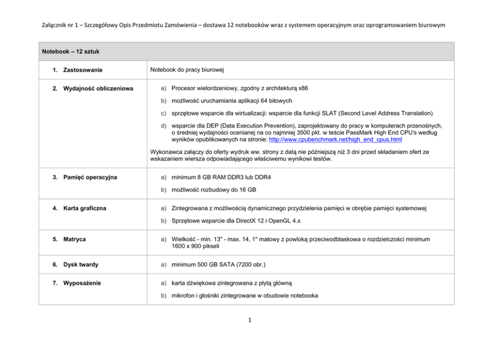 Załącznik nr 1 – Szczegółowy Opis Przedmiotu Zamówienia – dostawa 12 notebooków wraz z systemem operacyjnym oraz oprogramowaniem biurowym Notebook – 12 sztuk 1. Zastosowanie 2. Wydajność obliczeniowa Notebook do pracy biurowej a) Procesor wielordzeniowy, zgodny z architekturą x86 b) możliwość uruchamiania aplikacji 64 bitowych c) sprzętowe wsparcie dla wirtualizacji: wsparcie dla funkcji SLAT (Second Level Address Translation) d) wsparcie dla DEP (Data Execution Prevention), zaprojektowany do pracy w komputerach przenośnych, o średniej wydajności ocenianej na co najmniej 3500 pkt. w teście PassMark High End CPU's według wyników opublikowanych na stronie: http://www.cpubenchmark.net/high_end_cpus.html Wykonawca załączy do oferty wydruk ww. strony z datą nie późniejszą niż 3 dni przed składaniem ofert ze wskazaniem wiersza odpowiadającego właściwemu wynikowi testów. 3. Pamięć operacyjna a) minimum 8 GB RAM DDR3 lub DDR4 b) możliwość rozbudowy do 16 GB 4. Karta graficzna a) Zintegrowana z możliwością dynamicznego przydzielenia pamięci w obrębie pamięci systemowej b) Sprzętowe wsparcie dla DirectX 12 i OpenGL 4.x 5. Matryca a) Wielkość - min. 13" - max. 14, 1" matowy z powloką przeciwodblaskowa o rozdzielczości minimum 1600 x 900 pikseli 6. Dysk twardy a) minimum 500 GB SATA (7200 obr.) 7. Wyposażenie a) karta dźwiękowa zintegrowana z płytą główną b) mikrofon i głośniki zintegrowane w obudowie notebooka 1 c) zintegrowana karta sieciowa Gigabit Ethernet RJ 45 d) zintegrowana w obudowie karta WiFi IEEE 802.11ac/b/g/n e) zintegrowany w obudowie Bluetooth f) nagrywarka DVD +/-RW zewnętrzna na USB wraz z oprogramowaniem do nagrywania płyt g) touchpad lub trackPoint h) myszka laserowa, bezprzewodowa, 2 przyciski z rolką, i) port umożliwiający połączenie komputer-monitor (złącze 1 x VGA lub 1 x HDMI lub 1 x Display Port) j) co najmniej 3 złącza USB w obudowie notebooka w tym min 2 x USB 3.0 k) porty audio: wejście na mikrofon, wyjście na słuchawki l) 8. Bateria oraz zasilanie torba na notebook, akcesoria i dokumenty, wykonana z materiału wodoodpornego, posiadająca wzmocnienia zabezpieczające notebook przed uderzeniami, posiadająca oddzielną przegrodę na dokumenty i akcesoria, wyposażona w pasek na ramię a) Li-Ion lub litowo-polimerowa o pojemności minimum 45Wh b) zewnętrzny zasilacz 230V 50Hz 9. Waga a) nie więcej niż 2,4 kg z baterią 10. BIOS a) BIOS typu FLASH EPROM posiadający procedury oszczędzania energii i zapewniający mechanizm plug&play producenta sprzętu, b) BIOS zawierający niezamazywaną informację o producencie, modelu i numerze seryjnym c) BIOS umożliwiający realizację poniższych funkcji bez konieczności uruchamiania systemu operacyjnego z dysku twardego komputera lub innych podłączonych do niego urządzeń zewnętrznych: • kontrola sekwencji BOOT-owania, 2 11. System operacyjny (do każdego z notebooków) • start systemu z urządzenia USB, • blokowanie/odblokowanie BOOT-owania notebooka z dysku twardego, zewnętrznych urządzeń oraz sieci, • ustawienia hasła na poziomie administratora, • wyłączenie/włączenie: zintegrowanej karty sieciowej, portów USB, funkcjonalności ładowania zewnętrznych urządzeń przez port USB. czytnika kart SD • automatyczny update BIOS przez sieć, • system diagnostyczny z graficznym interfejsem użytkownika umożliwiający: odczyt informacji o procesorze, rozmiarze i szybkości pamięci RAM, modelu i wersja firmware dysku twardego, wersji i dacie wydania BIOS, oraz przetestowanie komponentów notebooka, w tym co najmniej: procesora, pamięci RAM, płyty głównej, dysku twardego, karty sieciowej, karty graficznej, a) Microsoft Windows 10 Professional PL 64-bit z licencją i nośnikiem (z prawem do instalacji Windows 8.1 Pro) w celu zapewnienia współpracy ze środowiskiem sieciowym oraz aplikacjami funkcjonującymi w administracji państwowej. b) nie dopuszcza się w tym zakresie licencji pochodzących z rynku wtórnego c) na obudowie notebooka Certyfikat Autentyczności w postaci specjalnej naklejki zabezpieczającej. 12. Oprogramowanie biurowe (do każdego z notebooków) a) rozbudowa licencji w ramach Licencji Open: 66467339 OPEN 96473623ZZG1802 o 12 licencji na produkt MS Office Professional Plus 2016 PL b) lub odrębna licencja MOLP na 12 stanowisk na produkt MS Office Professional Plus 2016 PL c) lub licencja na 12 stanowisk na produkt równoważny 13. Standardy i certyfikaty a) deklaracja zgodności CE dla oferowanego modelu notebooka b) notebook musi spełniać wymogi normy Energy Star 5.x lub nowsze. Wymagany certyfikat lub wpis dotyczący oferowanego modelu notebooka w internetowym katalogu http://www.eu-energystar.org (wydruk ze strony internetowej) 3 c) oferowany model notebooka musi posiadać certyfikat Microsoft, potwierdzający poprawną współpracę z oferowanym systemem operacyjnym (załączyć wydruk ze strony Microsoft WHCL) 14. Gwarancja oraz serwis a) minimum 3-letnia gwarancja producenta na notebook oraz minimum 1 rok gwarancji producenta na baterię liczone od daty dostawy, świadczone w miejscu instalacji notebooka. b) usunięcie awarii - 3 dni robocze po otrzymaniu zgłoszenia (przyjmowanie zgłoszeń w dni robocze w godzinach 8.00-16.00 telefonicznie lub e-mail), w przypadku braku możliwości naprawy w w/w terminie podstawienie sprzętu zastępczego o nie gorszych parametrach technicznych, c) w przypadku awarii nośników danych w okresie gwarancji takich jak dyski twarde itp., pozostają one u Zamawiającego. d) serwis urządzeń realizowany przez producenta lub autoryzowanego partnera serwisowego 15. Termin Dostawy Grudzień 2016 r. 4