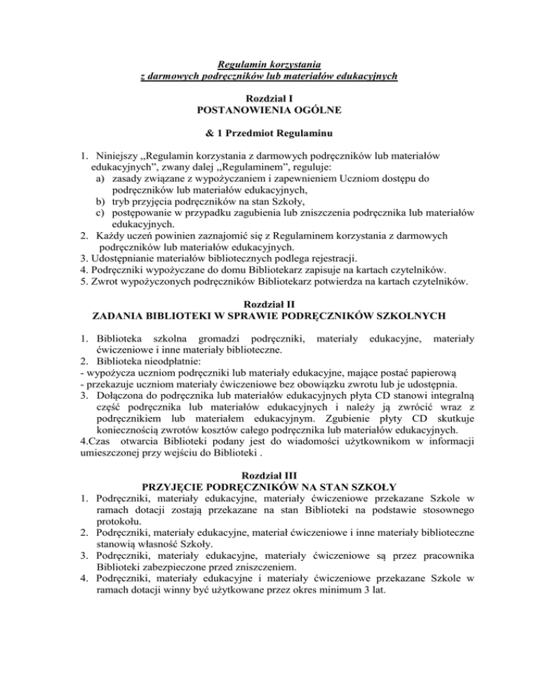 Regulamin korzystania z darmowych podręczników lub materiałów edukacyjnych Rozdział I POSTANOWIENIA OGÓLNE & 1 Przedmiot Regulaminu 1. Niniejszy ,,Regulamin korzystania z darmowych podręczników lub materiałów edukacyjnych”, zwany dalej ,,Regulaminem”, reguluje: a) zasady związane z wypożyczaniem i zapewnieniem Uczniom dostępu do podręczników lub materiałów edukacyjnych, b) tryb przyjęcia podręczników na stan Szkoły, c) postępowanie w przypadku zagubienia lub zniszczenia podręcznika lub materiałów edukacyjnych. 2. Każdy uczeń powinien zaznajomić się z Regulaminem korzystania z darmowych podręczników lub materiałów edukacyjnych. 3. Udostępnianie materiałów bibliotecznych podlega rejestracji. 4. Podręczniki wypożyczane do domu Bibliotekarz zapisuje na kartach czytelników. 5. Zwrot wypożyczonych podręczników Bibliotekarz potwierdza na kartach czytelników. Rozdział II ZADANIA BIBLIOTEKI W SPRAWIE PODRĘCZNIKÓW SZKOLNYCH 1. Biblioteka szkolna gromadzi podręczniki, materiały edukacyjne, materiały ćwiczeniowe i inne materiały biblioteczne. 2. Biblioteka nieodpłatnie: - wypożycza uczniom podręczniki lub materiały edukacyjne, mające postać papierową - przekazuje uczniom materiały ćwiczeniowe bez obowiązku zwrotu lub je udostępnia. 3. Dołączona do podręcznika lub materiałów edukacyjnych płyta CD stanowi integralną część podręcznika lub materiałów edukacyjnych i należy ją zwrócić wraz z podręcznikiem lub materiałem edukacyjnym. Zgubienie płyty CD skutkuje koniecznością zwrotów kosztów całego podręcznika lub materiałów edukacyjnych. 4.Czas otwarcia Biblioteki podany jest do wiadomości użytkownikom w informacji umieszczonej przy wejściu do Biblioteki . 1. 2. 3. 4. Rozdział III PRZYJĘCIE PODRĘCZNIKÓW NA STAN SZKOŁY Podręczniki, materiały edukacyjne, materiały ćwiczeniowe przekazane Szkole w ramach dotacji zostają przekazane na stan Biblioteki na podstawie stosownego protokołu. Podręczniki, materiały edukacyjne, materiał ćwiczeniowe i inne materiały biblioteczne stanowią własność Szkoły. Podręczniki, materiały edukacyjne, materiały ćwiczeniowe są przez pracownika Biblioteki zabezpieczone przed zniszczeniem. Podręczniki, materiały edukacyjne i materiały ćwiczeniowe przekazane Szkole w ramach dotacji winny być użytkowane przez okres minimum 3 lat. Rozdział IV UDOSTĘPNIANIE ZBIORÓW &1 Użytkownicy podręczników szkolnych 1. Do wypożyczania podręczników lub materiałów edukacyjnych uprawnieni są wszyscy uczniowie Szkoły , którzy rozpoczęli naukę w klasie I w roku szkolnym 2014/2015 oraz z klasy IV Szkoły Podstawowej i klasy I Gimnazjum w roku szkolny 2015/2016 lub później. 2. Użytkownicy Biblioteki przed rozpoczęciem korzystania ze zbiorów podlegają rejestracji. 3. Uczniowie są rejestrowani na podstawie dostarczonych do Biblioteki list zgodnych z listą klasy zamieszczoną w dzienniku lekcyjnym. 4. Rejestracja następuje najpóźniej do dnia 10 września danego roku szkolnego. &2 Okres trwania wypożyczenia 1. Wypożyczenie odbywa się na początku każdego roku szkolnego – najpóźniej do dnia 15 września danego roku szkolnego. 2. Podręczniki wypożyczane są na okres 10 miesięcy, termin ich zwrotu mija w ostatnim tygodniu nauki w bieżącym roku szkolnym. 3. Szczegółowe zasady wypożyczania określa procedura, o której mowa w &3 Regulaminu. 4. Biblioteka w uzasadnionych okolicznościach ma prawo zażądać zwrotu wypożyczonych materiałów przed upływem ustalonego terminu. 5. Zwrot podręcznika warunkuje uzyskanie wpisu na karcie czytelnika, Świadczącego o rozliczeniu się ucznia z biblioteką szkolną. &3 Procedura wypożyczania podręcznika 1. Na początku roku szkolnego wychowawca klasy z uczniami na podstawie stosownego protokołu, którego wzór stanowi załącznik nr 1 do Regulaminu, pobiera z Biblioteki podręczniki lub materiały edukacyjne w liczbie równej liczbie uczniów swojej klasy. 2. Wraz z pobraniem podręczników lub materiałów edukacyjnych wychowawca klasy ma obowiązek przygotować odpowiednią ilość egzemplarzy Umowy użyczenia podręcznika rodzicom ucznia – której wzór stanowi załącznik nr 2 do Regulaminu. Każda umowa użyczenia, o której mowa w ust. 2, musi być przygotowana w 2 egzemplarzach. 3. Wraz z przekazaniem podręcznika lub materiałów edukacyjnych wychowawca ma obowiązek odebrać podpisany przez rodzica egzemplarz umowy, o którym mowa w ust. 2 i przekazać go Bibliotece. 4. Wychowawca ma obowiązek poinformować rodziców, aby przed wypożyczeniem sprawdzili stan podręcznika lub materiałów edukacyjnych, a ewentualne uszkodzenia natychmiast zgłosić wychowawcy. &4 Zmiana Szkoły 1. Uczeń, który w trakcie roku szkolnego, z powodów losowych, rezygnuje z edukacji w Szkole, zobowiązany jest zwrócić otrzymany podręcznik lub materiały edukacyjne. 2. W tym momencie przestaje obowiązywać Umowa użyczenia, co potwierdza Bibliotekarz, wydając Rodzicowi stosowne potwierdzenie. 3. W przypadku niemożności zwrotu otrzymanego podręcznika lub materiałów edukacyjnych zastosowanie ma rozdział V niniejszego Regulaminu. Rozdział V ODPOWIEDZIALNOŚĆ ZA UDOSTEPNIONE PODRĘCZNIKI &1 Obowiązki Ucznia związane z wypożyczeniem 1. Przez cały okres użytkowania podręczników Uczeń dba o właściwe i czyste obłożenie książki. 2. Uczeń ma obowiązek na bieżąco dokonywać drobnych napraw czy ewentualnej wymiany okładki. 3. Zabrania się dokonywania jakichkolwiek wpisów i notatek w podręcznikach. 4. Dopuszcza się używania ołówka w celu zaznaczenia (np. pracy domowej). 5. Wraz z upływem terminu zwrotu (koniec roku szkolnego) Uczeń powinien uporządkować podręczniki, tj. powycierać wszystkie wpisy ołówka, podkleić, obłożyć w nową okładkę, jeśli wcześniejsza ulegnie zniszczeniu, a następnie oddać do biblioteki szkolnej wszystkie wypożyczone podręczniki wraz z ich dodatkowym