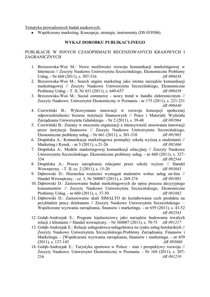 Tematyka prowadzonych badań naukowych: Współczesny marketing. Koncepcje, strategie, instrumenty (DS 019506). WYKAZ DOROBKU PUBLIKACYJNEGO PUBLIKACJE W INNYCH CZASOPISMACH RECENZOWANYCH KRAJOWYCH I ZAGRANICZNYCH 1. Brzozowska-Woś M.: Nowe możliwości rozwoju komunikacji marketingowej w Internecie // Zeszyty Naukowe Uniwersytetu Szczecińskiego, Ekonomiczne Problemy Usług. - Nr 660 (2011), s. 307-316 AR 090438 2. Brzozowska-Woś M.: Search engine marketing jako istotne narzędzie komunikacji marketingowej // Zeszyty Naukowe Uniwersytetu Szczecińskiego, Ekonomiczne Problemy Usług. - T. II, Nr 651 (2011), s. 649-657 AR 090439 3. Brzozowska-Woś M.: Social commerce - nowy trend w handlu elektronicznym // Zeszyty Naukowe. Uniwersytet Ekonomiczny w Poznaniu - nr 175 (2011), s. 221-231 AR 090440 4. Czerwiński B.: Wykorzystanie innowacji w rozwoju koncepcji społecznej odpowiedzialności biznesu instytucji finansowych // Prace i Materiały Wydziału Zarządzania Uniwersytetu Gdańskiego. - Nr 2 (2011), s. 39-48 AR 091964 5. Czerwiński B.: Zmiany w otoczeniu organizacji a intensywność stosowania innowacji przez instytucje finansowe // Zeszyty Naukowe Uniwersytetu Szczecińskiego, Ekonomiczne problemy usług. - Nr 661 (2011), s. 301-310 AR 091965 6. Drapińska A.: Komunikacja marketingowa pomiędzy szkołą wyższą a studentami // Marketing i Rynek. - nr 5 (2011), s.21-26 AR 092466 7. Drapińska A.: Modele marketingowej komunikacji relacyjnej // Zeszyty Naukowe Uniwersytetu Szczecińskiego. Ekonomiczne problemy usług. - nr 660 (2011), s. 327334 AR 092544 8. Drapińska A.: Proces zarządzania relacjami przez szkoły wyższe // Handel Wewnętrzny. - T. II, cz. 2 (2011), s. 15-20 AR 093043 9. Dąbrowski D.: Hierarchia ważności wymagań studentów wobec usług on-line // Handel Wewnętrzny. - cz. 3, Nr 360007 (2011), s. 269-274 AR 091081 10. Dąbrowski D.: Zastosowanie badań marketingowych do opisu procesu decyzyjnego konsumentów // Zeszyty Naukowe Uniwersytetu Szczecińskiego, Ekonomiczne Problemy Usług. - nr 660 (2011), s. 37-50 AR 091082 11. Dąbrowski D.: Zastosowanie skali SIMALTO do kształtowania cech produktu na przykładzie pracy dziekanatu // Zeszyty Naukowe Uniwersytetu Szczecińskiego. – Współczesne wyzwania zarządzania, finansów i marketingu. - nr 659 (2011), s. 43-52 AR 092543 12. Gołąb-Andrzejak E.: Program lojalnościowy jako narzędzie budowania trwałych relacji z klientami // Handel wewnętrzny. - Nr 360007 (2011), s. 70-75 AR 091217 13. Gołąb-Andrzejak E.: Relacje usługodawca-usługobiorca na rynku usług hotelarskich // Zeszyty Naukowe Uniwersytetu Szczecińskiego.Problemy Zarządzania, Finansów i Marketingu. - [Współczesne wyzwania zarządzania, finansów i marketingu. - nr 659 (2011), s. 137-145 AR 093060 14. Gołąb-Andrzejak E.: Turystyka sportowa w Polsce - stan i perspektywy rozwoju // Zeszyty Naukowe. Uniwersytet Ekonomiczny w Poznaniu. - Nr 168 (2011), s. 207216 AR 091219 15. Gołąb-Andrzejak E.: Zachowania młodych konsumentów usług edukacyjnych // Zeszyty Naukowe Uniwersytetu Szczecińskiego, Ekonomiczne Problemy Usług. - nr 660 (2011), s. 481-489 AR 091218 MONOGRAFIE NAUKOWE W JĘZYKU POLSKIM 1. Drapińska A.: Zarządzanie relacjami na rynku usług edukacyjnych szkół wyższych. A. Drapińska. Warszawa: Wydawnictwo Naukowe PWN, 2011. 1-312 s. ISBN 978-8301- 16585-7 MK 092477 2. Koszałka J.: Monitoring zapotrzebowania na usługi i kształtowanie oferty ośrodka innowacji. Gdańsk: Polska Agencja Rozwoju Przedsiębiorczości, 2011. 1-103 s. ISBN 978-83-7633- 022-8 MK 091143 3. Koszałka J., Sluismans R.: Doradztwo dla strategii rozwoju innowacyjnego w MSP. Gdańsk / Blizen: Polska Agencja Rozwoju Przedsiębiorczości, 2011. 1-75 s. ISBN 978-83-7633-087- 7 MK 091142 ROZDZIAŁY W MONOGRAFIACH NAUKOWYCH W JĘZYKU POLSKIM 1. Jettmar J., Koszałka J., Klajbor T.: Scenariusz rozwoju dla obszaru Innowacyjne surowce, innowacyjne produkty // W: Żywność i żywienie w XXI wieku. Scenariusze rozwoju polskiego sektora rolno-spożywczego / eds. Lech Michalczuk. Łódź: Społeczna Wyższa Szkoła Przedsiębiorczości i Zarządzania w Łodzi, 2011, s. 18 stron [45-62] MCK 091138 2. Klajbor T., Koszałka J.: Scenariusz rozwoju dla obszaru Zarządzanie procesem produkcji, dystrybucji i marketing // W: Żywność i żywienie w XXI wieku. Scenariusze rozwoju polskiego sektora rolno-spożywczego / ed. Lech Michalczuk. Łódź: Społeczna Wyższa Szkoła Przedsiębiorczości i Zarządzania w Łodzi, 2011, s. 14 stron [112-125] MCK 091141 3. Koszałka J.: Scenariusz rozwoju dla obszaru Innowacyjne opakowania // W: Żywność i żywienie w XXI wieku. Scenariusze rozwoju polskiego sektora rolno-spożywczego / ed. Lech Michalczuk. Łódź: Społeczna Wyższa Szkoła Przedsiębiorczości i Zarządzania w Łodzi, 2011, s. 21 stron [63-83] MCK 091139 4. Koszałka J., Klepka M.: Scenariusz rozwoju dla obszaru Bezpieczeństwo żywności // W: Żywność i żywienie w XXI wieku. Scenariusze rozwoju polskiego sektora rolnospożywczego / ed. Lech Michalczuk. Łódź: Społeczna Wyższa Szkoła Przedsiębiorczości i Zarządzania w Łodzi, 2011, s. 15 stron [97-111] MCK 091140 WYMIANA MIĘDZYNARODOWA 3 miesięczny staż badawczy (10.10.2011 - 12.01.2012) doktorantki z Rovira i Virpili University w Tarragonie (Dorota Tujaka, PhD Student) w Katedrze.