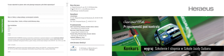 Tu wpisz odpowiedź na pytanie: Jakie cechy płynnego kompozytu są dla Ciebie najważniejsze? .................................................................................................................................................................................................................... .................................................................................................................................................................................................................... .................................................................................................................................................................................................................... .................................................................................................................................................................................................................... .................................................................................................................................................................................................................... .................................................................................................................................................................................................................... .................................................................................................................................................................................................................... ul. I Dywizji Pancernej 45, pok. 201, 43-300 Bielsko-Biała / (33) 496 35 39, [email protected]; Country Manager: Jarosław Bruszewski Wpisz nazwę sklepu i miasto, w którym został dokonany zakup: Konsultanci: stomatologia: lek. dent. Małgorzata Grzegorzak-Nowakowska, +48 600 975 896 protetyka: tech. dent. Przemysław Rajczak, +48 602 267 218 Dane kontaktowe: Przedstawiciele: Wpisz nr faktury z zakupu jednego z promocyjnych zestawów: kupon konkursowy Biuro Heraeus .................................................................................................................................................................................................................... .................................................................................................................................................................................................................... imię ........................................................................................................................................................................................................... nazwisko .................................................................................................................................................................................................... firma .......................................................................................................................................................................................................... adres ......................................................................................................................................................................................................... ................................................................................................................................................................................................................... telefon ....................................................................................................................................................................................................... e-mail ........................................................................................................................................................................................................ POTWIERDZAM UDZIAŁ W KONKURSIE akceptując zasady konkursu przedstawione w regulaminie dostępnym na stronie www.heraeus-dental.pl Jednocześnie wyrażam zgodę na jednorazowe wykorzystanie moich danych osobowych przez firmę Heraeus z siedzibą w Bielsku-Białej do celów związanych z prawidłowym rozstrzygnięciem konkursu, zgodnie z Ustawą o ochronie danych osobowych z dnia 29.08.1997 r. (Dz. U. Nr 133, poz. 883) Łódź, Częstochowa, Katowice, Kraków, Kielce i okolice – Konrad Kędziora, +48 600 976 698; Warszawa, Lublin, Rzeszów i okolice – Grzegorz Welo, +48 600 976 792; Poznań, Kalisz, Wrocław, Konin, Sieradz i okolice – Piotr Kupis, +48 604 241 425; Trójmiasto, Bydgoszcz, Toruń – Grzegorz Rymarzak, +48 502 261 007 Charisma®OPALflow Przyczepność pod kontrolą www.heraeus-dental.pl podpis i pieczątka....................................................................................................................................................................................... WYRAŻAM ZGODĘ na przetwarzenie moich danych osobowych zgodnie z Ustawą z dnia 29.08.1997 r. o ochronie danych osobowych (Dz. U. Nr 133, poz. 883) do celów marketingowych. Administratorem bazy jest Heraeus Polska z siedzibą w Bielsku-Białej. podpis ........................................................................................................................................................................................................ 31-469 Kraków, ul. Młyńska Boczna 9, tel.: (12) 410 00 81 www.sjs.pl Konkurs wygraj Szkolenie I stopnia w Szkole Jazdy Subaru Napisz do Nas: Jakie cechy płynnego kompozytu są dla Ciebie najważniejsze? 1 dokonaj zakupu jednego z pięciu promocyjnych zestawów w specjalnych cenach 2 wypełnij kupon, włóż do koperty wraz z odpowiedzią na pytanie i prześli pocztą do dnia 30 VI 2010 na adres: Biuro Heraeus ul. I Dywizji Pancernej 45, pok. 201, 43-300 Bielsko-Biała 3 nagrodzone zostaną najciekawsze odpowiedzi 4 nagrodą są 2 kursy doskonalenia jazdy I stopnia w