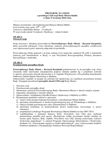 PROTOKÓŁ Nr LXII/10 z przebiegu LXII sesji Rady Miasta Dęblin w
