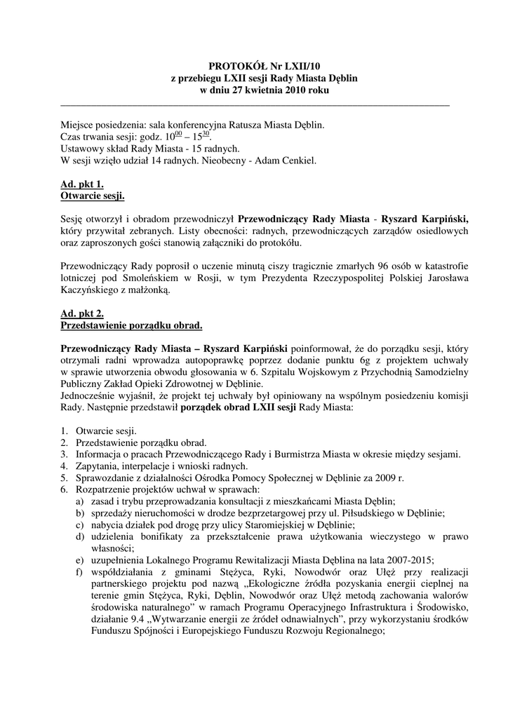 PROTOKÓŁ Nr LXII/10 z przebiegu LXII sesji Rady Miasta Dęblin w dniu 27 kwietnia 2010 roku ____________________________________________________________________________ Miejsce posiedzenia: sala konferencyjna Ratusza Miasta Dęblin. Czas trwania sesji: godz. 1000 – 1530. Ustawowy skład Rady Miasta - 15 radnych. W sesji wzięło udział 14 radnych. Nieobecny - Adam Cenkiel. Ad. pkt 1. Otwarcie sesji. Sesję otworzył i obradom przewodniczył Przewodniczący Rady Miasta - Ryszard Karpiński, który przywitał zebranych. Listy obecności: radnych, przewodniczących zarządów osiedlowych oraz zaproszonych gości stanowią załączniki do protokółu. Przewodniczący Rady poprosił o uczenie minutą ciszy tragicznie zmarłych 96 osób w katastrofie lotniczej pod Smoleńskiem w Rosji, w tym Prezydenta Rzeczypospolitej Polskiej Jarosława Kaczyńskiego z małżonką. Ad. pkt 2. Przedstawienie porządku obrad. Przewodniczący Rady Miasta – Ryszard Karpiński poinformował, że do porządku sesji, który otrzymali radni wprowadza autopoprawkę poprzez dodanie punktu 6g z projektem uchwały w sprawie utworzenia obwodu głosowania w 6. Szpitalu Wojskowym z Przychodnią Samodzielny Publiczny Zakład Opieki Zdrowotnej w Dęblinie. Jednocześnie wyjaśnił, że projekt tej uchwały był opiniowany na wspólnym posiedzeniu komisji Rady. Następnie przedstawił porządek obrad LXII sesji Rady Miasta: 1. 2. 3. 4. 5. 6. Otwarcie sesji. Przedstawienie porządku obrad. Informacja o pracach Przewodniczącego Rady i Burmistrza Miasta w okresie między sesjami. Zapytania, interpelacje i wnioski radnych. Sprawozdanie z działalności Ośrodka Pomocy Społecznej w Dęblinie za 2009 r. Rozpatrzenie projektów uchwał w sprawach: a) zasad i trybu przeprowadzania konsultacji z mieszkańcami Miasta Dęblin; b) sprzedaży nieruchomości w drodze bezprzetargowej przy ul. Piłsudskiego w Dęblinie; c) nabycia działek pod drogę przy ulicy Staromiejskiej w Dęblinie; d) udzielenia bonifikaty za przekształcenie prawa użytkowania wieczystego w prawo własności; e) uzupełnienia Lokalnego Programu Rewitalizacji Miasta Dęblina na lata 2007-2015; f) współdziałania z gminami Stężyca, Ryki, Nowodwór oraz Ułęż przy realizacji partnerskiego projektu pod nazwą „Ekologiczne źródła pozyskania energii cieplnej na terenie gmin Stężyca, Ryki, Dęblin, Nowodwór oraz Ułęż metodą zachowania walorów środowiska naturalnego” w ramach Programu Operacyjnego Infrastruktura i Środowisko, działanie 9.4 „Wytwarzanie energii ze źródeł odnawialnych”, przy wykorzystaniu środków Funduszu Spójności i Europejskiego Funduszu Rozwoju Regionalnego; 2 g) utworzenia obwodu głosowania w 6. Szpitalu Wojskowym z Przychodnią Samodzielny Publiczny Zakład Opieki Zdrowotnej w Dęblinie. 7. Rozpatrzenie sprawozdania z wykonania budżetu Miasta Dęblin za 2009 r. 8. Podjęcie uchwały w sprawie absolutorium dla Burmistrza Miasta. 9. Wolne wnioski. 10. Odpowiedzi na zapytania, interpelacje i wnioski. 11. Zatwierdzenie protokółu z LXI sesji Rady Miasta. 12. Zamknięcie sesji. Ad. pkt 3. Informacja o pracach Przewodniczącego Rady i Burmistrza Miasta w okresie między sesjami. Przewodniczący Rady Miasta - Ryszard Karpiński poinformował, że w związku z tym, że nie uczestniczył w ostatniej sesji Rady, informacja o pracy między sesjami będzie dłuższa i przedstawia się następująco: 19.03. - uczestniczył w posiedzeniu Komisji Samorządu i Porządku Publicznego podsumowującej stan bezpieczeństwa na terenie miasta Dęblin; informację o stanie bezpieczeństwa w 2009 roku przedstawił Komendant Komisariatu Policji w Dęblinie; 10.04. - po otrzymaniu informacji o tragedii pod Smoleńskiem, na spotkaniu z Burmistrzem Miasta w siedzibie Urzędu Miasta zapadły decyzje dotyczące uroczystej mszy żałobnej za ofiary katastrofy. Burmistrz był głównym inicjatorem i konsultantem z dowództwem jednostek wojskowych dla uczczenia mszą żałobną w dniu 12 kwietnia ofiar katastrofy; 11.04. - uczestniczył w mszy żałobnej w intencji ofiar katastrofy w kościele w Rykach; 12.04. - uczestniczył w mszy żałobnej w intencji ofiar katastrofy pod Smoleńskiem na placu przed pomnikiem Bohaterskim Lotnikom Szkoły Orląt; 13.04. - uczestniczył wspólnie z Burmistrzem w mszy świętej za ofiary Katynia w kościele Parafii p.w. Św. Piusa V Papieża; 24.04. - brał udział w zawodach wędkarskich organizowanych przez Polski Związek Wędkarski Koło "Start" związanych z rozpoczęciem sezonu wędkarskiego. Zawody odbyły się na akwenie przy Forcie Mierzwiączka; w dniu dzisiejszym brał udział w pracach komisji Rady Miasta przy opiniowaniu materiałów na dzisiejszą sesję. Na zakończenie poinformował, że radni: Witold Kleczkowski i Mieczysław Grobel jako przedstawiciele Rady Miasta Dęblin, byli oddelegowani na wyjazd do Pałacu Prezydenckiego do Warszawy, aby w imieniu wszystkich oddać hołd tragicznie zmarłej parze prezydenckiej. Burmistrz Miasta - Stanisław Włodarczyk powiedział: - czas między sesjami (od 31 marca 2010 r. do 26 kwietnia 2010 r.) zdominowały dramatyczne wydarzenia, jakie rozegrały się 10 kwietnia na lotnisku w Smoleńsku. Katastrofa lotnicza, jakiej nie było w historii lotnictwa, zabrała Polsce Prezydenta, jego małżonkę, najważniejszych dowódców wojskowych, w tym Szefa Sztabu WP i Dowódcę Sił Powietrznych – osoby, które nie raz gościły w Dęblinie, parlamentarzystów. W związku z tym i w naszym regionie odbyło się szereg uroczystości, w których uczestniczyłem: − w dniu 12 kwietnia w Mszy Świętej w intencji ofiar katastrofy zorganizowana przy Pomniku Bohaterskim Lotnikom Dęblińskiej Szkoły Orląt, − w dniu 13 kwietnia w Mszy Świętej w kościele Św. Piusa V Papieża, − w dniu 16 kwietnia odbyła się sesja Rady Powiatu w Rykach, − w dniu 24 kwietnia uczestniczyłem w uroczystościach pogrzebowych posła Edwarda Wojtasa w Lublinie, − w dniu 28 k