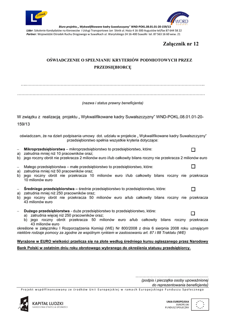 Biuro projektu „ Wykwalifikowane kadry Suwalszczyzny” WND-POKL.08.01.01-20-159/13 Lider: Szkolenie Kandydatów na Kierowców i Usługi Transportowe Jan Sitnik ul. Hoża 4 16-300 Augustów tel/fax 87 644 58 22 Partner: Wojewódzki Ośrodek Ruchu Drogowego w Suwałkach ul. Waryńskiego 24 16-400 Suwałki tel. 87 563 16 60 wew. 21 Załącznik nr 12 OŚWIADCZENIE O SPEŁNIANIU KRYTERIÓW PODMIOTOWYCH PRZEZ PRZEDSIĘBIORCĘ …..……………………………………………………………………………………………………………….. ……………………………………………………………………………………………………………………… (nazwa i status prawny beneficjenta) W związku z realizacją projektu „ Wykwalifikowane kadry Suwalszczyzny” WND-POKL.08.01.01-20159/13 oświadczam, że na dzień podpisania umowy dot. udziału w projekcie „ Wykwalifikowane kadry Suwalszczyzny” przedsiębiorstwo spełnia wszystkie kryteria dotyczące: Mikroprzedsiębiorstwa – mikroprzedsiębiorstwo to przedsiębiorstwo, które: a) zatrudnia mniej niż 10 pracowników oraz; b) jego roczny obrót nie przekracza 2 milionów euro i/lub całkowity bilans roczny nie przekracza 2 milionów euro Małego przedsiębiorstwa – małe przedsiębiorstwo to przedsiębiorstwo, które: a) zatrudnia mniej niż 50 pracowników oraz; b) jego roczny obrót nie przekracza 10 milionów euro i/lub całkowity bilans roczny nie przekracza 10 milionów euro Średniego przedsiębiorstwa – średnie przedsiębiorstwo to przedsiębiorstwo, które: a) zatrudnia mniej niż 250 pracowników oraz; b) jego roczny obrót nie przekracza 50 milionów euro a/lub całkowity bilans roczny nie przekracza 43 milionów euro Dużego przedsiębiorstwa - duże przedsiębiorstwo to przedsiębiorstwo, które: a) zatrudnia więcej niż 250 pracowników oraz; b) jego roczny obrót przekracza 50 milionów euro a/lub całkowity bilans roczny przekracza 43 milionów euro określone w załączniku I Rozporządzenia Komisji (WE) Nr 800/2008 z dnia 6 sierpnia 2008 roku uznającym niektóre rodzaje pomocy za zgodne ze wspólnym rynkiem w zastosowaniu art. 87 i 88 Traktatu (WE) Wyrażone w EURO wielkości przelicza się na złote według średniego kursu ogłaszanego przez Narodowy Bank Polski w ostatnim dniu roku obrotowego wybranego do określenia statusu przedsiębiorcy. …………………….................................. (podpis i pieczątka osoby upoważnionej do reprezentowania beneficjenta) Projekt współfinansowany ze środków Unii Europejskiej w rama ch Europejskiego Funduszu Społecznego Biuro projektu „ Wykwalifikowane kadry Suwalszczyzny” WND-POKL.08.01.01-20-159/13 Lider: Szkolenie Kandydatów na Kierowców i Usługi Transportowe Jan Sitnik ul. Hoża 4 16-300 Augustów tel/fax 87 644 58 22 Partner: Wojewódzki Ośrodek Ruchu Drogowego w Suwałkach ul. Waryńskiego 24 16-400 Suwałki tel. 87 563 16 60 wew. 21 1. Kryterium liczby zatrudnionych (należy zaznaczyć pole obok odpowiedzi literą „T” jeśli odpowiedź jest twierdząca albo literą „N” jeśli odpowiedź jest przecząca) <10 – maksymalny próg dla mikroprzedsiębiorcy Liczba zatrudnionych1 < 50 - maksymalny próg dla małego przedsiębiorcy <250 - maksymalny próg dla średniego przedsiębiorcy 2. Kryterium rocznego obrotu lub całkowitego bilansu rocznego (należy zaznaczyć pole obok odpowiedzi literą „T” jeśli odpowiedź jest twierdząca albo literą „N” jeśli odpowiedź jest przecząca) Mikro przedsiębiorst wo Małe przedsiębiorst wo Średnie przedsiębiorst wo 2 mln euro Roczny obrót 10 mln euro 50 mln euro 2 mln euro LUB Całkowit y bilans roczny 10 mln euro 43 mln euro Przedsiębiorstwo może zostać zaliczone do odpowiedniej kategorii MŚP, przy jednoczesnym spełnieniu kryterium w zakresie zatrudnienia i rocznego obrotu lub całkowitego bilansu (spełnia co najmniej jedno z dwóch z tych kryteriów). Przedsiębiorstwo nie musi spełniać obydwu warunków finansowych i może przekroczyć jeden z nich, nie Liczba osób zatrudnionych odpowiada liczbie „rocznych jednostek roboczych”, to jest liczbie pracowników zatrudnionych na pełnych etatach w obrębie danego przedsiębiorstwa lub w jego imieniu w ciągu całego roku referencyjnego. Praca osób, które nie przepracowały pełnego roku, pracowników zatrudnionych w niepełnym wymiarze godzin oraz pracowników sezonowych traktowana jest jako części ułamkowe jednostki. 1 Projekt współfinansowany ze środków Unii Europejskiej w rama ch Europejskiego Funduszu Społecznego Biuro projektu „ Wykwalifikowane kadry Suwalszczyzny” WND-POKL.08.01.01-20-159/13 Lider: Szkolenie Kandydatów na Kierowców i Usługi Transportowe Jan Sitnik ul. Hoża 4 16-300 Augustów tel/fax 87 644 58 22 Partner: Wojewódzki Ośrodek Ruchu Drogowego w Suwałkach ul. Waryńskiego 24 16-400 Suwałki tel. 87 563 16 60 wew. 21 tracąc swojego statusu. Uwaga: wyrażone w euro wielkości przelicza się na złote według średniego kursu ogłaszanego przez NBP w ostatnim dniu roku obrotowego 3. Dane liczbowe stosowane do określenia kategorii przedsiębiorcy (przed wpisaniem odpowiednich danych przedsiębiorstwa należy zapoznać się z Notą wyjaśniającą zamieszczoną w dalszej części załącznika). Dane zawarte w poniższej tabeli muszą być obliczone zgodnie z załącznikiem I Rozporządzenia Komisji (WE) Nr 800/2008 z dnia 6 sierpnia 2008 uznającym niektóre rodzaje pomocy za zgodne ze wspólnym rynkiem w zastosowaniu art. 87 i 88 Traktatu (WE). Dane stosowane do określenia kategorii przedsiębiorcy w roku 2 bieżącym w ostatnim okresie sprawozdawczym w poprzednim okresie sprawozdawczym 2014r. 2013 r. 2012 r. . Wielkość zatrudnienia Przychody netto ze sprzedaży towarów, wyrobów, usług, przychody operacyjne i finansowe w PLN (na koniec roku obrotowego) Suma aktywów bilansu (w PLN) dla sporządzających bilans …………………………