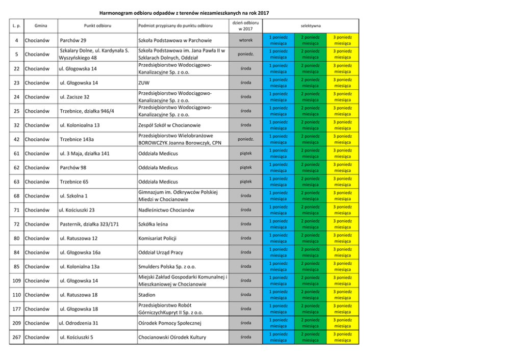 Harmonogram odbioru odpadów z terenów niezamieszkanych na rok 2017 L. p. Gmina Punkt odbioru Podmiot przypisany do punktu odbioru dzień odbioru w 2017 wtorek 1 poniedz miesiąca 2 poniedz miesiąca 3 poniedz miesiąca poniedz. 1 poniedz miesiąca 2 poniedz miesiąca 3 poniedz miesiąca środa 1 poniedz miesiąca 2 poniedz miesiąca 3 poniedz miesiąca środa 1 poniedz miesiąca 2 poniedz miesiąca 3 poniedz miesiąca środa 1 poniedz miesiąca 2 poniedz miesiąca 3 poniedz miesiąca środa 1 poniedz miesiąca 2 poniedz miesiąca 3 poniedz miesiąca środa 1 poniedz miesiąca 2 poniedz miesiąca 3 poniedz miesiąca poniedz. 1 poniedz miesiąca 2 poniedz miesiąca 3 poniedz miesiąca 4 Chocianów Parchów 29 Szkoła Podstawowa w Parchowie 5 Chocianów Szkalary Dolne, ul. Kardynała S. Wyszyńskiego 48 Szkoła Podstawowa im. Jana Pawła II w Szklarach Dolnych, Oddział Przedsiębiorstwo WodociągowoKanalizacyjne Sp. z o.o. selektywna 22 Chocianów ul. Głogowska 14 23 Chocianów ul. Głogowska 14 24 Chocianów ul. Zacisze 32 25 Chocianów Trzebnice, działka 946/4 32 Chocianów ul. Kolonioalna 13 Zespół Szkół w Chocianowie 42 Chocianów Trzebnice 143a Przedsiębiorstwo Wielobranżowe BOROWCZYK Joanna Borowczyk, CPN 61 Chocianów ul. 3 Maja, działka 141 Oddziała Medicus piątek 1 poniedz miesiąca 2 poniedz miesiąca 3 poniedz miesiąca 62 Chocianów Parchów 98 Oddziała Medicus piątek 1 poniedz miesiąca 2 poniedz miesiąca 3 poniedz miesiąca 63 Chocianów Trzebnice 65 Oddziała Medicus piątek 1 poniedz miesiąca 2 poniedz miesiąca 3 poniedz miesiąca 68 Chocianów ul. Szkolna 1 Gimnazjum im. Odkrywców Polskiej Miedzi w Chocianowie środa 1 poniedz miesiąca 2 poniedz miesiąca 3 poniedz miesiąca 71 Chocianów ul. Kościuszki 23 Nadleśnictwo Chocianów środa 1 poniedz miesiąca 2 poniedz miesiąca 3 poniedz miesiąca 72 Chocianów Pasternik, działka 323/171 Szkółka leśna środa 1 poniedz miesiąca 2 poniedz miesiąca 3 poniedz miesiąca 80 Chocianów ul. Ratuszowa 12 Komisariat Policji środa 1 poniedz miesiąca 2 poniedz miesiąca 3 poniedz miesiąca 84 Chocianów ul. Głogowska 16a Oddział Urząd Pracy środa 1 poniedz miesiąca 2 poniedz miesiąca 3 poniedz miesiąca 85 Chocianów ul. Kolonialna 13a Smulders Polska Sp. z o.o. środa 1 poniedz miesiąca 2 poniedz miesiąca 3 poniedz miesiąca 109 Chocianów ul. Głogowska 14 Miejski Zakład Gospodarki Komunalnej i Mieszkaniowej w Chocianowie środa 1 poniedz miesiąca 2 poniedz miesiąca 3 poniedz miesiąca 110 Chocianów ul. Ratuszowa 18 Stadion środa 1 poniedz miesiąca 2 poniedz miesiąca 3 poniedz miesiąca 177 Chocianów ul. Głogowska 18 Przedsiębiorstwo Robót GórniczychKupryt II Sp. z o.o. środa 1 poniedz miesiąca 2 poniedz miesiąca 3 poniedz miesiąca 209 Chocianów ul. Odrodzenia 31 Ośrodek Pomocy Społecznej środa 1 poniedz miesiąca 2 poniedz miesiąca 3 poniedz miesiąca 267 Chocianów ul. Kościuszki 5 Chocianowski Ośrodek Kultury środa 1 poniedz miesiąca 2 poniedz miesiąca 3 poniedz miesiąca ZUW Przedsiębiorstwo WodociągowoKanalizacyjne Sp. z o.o. Przedsiębiorstwo WodociągowoKanalizacyjne Sp. z o.o. Harmonogram odbioru odpadów z terenów niezamieszkanych na rok 2017 L. p. Gmina Punkt odbioru Podmiot przypisany do punktu odbioru dzień odbioru w 2017 selektywna 268 Chocianów Chocianowiec 101a Wiejski Ośrodek Kultury czwartek 1 poniedz miesiąca 2 poniedz miesiąca 3 poniedz miesiąca 269 Chocianów Parchów 80 Wiejski Ośrodek Kultury wtorek 1 poniedz miesiąca 2 poniedz miesiąca 3 poniedz miesiąca 270 Chocianów Pogorzeliska 20 Świetlica wiejska środa 1 poniedz miesiąca 2 poniedz miesiąca 3 poniedz miesiąca 271 Chocianów Żabice 21a Świetlica wiejska wtorek 1 poniedz miesiąca 2 poniedz miesiąca 3 poniedz miesiąca 272 Chocianów Ogrodzisko 12b Świetlica wiejska wtorek 1 poniedz miesiąca 2 poniedz miesiąca 3 poniedz miesiąca 273 Chocianów Jabłonów Świetlica wiejska wtorek 1 poniedz miesiąca 2 poniedz miesiąca 3 poniedz miesiąca 274 Chocianów Brunów Świetlica wiejska poniedz. 1 poniedz miesiąca 2 poniedz miesiąca 3 poniedz miesiąca 275 Chocianów Trzebnice 92 Wiejski Ośrodek Kultury środa 1 poniedz miesiąca 2 poniedz miesiąca 3 poniedz miesiąca 278 Chocianów ul. Wesoła 16 Szkoła Podstawowa w Chocianowie środa 1 poniedz miesiąca 2 poniedz miesiąca 3 poniedz miesiąca 281 Chocianów ul. Wesoła 14 Przedszkole Miejskie środa 1 poniedz miesiąca 2 poniedz miesiąca 3 poniedz miesiąca 282 Chocianów ul. Tadeusza Kościuszki 3 środa 1 poniedz miesiąca 2 poniedz miesiąca 3 poniedz miesiąca 283 Chocianów ul. 3-go Maja 2 środa 1 poniedz miesiąca 2 poniedz miesiąca 3 poniedz miesiąca 284 Chocianów Trzebnice 113a Szkoła Podstawowa w Trzebnicach środa 1 poniedz miesiąca 2 poniedz miesiąca 3 poniedz miesiąca 288 Chocianów ul. Ratuszowa 10 Gmina Chocianów środa 1 poniedz miesiąca 2 poniedz miesiąca 3 poniedz miesiąca środa 1 poniedz miesiąca 2 poniedz miesiąca 3 poniedz miesiąca środa 1 poniedz miesiąca 2 poniedz miesiąca 3 poniedz miesiąca 291 Chocianów 314 Chocianów Biblioteka Publiczna Miasta i Gminy w Chocianowie Biblioteka Publiczna Miasta i Gminy w Chocianowie Dolnośląska Słuzba Dróg i Kolei we Wrocławiu Fabryka Urządzeń Mechanicznych 59-140 Chocianów, ul. Fabryczna 24 CHOFUM w Chocianowie S.A. ul. Trzebnicka 22 315 Chocianów Duninów 3 Maxam Polska Sp. z o. o. środa 1 poniedz miesiąca 2 poniedz miesiąca 3 poniedz miesiąca 316 Chocianów ul. Głogowska 12 RAG Sp. z o. o. środa 1 poniedz miesiąca 2 poniedz miesiąca 3 poniedz miesiąca 341 Chocianów ul. Szkolna 1 Hala Sportowa środa 1 poniedz miesiąca 2 poniedz miesiąca 3 poniedz miesiąca 342 Chocianów Michałów 54 Leśniczówka czwartek 1 poniedz miesiąca 2 poniedz miesiąca 3 poniedz miesiąca 346 Chocianów ul. Środkowa 3a Przedszkole integracyjne środa 1 poniedz miesiąca 2 poniedz miesiąca 3 poniedz miesiąca