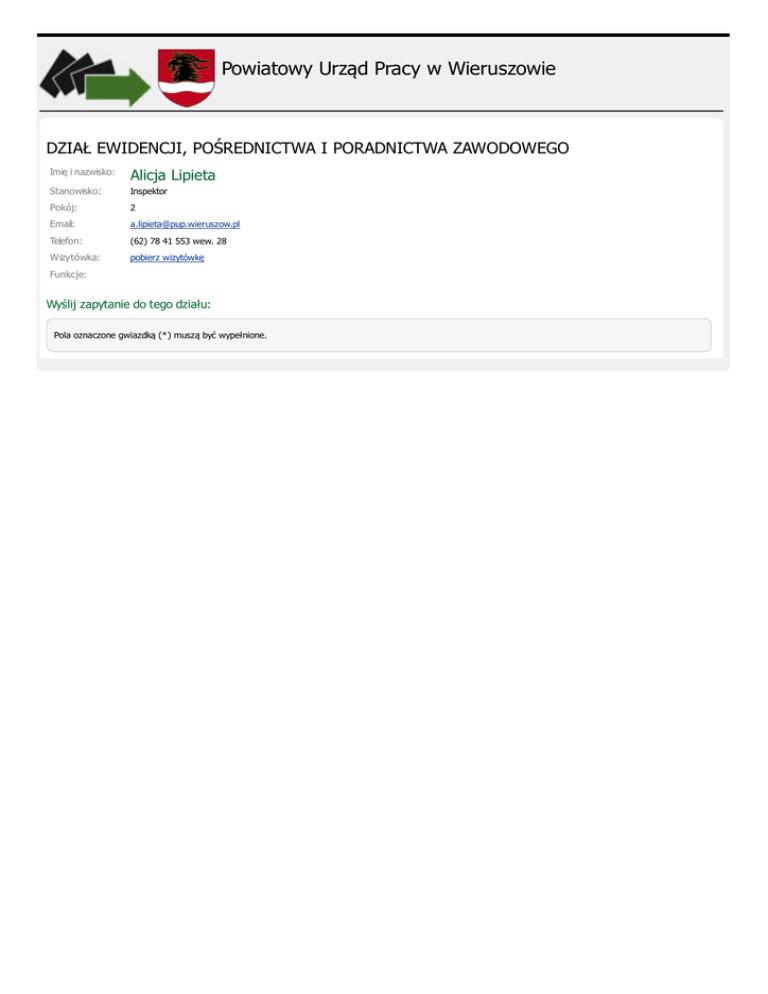 Powiatowy Urząd Pracy w Wieruszowie DZIAŁ EWIDENCJI, POŚREDNICTWA I PORADNICTWA ZAWODOWEGO Imię i nazwisko: Alicja Lipieta Stanowisko: Inspektor Pokój: 2 Email: [email protected] Telefon: (62) 78 41 553 wew. 28 Wizytówka: pobierz wizytówkę Funkcje: Wyślij zapytanie do tego działu: Pola oznaczone gwiazdką (*) muszą być wypełnione.