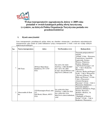 Wykaz touroperatorów zagranicznych, którzy w 2009 roku posiadali w swoich katalogach polską ofertę turystyczną (z rynków, na których Polska Organizacja Turystyczna posiada swe przedstawicielstwa) 1. Rynek amerykański Lista touroperatorów posiadających polską ofertę ma charakter orientacyjny i przedstawia najważniejszych touroperatorów gdyż działa na rynku kilkunaście tysięcy touroperatorów a wielu z nich nie wydaje żadnych drukowanych katalogów Lp. Nazwa touroperatora 1 2 206 Tours Abercrombie & Kent Inc. Adres Tel./Fax/adres www Rodzaj oferty Turystyka pielgrzymkowa i miejska „Poland” (9 dni – Warszawa, Częstochowa, Auschwitz, Łagiewniki, Swinice Warowe, Wadowice, Kraków, Zakopane) Tel: (631) 361 4644 „Old World Nostalgia” (10 289 East Main Street Toll Free: 1 800 206 8687 dni – 5 dni w Krakowie, Smithtown, NY 11787 Fax: (631) 361 2682 Warszawie) USA E-mail: [email protected] „Warsaw, Berlin and Prague” http://www.206tours.com (8 dni – 2 dni w Warszawie) „The best of Russia, The Baltic and Warsaw” (14 dni – 2 dni w Warszawie) „Eastern European Panorama” (16 dni – 4 dni w Warszawie i Krakowie) Turystyka miejska i kulturowa (Budapeszt, Praga, Tel: (630) 954-2944 1520 Kensington Road, suite Wiedeń, Warszawa Toll Free: 1-800-554-7016 212 /Kraków, Moskwa, St. Fax: (630) 954-3324 Petersburg) Oak Brook, Illinois, 60523 http://www.abercrombiekent. “Highlights of Eastern USA com/ Europe” (10 dni – 3 dni w Krakowie i Warszawie) 3 4 5 6 7 8 9 Adventure Center 1311 63rd Street, Suite 200 Emeryville, CA 94608 USA 20800 Westminster Hwy Suite 2148 Richmond, BC V6V 2W3 Adventures Abroad Canada Worldwide Travel Ltd 1124 1St Ave suite 101 Blaine WA 98240 USA Affordable Poland 1600 Saratoga Ave. #609 San Jose, CA 95129 USA American Jewish 630 Third Avenue Congress International New York, NY 10017 Travel USA American Travel Abroad 505 8th Avenue, Suite 801 New York, NY 10018 USA Turystyka aktywna (trecking, canoeing, biking) „High Tatras Trek” (8 dni – Kraków, Zakopane, Niedzica, Pieniny), „Wildlife and Wolf Trails” Tel: (510)-654-1879 (Kraków, Bieszczady), Toll Free: 1 800 228 8747 „Backroads of Poland” (15 Fax: (510)-654-4200 dni – Warszawa, Wigierski E-mail: Park Narodowy, Białowieski [email protected] Park Narodowy, Kazimierz http://www.adventurecenter.c Dolny, Zamość, Przemyśl; om/ Bieszczady, Kraków, Auschwitz), „Poland Explorer” (10 dni – Kraków, Bieszczady, Pieniny, Tatry, Ojcowski Park Narodowy) Tel:(604) 303-1099 Fax:(604) 303-1076 [email protected] http://www.adventuresabroad.com/ Turystyka miejska i krajoznawcza (Warszawa/ Częstochowa/ Auschwitz/ Kraków/ Wieliczka/ Zakopane/ Toll Free: 1 800 801-1055 Fax:(408) 894-1879 Turystyka miejska, aktywna, Ei sentymentalna mail:afford@affordablepolan d.com Turystyka sentymentalna i miejska (Warszawa [Umschlagplatz, Getto], Tel: (212)-879-4588 Kraków [Kazimierz], Lublin Toll Free: 1 800 221 4694 [Majdanek], Kraków http://www.ajcongresstravel. Oświęcim], Wilno, Kowno, com/ Budapeszt, Praga) „Eastern Europe Heritage” (19 dni) Tel: (212) 586-5230 Fax:(212)581-7925 Avanti Destinations Tel: (503)-295-1100 851 SW 6th Ave, Suite 1010 Fax: (503)-295-2723 Portland, OR 97204 E-mail: USA http://www.avantidestination s.com/ Best Catholic Pilgrimages 640 N La Salle Street Chicago IL 60610 USA Toll Free: 800-908-2378 Fax: (312) 944-3352 E-mail: http://www.eholy.com/ Turystyka miejska, aktywna i sanatoryjnaTurystyka miejska “Poland & Hungary” (12 dni – 5 dni w Warszawie i Krakowie) “Poland Combo Package” ( 4 dni w Warszawie i Krakowie) Turystyka miejska, kulturowa oraz religijna (pielgrzymki prowadzone przez duchownych) 10 11 Brendan Worldwide Vacation Canadian Travel Abroad 12 Collette Tours 13 14 162 Middle Street, Pawtucket, RI 02860, USA Collette Tours Canada East Collette Tours Canada West Vancouver: #200-3671 Westminister Hwy Richmond, BC V7C 5V2. Canada Contiki Holidays 17 80 Richmond Street West, Suite 804 Toronto, Ontario M5H 2A4 Canada Toronto: 5025 Orbitor Road Bldg #4, Suite 400 Mississauga, Ontario, L4W4Y5, Canada 15 16 Tel: (818)-428-6000 Toll Free: 1 800-421-8446 Fax: (818)-772-6492 21625 Prairie Street Chatsworth, CA 91311-5833 E-mail: USA [email protected] http://www.brendanvacations .com/ 801 East Katella Ave, 3rd Floor Anaheim, CA 92805 USA 9501 West Devon Avenue DER Travel Services Rosemont, IL 60018 USA Educational Opportunities Tours PO Box 6098 Lakeland, FL 33807 USA Turystyka miejska „Imperial cities” (10 dni), „Eastern Europe Panorama” (14 dni – 4 dni w Krakowie, Częstochowie, Poznaniu i Warszawie) Turystyka miejska „Scenic Poland” (7 dni – Warszawa, Bogusławice, Tel:(416) 364-2738 Częstochowa, Kraków, Toll Free: 1-800-387-1876 Zakopane) Fax:(416) 364-6951 „Panorama of Central E-mail: [email protected] Europe” (14 dni – 5 dni w http://www.cantrav.ca/ Krakowie i Warszawie) „Jewels of the East” (20 dni – 5 dni w Warszawie, Krakowie i Auschwitz) Turystyka miejska i sentymentalna (Warszawa, Tel:(401) 727-9000 Kraków, Auschwitz, Fax:(401) 728-1380 Częstochowa) http://www.collettetours.com “Magnificent Cities of / Central & Eastern Europe” (14 dni – 4 dni w Polsce) Turystyka miejska i Tel: (905) 629-0120 sentymentalna (Warszawa, …….. 800-468-5955 Kraków, Auschwitz, Częstochowa) Fax: (905)-624-2420 http://www.collettetours.com “Magnificent Cities of / Central & Eastern Europe” (14 dni – 4 dni w Polsce) Turystyka miejska i sentymentalna (Warszawa, Tel: (604) 278-5531 Kraków, Auschwitz, Fax: (604) 278-5310 Częstochowa) http://www.collettetours.com “Magnificent Cities of / Central & Eastern Europe” (14 dni – 4 dni w Polsce Turystyka miejska Toll Free: 1 866 CONTIKI (młodzieżowa) „Russia and Scandinavia” Fax: 714-935-2579 E-mail: [email protected] (22 dni – 2 dni tranzytowe w http://www.contiki.com/ Polsce – zwiedzanie Warszawy) Tel:(847) 692-4141 Turystyka indywidualna Toll Fr