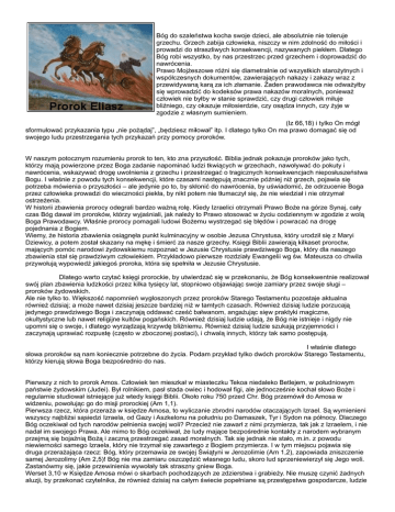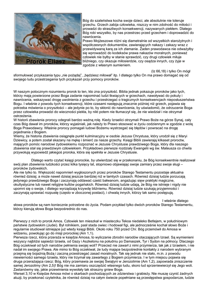 Proroctwa nie lekceważcie Bóg do szaleństwa kocha swoje dzieci, ale absolutnie nie toleruje grzechu. Grzech zabija człowieka, niszczy w nim zdolność do miłości i prowadzi do straszliwych konsekwencji, nazywanych piekłem. Dlatego Bóg robi wszystko, by nas przestrzec przed grzechem i doprowadzić do nawrócenia. Prawo Mojżeszowe różni się diametralnie od wszystkich starożytnych i współczesnych dokumentów, zawierających nakazy i zakazy wraz z przewidywaną karą za ich złamanie. Żaden prawodawca nie odważyłby się wprowadzić do kodeksów prawa nakazów moralnych, ponieważ człowiek nie byłby w stanie sprawdzić, czy drugi człowiek miłuje bliźniego, czy okazuje miłosierdzie, czy osądza innych, czy żyje w zgodzie z własnym sumieniem. Tylko Bóg, Stwórca i Władca wszechświata, zna wszystkie czyny i myśli człowieka (Iz 66,18) i tylko On mógł sformułować przykazania typu „nie pożądaj”, „będziesz miłował” itp. I dlatego tylko On ma prawo domagać się od swojego ludu przestrzegania tych przykazań przy pomocy proroków. Rola proroka W naszym potocznym rozumieniu prorok to ten, kto zna przyszłość. Biblia jednak pokazuje proroków jako tych, którzy mają powierzone przez Boga zadanie napominać ludzi tkwiących w grzechach, nawoływać do pokuty i nawrócenia, wskazywać drogę uwolnienia z grzechu i przestrzegać o tragicznych konsekwencjach nieposłuszeństwa Bogu. I właśnie z powodu tych konsekwencji, które czasami następują znacznie później niż grzech, pojawia się potrzeba mówienia o przyszłości – ale jedynie po to, by skłonić do nawrócenia, by uświadomić, że odrzucenie Boga przez człowieka prowadzi do wieczności piekła, by nikt potem nie tłumaczył się, że nie wiedział i nie otrzymał ostrzeżenia. W historii zbawienia prorocy odegrali bardzo ważną rolę. Kiedy Izraelici otrzymali Prawo Boże na górze Synaj, cały czas Bóg dawał im proroków, którzy wyjaśniali, jak należy to Prawo stosować w życiu codziennym w zgodzie z wolą Boga Prawodawcy. Właśnie prorocy pomagali ludowi Bożemu wystrzegać się błędów i powracać na drogę pojednania z Bogiem. Wiemy, że historia zbawienia osiągnęła punkt kulminacyjny w osobie Jezusa Chrystusa, który urodził się z Maryi Dziewicy, a potem został skazany na mękę i śmierć za nasze grzechy. Księgi Biblii zawierają kilkaset proroctw, mających pomóc narodowi żydowskiemu rozpoznać w Jezusie Chrystusie prawdziwego Boga, który dla naszego zbawienia stał się prawdziwym człowiekiem. Przykładowo pierwsze rozdziały Ewangelii wg św. Mateusza co chwila przywołują wypowiedź jakiegoś proroka, która się spełniła w Jezusie Chrystusie. Wielu Żydów uwierzyło w Niego właśnie dlatego, że nikt inny nie odpowiada obrazowi Mesjasza nakreślonemu z polecenia Boga przez proroków. Dlatego warto czytać księgi prorockie, by utwierdzać się w przekonaniu, że Bóg konsekwentnie realizował swój plan zbawienia ludzkości przez kilka tysięcy lat, stopniowo objawiając swoje zamiary przez swoje sługi – proroków żydowskich. Ale nie tylko to. Większość napomnień wygłoszonych przez proroków Starego Testamentu pozostaje aktualna również dzisiaj; a może nawet dzisiaj jeszcze bardziej niż w tamtych czasach. Również dzisiaj ludzie porzucają jedynego prawdziwego Boga i zaczynają oddawać cześć bałwanom, angażując sięw praktyki magiczne, okultystyczne lub nawet religijne kultów pogańskich. Również dzisiaj ludzie udają, że Bóg nie istnieje i nigdy nie upomni się o swoje, i dlatego wyrządzają krzywdę bliźniemu. Również dzisiaj ludzie szukają przyjemności i zaczynają uprawiać rozpustę (często w zboczonej postaci), i chwalą innych, którzy tak samo postępują. Tracąc osobistą więź z Bogiem, człowiek stopniowo ulega pokusom, popełnia jeden grzech za drugim, aż znajdzie się w sytuacji rozpaczy i załamania, kiedy zauważy ogrom popełnionego przez siebie zła. I właśnie dlatego słowa proroków są nam koniecznie potrzebne do życia. Podam przykład tylko dwóch proroków Starego Testamentu, którzy kierują słowa Boga bezpośrednio do nas. Grzechy Izraela i prorok Amos Pierwszy z nich to prorok Amos. Człowiek ten mieszkał w miasteczku Tekoa niedaleko Betlejem, w południowym państwie żydowskim (Judei). Był rolnikiem, pasł stada owiec i hodował figi, ale jednocześnie kochał słowo Boże i regularnie studiował istniejące już wtedy księgi Biblii. Około roku 750 przed Chr. Bóg przemówił do Amosa w widzeniu, powołując go do misji prorockiej (Am 1,1). Pierwsza rzecz, która przeraża w księdze Amosa, to wyliczanie zbrodni narodów otaczających Izrael. Są wymienieni wszyscy najbliżsi sąsiedzi Izraela, od Gazy i Aszkelonu na południu po Damaszek, Tyr i Sydon na północy. Dlaczego Bóg oczekiwał od tych narodów pełnienia swojej woli? Przecież nie zawarł z nimi przymierza, tak jak z Izraelem, i nie nadał im swojego Prawa. Ale mimo to Bóg oczekiwał, że ludy mające bezpośrednie kontakty z narodem wybranym przejmą się bojaźnią Bożą i zaczną przestrzegać zasad moralnych. Tak się jednak nie stało, m.in. z powodu niewierności samego Izraela, który nie trzymał się zawartego z Bogiem przymierza. I w tym miejscu pojawia się druga przerażająca rzecz: Bóg, który przemawia ze swojej Świątyni w Jerozolimie (Am 1,2), zapowiada zniszczenie samej Jerozolimy (Am 2,5)! Bóg nie ma zamiaru oszczędzić własnego ludu, skoro lud sprzeniewierzył się Jego woli. Zastanówmy się, jakie przewinienia wywołały tak straszny gniew Boga. Werset 3,10 w Księdze Amosa mówi o skarbach pochodzących ze zdzierstwa i grabieży. Nie muszę czynić żadnych aluzji, by przekonać czytelnika, że również dzisiaj na całym świecie popełniane są przestępstwa gospodarcze, ludzie są oszukiwani i wyzyskiwani, a publiczne pieniądze nie zawsze są wydawane zgodnie z potrzebami obywateli. Za