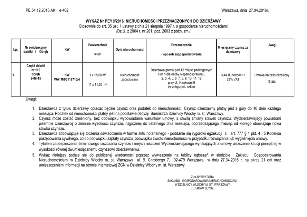 PE.54.12.2016.AK e-462 Warszawa, dnia 27.04.2016r. WYKAZ Nr PE/10/2016 NIERUCHOMOŚCI PRZEZNACZONYCH DO DZIERŻAWY Stosownie do art. 35 ust. 1 ustawy z dnia 21 sierpnia 1997 r. o gospodarce nieruchomościami /Dz.U. z 2004 r. nr 261, poz. 2603 z późn. zm./ Lp. 1. Nr ewidencyjny działki / Obręb Część działki nr 110 obręb 2-08-15 KW KW WA1M/00118710/4 Powierzchnia w m2 1 x 18,00 m² 11 x 11,50 m2 Opis nieruchomości Nieruchomość zabudowana Przeznaczenie i sposób zagospodarowania Dzierżawa gruntu pod 12 miejsc parkingowych o nr 1(dla osoby niepełnosprawnej), 2, 3, 4, 5, 6, 7, 8, 9, 10, 11, 12 przy ul. Naukowej 6 (w załączeniu szkic) Miesięczny czynsz za dzierżawę 3,44 zł. netto/m2 + 23% VAT Uwagi: Uwagi Umowa na czas określony 3 lata 1. Dzierżawca z tytułu dzierżawy opłacać będzie czynsz oraz podatek od nieruchomości. Czynsz dzierżawny płatny jest z góry do 10 dnia każdego miesiąca. Podatek od nieruchomości płatny jest na podstawie decyzji Burmistrza Dzielnicy Włochy m. st. Warszawy. 2. Czynsz może zostać zmieniony, bez obowiązku wypowiadania warunków umowy, z chwilą zmiany stawek czynszu. Wydzierżawiający powiadomi pisemnie Dzierżawcę o zmianie wysokości czynszu, najpóźniej do ostatniego dnia miesiąca, poprzedzającego miesiąc od którego obowiązuje nowa stawka czynszu. 3. Dzierżawca zobowiązuje się złożenia oświadczenia w formie aktu notarialnego - poddanie się rygorowi egzekucji z art. 777 § 1 pkt. 4 i 5 Kodeksu postępowania cywilnego, co do obowiązku zapłaty czynszu, obowiązku zwrotu nieruchomości w przypadku rozwiązania lub wygaśnięcia umowy. 4. Tytułem zabezpieczenia terminowego uiszczania czynszu i innych roszczeń Wydzierżawiającego wynikających z umowy uiszczenie kaucji pieniężnej w wysokości równej dwumiesięcznemu czynszowi dzierżawnemu. 5. Wykaz niniejszy podaje się do publicznej wiadomości poprzez wywieszenie na tablicy ogłoszeń w siedzibie Zakładu Gospodarowania Nieruchomościami w Dzielnicy Włochy m. st. Warszawy ul. B. Chrobrego 7, 02-479 Warszawa w dniu 27.04.2016 r. na okres 21 dni oraz umieszczeniem informacji na stronie internetowej ZGN w Dzielnicy Włochy m. st. Warszawy. Z-ca DYREKTORA ZAKŁADU GOSPODAROWANIA NIERUCHOMOŚCIAMI W DZIELNICY WŁOCHY M. ST. WARSZAWY /…/ ADAM SŁYSZ