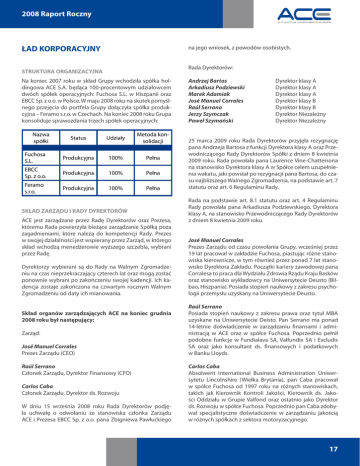2008 Raport Roczny ŁAD KORPORACYJNY na jego wniosek, z powodów osobistych. Rada Dyrektorów: STRUKTURA ORGANIZACYJNA Na koniec 2007 roku w skład Grupy wchodziła spółka holdingowa ACE S.A. będąca 100-procentowym udziałowcem dwóch spółek operacyjnych: Fuchosa S.L. w Hiszpanii oraz EBCC Sp. z o.o. w Polsce. W maju 2008 roku na skutek pomyślnego przejęcia do portfela Grupy dołączyła spółka produkcyjna – Feramo s.r.o. w Czechach. Na koniec 2008 roku Grupa konsoliduje sprawozdania trzech spółek operacyjnych: Nazwa spółki Status Udziały Metoda konsolidacji Fuchosa S.L. Produkcyjna 100% Pełna EBCC Sp. z o.o. Produkcyjna 100% Pełna Feramo s.r.o. Produkcyjna 100% Pełna SKŁAD ZARZĄDU I RADY DYREKTORÓW ACE jest zarządzane przez Radę Dyrektorów oraz Prezesa, któremu Rada powierzyła bieżące zarządzanie Spółką poza zagadnieniami, które należą do kompetencji Rady. Prezes w swojej działalności jest wspierany przez Zarząd, w którego skład wchodzą menedżerowie wyższego szczebla, wybrani przez Radę. Dyrektorzy wybierani są do Rady na Walnym Zgromadzeniu na czas nieprzekraczający czterech lat oraz mogą zostać ponownie wybrani po zakończeniu swojej kadencji. Ich kadencja zostaje zakończona na czwartym rocznym Walnym Zgromadzeniu od daty ich mianowania. Skład organów zarządzających ACE na koniec grudnia 2008 roku był następujący: Zarząd: José Manuel Corrales Prezes Zarządu (CEO) Raúl Serrano Członek Zarządu, Dyrektor Finansowy (CFO) Carlos Caba Członek Zarządu, Dyrektor ds. Rozwoju W dniu 15 września 2008 roku Rada Dyrektorów podjęła uchwałę o odwołaniu ze stanowiska członka Zarządu ACE i Prezesa EBCC Sp. z o.o. pana Zbigniewa Pawłuckiego Andrzej Bartos Arkadiusz Podziewski Marek Adamiak José Manuel Corrales Raúl Serrano Jerzy Szymczak Paweł Szymański Dyrektor klasy A Dyrektor klasy A Dyrektor klasy A Dyrektor klasy B Dyrektor klasy B Dyrektor Niezależny Dyrektor Niezależny 25 marca 2009 roku Rada Dyrektorów przyjęła rezygnację pana Andrzeja Bartosa z funkcji Dyrektora klasy A oraz Przewodniczącego Rady Dyrektorów Spółki z dniem 8 kwietnia 2009 roku. Rada powołała pana Laurence Vine-Chatterrona na stanowisko Dyrektora klasy A w Spółce celem uzupełnienia wakatu, jaki powstał po rezygnacji pana Bartosa, do czasu najbliższego Walnego Zgromadzenia, na podstawie art. 7 statutu oraz art. 6 Regulaminu Rady. Rada na podstawie art. 8.1 statutu oraz art. 4 Regulaminu Rady powołała pana Arkadiusza Podziewskiego, Dyrektora klasy A, na stanowisko Przewodniczącego Rady Dyrektorów z dniem 8 kwietnia 2009 roku. José Manuel Corrales Prezes Zarządu od czasu powołania Grupy, wcześniej przez 19 lat pracował w zakładzie Fuchosa, piastując różne stanowiska kierownicze, w tym również przez ponad 7 lat stanowisko Dyrektora Zakładu. Początki kariery zawodowej pana Corralesa to praca dla Wydziału Zdrowia Rządu Kraju Basków oraz stanowisko wykładowcy na Uniwersytecie Deusto (Bilbao, Hiszpania). Posiada stopień naukowy z zakresu psychologii przemysłu uzyskany na Uniwersytecie Deusto. Raúl Serrano Posiada stopień naukowy z zakresu prawa oraz tytuł MBA uzyskane na Uniwersytecie Deisto. Pan Serrano ma ponad 14-letnie doświadczenie w zarządzaniu finansami i administracją w ACE oraz w spółce Fuchosa. Poprzednio pełnił podobne funkcje w Fundialava SA, Valfundix SA i Excludis SA oraz jako konsultant ds. finansowych i podatkowych w Banku Lloyds. Carlos Caba Absolwent International Business Administration Uniwersytetu Lincolnshire (Wielka Brytania), pan Caba pracował w spółce Fuchosa od 1997 roku na różnych stanowiskach, takich jak Kierownik Kontroli Jakości, Kierownik ds. Jakości Oddziału w Grupie Valfond oraz ostatnio jako Dyrektor ds. Rozwoju w spółce Fuchosa. Poprzednio pan Caba zdobywał specjalistyczne doświadczenie w zarządzaniu jakością w różnych spółkach z sektora motoryzacyjnego. 17 2008 Raport Roczny Andrzej Bartos Pan Bartos pracował w Dresdner Kleinwort Capital (ostatnio przemianowane na Allianz Specialised Investments) przez trzy lata i był odpowiedzialny za operacje tej firmy na polskim rynku. Przed tym okresem był dyrektorem zarządzającym i wiceprezesem w BRE Bank Securities w Warszawie, gdzie odpowiadał za rynki kapitałowe i działalność z zakresu corporate finance. W latach 1994-1998 pracował dla Polskiego Banku Rozwoju jako dyrektor ds. giełdowych rynków kapitałowych. Pan Bartos posiada tytuł magistra w dziedzinie finansów i bankowości Szkoły Głównej Handlowej w Warszawie oraz ukończył szkolenie menedżerskie INSEAD z zakresu korporacyjnych strategii finansowych na rynkach globalnych. Arkadiusz Podziewski Pan Podziewski pracował jako konsultant zarządu w warszawskim oddziale Boston Consulting Group, gdzie zajmował się projektami strategicznymi i reorganizacyjnymi dla branży telekomunikacyjnej i bankowości. Przed tym okresem pracował trzy lata w firmie Monitor w Londynie na stanowisku konsultanta i realizował projekty strategiczne i z zakresu fuzji i przejęć (M&A) na różnych rynkach europejskich. Pan Podziewski posiada tytuł naukowy z dziedziny zarządzania biznesem uzyskany na Uniwersytecie Gdańskim. Marek Adamiak Pan Adamiak pracował w latach 1988-1990 jako menedżer w Vimar Impet, następnie w latach 1990-1996 jako menedżer na Polskę, a później dyrektor krajowy w ICD Group i ICD Polska, oraz był odpowiedzialny za rozwój rynków i relacje handlowe w Polsce. Od 1996 do 1999 roku pan Adamiak piastował stanowisko dyrektora ds. zakupów w polskim oddziale Delphi. W latach 1999-2002 był dyrektorem ds. zakupów na Europę w oddziale Delphi w Paryżu, a później menedżerem projektu na Europę odpowiedzialnym za centrum księgowe tej grupy. Od września 2002 roku do lipca 2007 roku pan Adamiak był dyrektorem generalnym i prezesem oddziału Delphi w Polsce. Od lipca 2007 roku prowadzi własną firmę konsultingową MA Management Solut