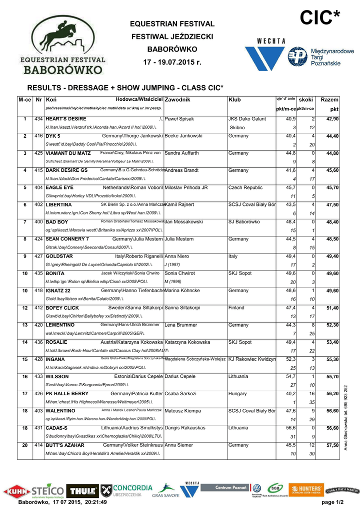 CIC* EQUESTRIAN FESTIVAL FESTIWAL JEŹDZIECKI BABORÓWKO 17 - 19.07.2015 r. RESULTS - DRESSAGE + SHOW JUMPING - CLASS CIC* Klub płeć\rasa\maść\ojciec\matka/ojciec matki\data ur.\kraj ur.\nr paszp. 1 434 HEART'S DESIRE .\. Paweł Spisak kl.\han.\kaszt.\Herzruf trk.\Aconda han./Acord II hol.\2008\.\. 2 416 DYK 5 JKS Dako Galant Skibno Germany\Thorge Jankowski Beeke Jankowski 425 VIAMANT DU MATZ France\Croy, Nikolaus Prinz von Sandra Auffarth 415 DARK DESIRE GS Germany\B.u.G.Gehrdau-SchröderAndreas Brandt 404 EAGLE EYE 6 402 LIBERTINA 7 400 BAD BOY 8 424 SEAN CONNERY 7 9 427 GOLDSTAR 10 435 BONITA 10 418 IGNATZ 22 Netherlands\Roman Voboril Miloslav Prihoda JR Mossakowski 2 20 44,8 0 9 8 Germany 41,6 4 4 17 Czech Republic 45,7 0 11 5 SCSJ Coval Biały Bór 43,5 4 6 14 SJ Baborówko 48,4 0 15 1 Germany 44,5 4 8 15 Italy 49,4 0 17 2 SKJ Sopot 49,6 0 20 3 Germany 48,6 1 16 10 G\trak.\bay\Connery\Seeconda/Consul\2007\.\. Italy\Roberto Riganelli Anna Niero G\.\grey\Rheingold De Luyne\Oriunda/Capriolo III\2002\.\. Jacek Wilczyński\Sonia Chwiro kl.\wlkp.\gn.\Rulon sp\Bielica wlkp/Cisoń xx\2005\POL\. J (1997) Sonia Chwirot M (1996) Germany\Hanno TiefenbacheMarina Köhncke G\old.\bay\Ibisco xx\Benita/Calato\2009\.\. 12 412 BOFEY CLICK Sweden\Sanna Siltakorpi Sanna Siltakorpi Finland G\swb\d.bay\Chirlon\Ballybofey xx/Distinctly\2009\.\. 13 420 LEMENTINO Germany\Hans-Ulrich Brümmer Lena Brummer Germany wał.\meckl.\bay\Lemnitz\Carmen/Carprilli\2005\GER\. 14 436 ROSALIE Austria\Katarzyna Kokowska Katarzyna Kokowska SKJ Sopot kl.\old.\brown\Rush-Hour\Cantate old/Cassius Clay hol\2008\AUT\ 15 428 INGANA Beata Glista-Piwko\Magdalena Sobczyńska-Woł Magdalena Sobczyńska-Wołejsz KJ Rakowiec Kwidzyn kl.\m\kara\Saganek m\Indiva m/Dobryń oo\2005\POL\. 16 433 WILSSON Estonia\Darius Cepele Darius Cepele Lithuania S\esh\bay\Vanco Z\Korgoonia/Epron\2009\.\. 17 426 PK HALLE BERRY Germany\Patricia Kutter Csaba Sarkozi Hungary M\han.\chest.\His Highness\Wienesse/Weltmeyer\2005\.\. 18 403 WALENTINO Anna i Marek Lesner\Paula Mańczak Mateusz Kiempa SCSJ Coval Biały Bór 431 CADAS-S Lithuania\Audrius Smulkstys Dangis Rakauskas 414 BUTT'S AZAHAR Germany\Volker Steinkraus Anna Siemer M\han.\bay\Chico's Boy\Heraldik's Amelie/Heraldik xx\2009\.\. Baborówko, 17 07 2015, 20:21:49 4 13 17 44,3 8 7 25 49,4 4 17 22 52,3 3 25 13 54,7 1 27 10 40,2 16 1 35 9 14 29 Lithuania 56,6 0 31 9 Germany 45,5 12 10 30 S\budionny\bay\Gvazdikas xx\Chernoglazka/Chikoj\2008\LTU\. 20 47,4 47,6 og.\sp\kaszt.\Rytm han.\Warena han./Wanderkönig han.\2009\POL\. 18 2 Germany og.\sp\kaszt.\Moravia westf.\Britanika xx/Aprizzo xx\2007\POL\. Germany\Julia Mestern Julia Mestern 40,9 4 kl.\niem.wierz.\gn.\Con Sherry hol.\Libra sp/West han.\2009\.\. Roman Drabiński\Tomasz MossakowskiJan pkt 12 G\kwpn\d.bay\Harley VDL\Prozette/Iroko\2009\.\. SK Bielin Sp. z o.o.\Anna MańczakKamil Rajnert pkt/m-ce pkt/m-ce 3 kl.\han.\black\Don Frederico\Cantate/Carismo\2009\.\. 5 Razem 40,4 S\sf\chest.\Diamant De Semilly\Heralina/Voltigeur Le Malin\2009\.\. 4 skoki Germany S\westf.\d.bay\Daddy Cool\Pia/Pinocchio\2008\.\. 3 ujeż dż anie 42,90 44,40 44,80 45,60 45,70 47,50 48,40 48,50 49,40 49,60 49,60 51,40 52,30 53,40 55,30 55,70 56,20 56,60 56,60 57,50 page 1/2 Anna Głoskowska tel. 695 923 252 Hodowca/Właściciel Zawodnik M-ce Nr Koń RESULTS - DRESSAGE + SHOW JUMPING - CLASS CIC* Klub płeć\rasa\maść\ojciec\matka/ojciec matki\data ur.\kraj ur.\nr paszp. 21 406 ROXANA Czech Republic\Adela&Petr Myskovi Petr Myška Czech Republic M\czes wb\bay\Rock´n Roll\Dyha/Agadir\2007\.\. 22 421 LIGHTSTREAM Germany\Schmidtlein Beteiligungs GmbH Nadine Marzahl Germany G\trak.\chest.\Starway\Light of Galaxy/Buddenbrock\2009\.\. 22 429 JURTA M SK Moszna\SK Moszna Jerzy Krukowski KJ Rakowiec Kwidzyn 501 SPRING STAR Katarzyna Kornin-Piotrowska\Karol LaukAleksandra Lauk 413 LARGO Henryk Waśniewski\Contra Sp.zo.o. Dagmara Wilczewska 432 WESTO S Lithuania\Audrius Smulkstis Dangis Rakauskas 408 KATON SO Białka\Artur Gierlicz Julia Sopińska og.\xxoo\kaszt.\Wiedeń oo\Kaoma xx/Marko\1997\.\. 28 401 ACAPULCO J (1999) 407 DREN 30 423 SARA-MIA R 32 419 LANCOM 33 405 OK BEA 34 430 FIONA 34 409 AWA 27 15 GTH Gdynia 55,7 4 30 17 Lithuania 61,0 0 37 5 KJ Dziecinów Sp. z 57,1 4 32 20 13 20 32 ZKS Drzonków 43,0 23 5 39 Germany 60,7 6 36 23 Germany 67,0 0 41 3 Germany 52,0 16 24 34 Czech Republic 61,2 8 38 28 Aleksandra Wieczorkowska KJ Equest Łąck 62,0 8 39 26 Joanna Mandecka-Turczyńska KJ Facimiech 62,0 8 M (1994) 36 438 ETOS Germany\Henryk Brandt Andreas Brandt kl.\hol.\chest.\Singulord Joter\Patrice/Ramirado\2007\.\. Germany\Mattejat Gerhard Inga Kissmann G\hol.\d.bay\Leandro\Roos-Chanell \Cor de la Bryere\2000\GER\ Czech Republic\Petr Doucha Sarka Douchova J (1997) Zdzisław Banaszczak\Aleksandra Wieczorkowsk kl.\m\gn.\Floret m\Missouri sp/Paszkwil m\2005\.\. SK Ochaby\Joanna Mandecka-Turczyńska kl.\m\gn.\Wareg m\Auforta m/First Des Termes xxoo\2007\POL\ SK Liski\SO Starogard Gd. Weronika Laskowska og.\wlkp.\kara\Grey m\Encyklika wlkp/poch.trk./Kerman wlkp\2006\.\. 37 410 BARON J (1999) 39 26 50,1 20 22 37 53,3 18 26 36 57,6 16 34 33 KJ Liliówka 57,4 20 Stęszewko 33 38 49,4 elim KJ Stado Ogierów Starogard Gd. Stanisław Cabała\Joanna Mandecka-Turczyńska Joanna Mandecka-Turczyńska KJ Facimiech wał.\sp\c.gn.\Chef Supreme xx\Baronowa sp/Robin II Z han.\2002\POL\09246 38 411 EMON M SK Moszna Sp.z o.o.\Ż aneta Niczyporuk-Trela Ż aneta Niczyporuk-Trela KJ Facimiech wał.\sp\gn.\Montbard xx\Eneida sp/Fanimo kwpn\2007\.\. 39 439 HOOVER Ireneusz Nowak\Bartosz Wyrwa Bartosz Wyrwa wał.\m\kaszt.\Cisoń xx\Helada m/Bolivar m\2006\.\. 437 CZEREśNIA SK Jaroszówka\Aleksandra Grzybkowska Aleksandra Grzybkowska KJ Agro Handel Śrem kl.\sp\siwa\Bolero De Ravel sp\Czarnuszka xx/Royal Court xx\2005\POL\ M (1995) 417 HORSEPLAY YOGI BEAR M\.\bay\.\.\2004\.\. Baborówko, 17 07 2015, 20:21:49 5 49,6 Germany\Georg Koch Georg Koch M\czes wb\bay\Gijom\Ok Bara/K-Battery\2000\.\. 0 35 4 G\meck