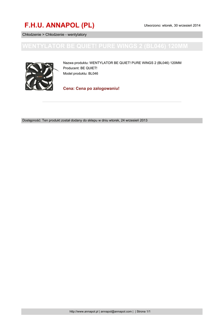 F.H.U. ANNAPOL (PL) Utworzono: wtorek, 30 wrzesień 2014 Chłodzenie > Chłodzenie - wentylatory WENTYLATOR BE QUIET! PURE WINGS 2 (BL046) 120MM Nazwa produktu: WENTYLATOR BE QUIET! PURE WINGS 2 (BL046) 120MM Producent: BE QUIET! Model produktu: BL046 Cena: Cena po zalogowaniu! Dostępność: Ten produkt został dodany do sklepu w dniu wtorek, 24 wrzesień 2013 http://www.annapol.pl | [email protected] | | Strona 1/1