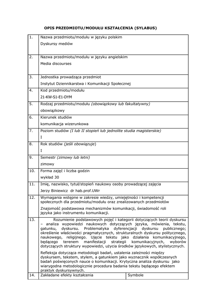 OPIS PRZEDMIOTU/MODUŁU KSZTAŁCENIA (SYLABUS) 1. Nazwa przedmiotu/modułu w języku polskim Dyskursy mediów 2. Nazwa przedmiotu/modułu w języku angielskim Media discourses 3. Jednostka prowadząca przedmiot Instytut Dziennikarstwa i Komunikacji Społecznej 4. Kod przedmiotu/modułu 21-KW-S1-E1-DYM 5. Rodzaj przedmiotu/modułu (obowiązkowy lub fakultatywny) obowiązkowy 6. Kierunek studiów komunikacja wizerunkowa 7. Poziom studiów (I lub II stopień lub jednolite studia magisterskie) I 8. Rok studiów (jeśli obowiązuje) I 9. Semestr (zimowy lub letni) zimowy 10. Forma zajęć i liczba godzin wykład 30 11. Imię, nazwisko, tytuł/stopień naukowy osoby prowadzącej zajęcia Jerzy Biniewicz dr hab.prof.UWr 12. Wymagania wstępne w zakresie wiedzy, umiejętności i kompetencji społecznych dla przedmiotu/modułu oraz zrealizowanych przedmiotów Znajomość podstawowa mechanizmów komunikacji, świadomość roli języka jako instrumentu komunikacji. 13. 14. Rozumienie podstawowych pojęć i kategorii dotyczących teorii dyskursu – analiza wypowiedzi naukowych dotyczących języka, mówienia, tekstu, gatunku, dyskursu. Problematyka dyferencjacji dyskursu publicznego; określenie właściwości pragmatycznych, strukturalnych dyskursu politycznego, naukowego, religijnego. Ujęcie tekstu jako działania komunikacyjnego, będącego terenem manifestacji strategii komunikacyjnych, wyborów dotyczących struktury wypowiedzi, użycia środków językowych, stylistycznych. Refleksja dotycząca metodologii badań, ustalenia zależności między dyskursem, tekstem, stylem, a gatunkiem jako wyznacznik współczesnych badań poświęconych nauce o komunikacji. Krytyczna analiza dyskursu jako wiarygodna metodologicznie procedura badania tekstu będącego efektem praktyk dyskursywnych. Zakładane efekty kształcenia Symbole kierunkowych efektów kształcenia, ma podstawową wiedzę o miejscu i znaczeniu teorii komunikacji, teorii języka i dyskursów, pragmatyki zna elementarną terminologię z zakresu znaczeniu teorii komunikacji, historii sztuki użytkowej, teorii języka i dyskursów, pragmatyki języka, antropologii mediów, teorii kultury ma podstawową wiedzę o głównych kierunkach rozwoju i najważniejszych nowych osiągnięciach w obszarze teorii komunikacji, historii sztuki użytkowej, teorii języka i dyskursów, pragmatyki języka, antropologii mediów, teorii kultury potrafi wyszukiwać, analizować, oceniać, selekcjonować i użytkować informacje przy użyciu różnych źródeł i sposobów, posiada zwłaszcza umiejętności związane z dekodowaniem i interpretacją tekstów wizerunkowych (reklama, PR), researchingiem, interpretacją komunikacyjnych zachowań społecznych, tekstów kultury popularnej i tekstów zapośredniczonych przez media masowe posiada elementarne umiejętności badawcze (formułowania i analiza problemów badawczych, dobór metod i narzędzi badawczych, opracowanie i prezentacja wyników) pozwalające na rozwiązanie typowych zadań/problemów, zwłaszcza z zakresu komunikacji interpersonalnej i grupowej, dyskursów medialnych, analizy zjawisk kultury popularnej potrafi posługiwać się podstawowymi ujęciami teoretycznymi , paradygmatami K_W01 K_WO2 K_W06 K_U02 K_U03 K_U06 badawczymi i pojęciami teorii komunikacji, historii sztuki użytkowej, teorii języka i dyskursów, pragmatyki języka, teorii dyskursów wykazuje aktywność w samodzielnym podejmowaniu działań profesjonalnych: jest przygotowany do pracy w instytucjach publicznych, organizacjach gospodarczych, prywatnych i non-profit, zwłaszcza w zakresie zarządzania procesami komunikacyjnymi, budowania wizerunku, opracowywania kampanii i strategii komunikacyjnych, wprowadzania standardów komunikacji językowej i pozajęzykowej. 15. K_KO2 Treści programowe Pojęcie dyskursu. Język, mówienie, tekst, dyskurs. Dyferencjacja dyskursu ze względu na referencję. Mediatyzacja. Mechanizmy komunikacji w dyskursach – naukowym, politycznym, ekonomicznym. Relacja media a polityka. Nowe media a dyskurs polityczny. Wyznaczniki pragmatyczne, stylistyczne dyskursu naukowego. Mediatyzacja dyskursu naukowego. Tabloidyzacja dyskursu publicznego. Media społecznościowe jako platforma dyskursu publicznego -wikipedia, twitter, blogosfera, forum, facebook. Media społecznościowe a marketing i reklama. Nowe technologie komunikacyjne jako instrument postrzegania świata, generowania jego obrazu. Media w kulturze XXI wieku. 16. Zalecana literatura P. Barwise, K. Hammond, Media, Warszawa 2000. Bauer Z., Dziennikarstwo wobec nowych mediów, Kraków 2009. Bralczyk J., O języku polskiej propagandy politycznej lat osiemdziesiątych i dziewięćdziesiątych, Warszawa 2003. Dobrzyńska T., Tekst, (w: ) J. Bartmiński (red.), Współczesny język polski, Dyskurs jako struktura i proces : praca zbiorowa, red. T. A. van Dijk ,Warszawa 2001. Dyskurs naukowy – tradycja i zmiana, red. S. Gajda, Opole 1999. Fras J., Komunikacja polityczna. Wybrane zagadnienia gatunków i języka wypowiedzi, Wrocław 2005. Goban-Klas T., Media i komunikowanie masowe. Teorie i analizy prasy, radia, telewizji i Internetu, Warszawa-Kraków, 2005. Grzenia J., Komunikacje językowa w internecie, Warszawa 2006. Kamińska-Szmaj I., Słowa na wolności. Język polityki po 1989 roku Wrocław 2001. Język a Kultura, tom 11: Język polityki a współczesna kultura polityczna, red. J.Anusiewicz J., Siciński B., Wrocław 1994. Opiłowski R., Jarosz J., Staniewski P.(red.), Lingwistyka mediów. Antologia tłumaczeń, Wrocław – Drezden, 2015. 17. Lisowska- Magdziarz M., Analiza tekstu w dyskursie medialnym, Kraków 2006. Media i komunikowanie w społeczeństwie demokratycznym. Studia medioznawcze, red. S. Michalczyk, Sosnowiec 2006. Media w Polsce. Pierwsza władza IV RP?, red. M. Sokołowski, Warszawa 2007. Mrozowski M., Media masowe. Władza, rozrywka i biznes, Warszawa 2001. Nowe media w komunikacji społecznej XX wieku, red. Hopfinger M., Warszawa 20
