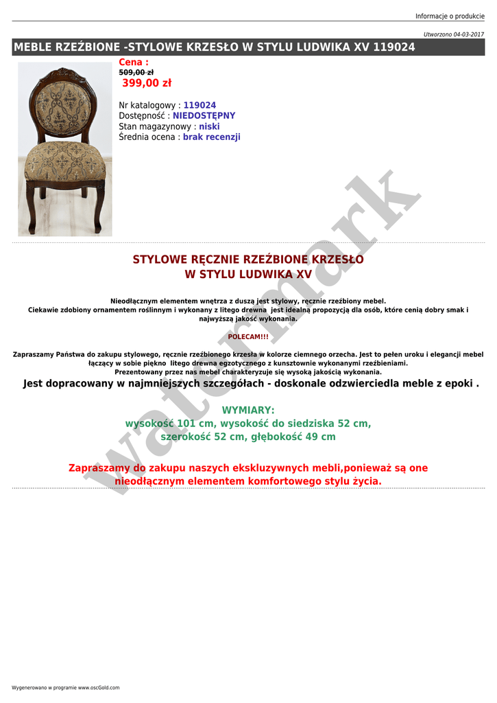 Informacje o produkcie Utworzono 04-03-2017 MEBLE RZEŹBIONE -STYLOWE KRZESŁO W STYLU LUDWIKA XV 119024 Cena : 509,00 zł 399,00 zł er m ar k Nr katalogowy : 119024 Dostępność : NIEDOSTĘPNY Stan magazynowy : niski Średnia ocena : brak recenzji STYLOWE RĘCZNIE RZEŹBIONE KRZESŁO W STYLU LUDWIKA XV Nieodłącznym elementem wnętrza z duszą jest stylowy, ręcznie rzeźbiony mebel. Ciekawie zdobiony ornamentem roślinnym i wykonany z litego drewna jest idealną propozycją dla osób, które cenią dobry smak i najwyższą jakość wykonania. POLECAM!!! Zapraszamy Państwa do zakupu stylowego, ręcznie rzeźbionego krzesła w kolorze ciemnego orzecha. Jest to pełen uroku i elegancji mebel łączący w sobie piękno litego drewna egzotycznego z kunsztownie wykonanymi rzeźbieniami. Prezentowany przez nas mebel charakteryzuje się wysoką jakością wykonania. Jest dopracowany w najmniejszych szczegółach - doskonale odzwierciedla meble z epoki . at WYMIARY: wysokość 101 cm, wysokość do siedziska 52 cm, szerokość 52 cm, głębokość 49 cm w Zapraszamy do zakupu naszych ekskluzywnych mebli,ponieważ są one nieodłącznym elementem komfortowego stylu życia. Wygenerowano w programie www.oscGold.com