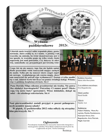 Wydanie październikowe 2012r. Człowiek może tworzyć sobie wspaniałe plany, postanowienia. Jutro zrobię to, to i tamto. A później i tak wszystko się zmienia, bo świat skonstruowany jest w ten sposób, że wszystko psuje się tylko wtedy, kiedy naprawdę jest nam potrzebne. Czy dotyczy to zdrowia, samochodu czy przyjaźni,jest już kwestią wtórCzego Jaś się nie nauczy, tego Jan nie będzie umiał. Hasło przewodnie wielu nauczycieli mające zachęcić do nauki. Tylko jak się nauczyć skoro czegoś zupełnie nowego, wyglądającego jak czarna magia, skoro sam nauczyciel nie potrafi tego wytłumaczyć? Zostaje ci tylko modlić się o cud, załatwić korki lub liczyć na pomoc światłego kolegi. Witamy więc w polskiej, bezpłatnej oświacie. Str.3 Pana Dawida Filipa nikomu przedstawiać nie trzeba. Nie potrafisz obsłużyć kserokopiarki? Potrzebny Ci numer pesel? Obcierają Cię nowe buty? (poważnie!). Wiesz dokładnie, dokąd się udać – do szkolnego sekretariatu. Str.4 Redaktor Naczelny: Marta Julia Ruczyńska Z-ca redaktora naczelnego: Ewa Bogusławska Skład i grafika: Paweł Szulik Zdjęcia: Nasi pierwszoklasiści zostali przyjęci w poczet pełnoprawnych uczniów naszej szkoły! W piątek, 12 października 2012 roku odbyły się otrzęsiny klas pierwszych. Str. 7 Natalia Łoś Redaktorzy: Hubert Nadolny, Marta Ruczyńska, Monika Pawlukiewicz, Katarzyna Kirsun, Ewa Bogusławska, Anna Pietrzak, Magda Czerniak Ogłoszenie Poszukujemy kandydata na zaszczytne stanowisko fotografa w naszej gazetce szkolnej. Wszystkich zainteresowanych prosi się o zgłoszenie do prof.. Pawła Górskiego. Redakcja A to pech Człowiek może tworzyć sobie wspaniałe plany, postanowienia. Jutro zrobię to, to i tamto. A później i tak wszystko się zmienia, bo świat skonstruowany jest w ten sposób, że wszystko psuje się tylko wtedy, kiedy naprawdę jest nam potrzebne. Czy dotyczy to zdrowia, samochodu czy przyjaźni,jest już kwestią wtórną. W piątek wieczorem możesz mieć katar po pas i galopujący kaszel i siedzisz w domu, ale na poniedziałkowy sprawdzian z historii, matematyki czy polskiego jesteś okazem zdrowia. Płyta działa doskonale, dopóki nie potrzeba włączyć prezentacji na lekcji.Raz się nie nauczysz i właśnie wtedy pójdziesz do odpowiedzi. Przez cały dzień możesz wyglądać jak gwiazda i nie spotkać nikogo znajomego, a tylko ubierzesz znoszony T-shirt i trampki, a już spotykasz ludzi, których nie widziałeś pół roku. Pech ma dobre wyczucie, nadchodzi najczęściej w ważny dzień, wtedy, kiedy chcesz, żeby wszystko poszło jak najlepiej. Nie ważne, ile kilometrów drogi nadłożysz, żeby ominąć czarnego kota, im bardziej się starasz, tym bardziej, mówiąc bardzo kolokwialnie, wszystko spieprzysz. Ironia losu: idziesz okrężną drogą, żeby ominąć kota i właśnie na tej trasie wpadasz pod samochód. Tak bywa. Na nic zdaje się wstawanie prawą nogą, są takie dni, w które wieczorem dziękujemy jakiejkolwiek sile wyższej tylko za to, że już się skończyły. Bo oto kolejna złośliwość losu: jak coś zaczyna się psuć, to potem już wszystko razem spada nam na głowę. Bez litości. A człowiek nic nie może poradzić. Na pecha nie ma remedium. I nie ma co czekać, aż sataniści zjedzą całą populację czarnych kotów, wstawać co rano prawą nogą i zawiązywać czerwone kokardki na szczęście. Co ma się stać, i tak się stanie. Lepiej śmiać się z lekkiego pecha, niż załamywać ręce. Marta Julia Ruczyńska STR. 2 GAZETKA TRZYNASTKA Czego Jaś się nie nauczy Czego Jaś się nie nauczy, tego Jan nie będzie umiał. Hasło przewodnie wielu nauczycieli mające zachęcić do nauki. Tylko jak się nauczyć skoro czegoś zupełnie nowego, wyglądającego jak czarna magia, skoro sam nauczyciel nie potrafi tego wytłumaczyć? Zostaje ci tylko modlić się o cud, załatwić korki lub liczyć na pomoc światłego kolegi. Witamy więc w polskiej, bezpłatnej oświacie. Uczęszczając na różnych poziomach edukacji do różnych szkół zauważyłam jedno: są nauczyciele „prawdziwi” ( z powołaniem i pasją, którzy uwielbiają swoje przedmioty, potrafią wytłumaczyć wszelkie jego zawiłości, a każdy dzień w szkole nie jest kolejną stacją osobistej drogi krzyżowej) oraz ci nauczyciele, którym po prostu „ w życiu coś nie wyszło” i wylądowali w szkole, wyładowując swą frustrację na uczniach. Z pierwszymi można się dogadać i idzie się do nich na lekcje jakby to nie były tzw. zajęcia dydaktyczne. Do drugich zaś jakby w ich klasie były czeluści piekielne, a zamiast ławek kociołki pełne gotującej się smoły. A dlaczego? Przez niemożliwe wymagania. Pytanie za 100 pkt.: Dlaczego na profilu, który nawet nie chce być humanistyczny wymaga się od uczniów wiadomości z zakresu rozszerzonego? Przecież to czysty absurd. Oni mają przecież mnóstwo kucia ze swoich przedmiotów wiodących. Ale, przecież to jest ambitna klasa, dadzą radę? Muszą tylko odpowiedzieć na 10 pytań do tekstu źródłowego, 2 pytania od nauczyciela oraz napisać dłuższą pracę pisemną. Jest to oczywiście tylko jeden temat. A ich w tygodniu jest około 5. Życzę powodzenia. Jestem na profilu humanistycznym i na języku polskim większość rzeczy mamy zrobionych na lekcji. W domu można dokończyć notatkę, nauczyć się ostatnich tematów i jeśli są, odpowiedzieć na pytania. Jest tak jednak dlatego, iż na lekcji naprawdę opracowujemy temat, a nie tylko rozmawiamy o niebieskich migdałach. Nauki humanistyczne to jednak przysłowiowy pikuś przy przedmiotach ścisłych. Tutaj nie wystarczy coś dokładnie przeczytać, dłużej się zastanowić i ubrać wszystko w GAZETKA TRZYNASTKA piękne słowa. Bo chociaż polska gramatyka prosta nie jest, to w naukach ścisłych trzeba rozumieć wszystko dokładnie, aby pojąć całość. A to niemożliwe, jeśli lekcja jest zależna od humoru nauczyciela: „ No, dzisiaj ma