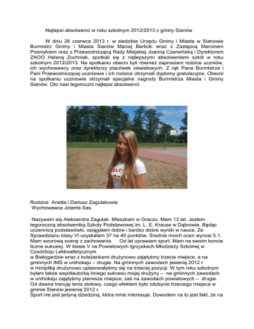 Najlepsi absolwenci w roku szkolnym 2012/2013 z gminy Sianów W dniu 26 czerwca 2013 r. w siedzibie Urzędu Gminy i Miasta w Sianowie Burmistrz Gminy i Miasta Sianów Maciej Berlicki wraz z Zastępcą Marcinem Posmykiem oraz z Przewodniczącą Rady Miejskiej Joanną Czerwińską i Dyrektorem ZAOO Heleną Zochniak, spotkali się z najlepszymi absolwentami szkół w roku szkolnym 2012/2013. Na spotkaniu obecni byli również zaproszeni rodzice uczniów, ich wychowawcy oraz dyrektorzy placówek oświatowych. Z rąk Pana Burmistrza i Pani Przewodniczącej uczniowie i ich rodzice otrzymali dyplomy gratulacyjne. Obecni na spotkaniu uczniowie otrzymali specjalne nagrody Burmistrza Miasta i Gminy Sianów. Oto nasi tegoroczni najlepsi absolwenci Rodzice Anetta i Dariusz Zagulakowie Wychowawca Jolanta Sas. Nazywam się Aleksandra Zagulak. Mieszkam w Graczu. Mam 13 lat. Jestem tegoroczną absolwentką Szkoły Podstawowej im. L. E. Krause w Dąbrowie. Będąc uczennicą podstawówki, osiągałam dobre i bardzo dobre wyniki w nauce. Ze Sprawdzianu klasy VI uzyskałam 37 na 40 punktów. Średnia moich ocen wynosi 5.1. Mam wzorową ocenę z zachowania. Od lat uprawiam sport. Mam na swoim koncie liczne sukcesy. W klasie V na Powiatowych Igrzyskach Młodzieży Szkolnej w Czwórboju Lekkoatletycznym w Białogardzie wraz z koleżankami drużynowo zajęłyśmy trzecie miejsce, a na gminnych IMS w unihokeju – drugie. Na gminnych zawodach jesienią 2012 r. w minipiłkę drużynowo uplasowałyśmy się na trzeciej pozycji. W tym roku szkolnym byłam także współautorką innego sukcesu mojej drużyny – na gminnych zawodach w unihokeju zajęłyśmy pierwsze miejsce, zaś na zawodach powiatowych – drugie. Od dawna trenuję tenis stołowy, czego efektem było zdobycie trzeciego miejsca w gminie Sianów jesienią 2012 r. Sport nie jest jedyną dziedziną, która mnie interesuje. Dowodem na to jest fakt, że na gminnym konkursie informatycznym w Sianowie wiosną tego roku zdobyłam pierwsze miejsce. Kilka razy reprezentowałam szkołę podstawową w Dąbrowie na konkursach recytatorskich „Ptaki, ptaszki i ptaszęta polne”. Moją pasją jest także muzyka, kocham zwierzęta. Przez ostatnie dwa lata byłam członkiem pocztu sztandarowego szkoły. Moje najbliższe plany na przyszłość to ukończenie gimnazjum w Dąbrowie, nad tym, co będzie dalej, jeszcze się nie zastanawiałam… Kacper Wielągowski Rodzice Izabela i Piotr Wielągowscy Uczeń kl. 6B, SP nr 2 w Sianowie, wychowawca: pani Alicja Kiedrowska Osiągnięcia: średnia ocen – 5,45 wynik ze sprawdzianu – 31 pkt Konkursy: I miejsce w Szkolnym i Gminnym Konkursie Informatycznym Udział w Konkursie Matematycznym z Elementami Przyrody. Udział w etapie rejonowym. Udział w Konkursie Języka Polskiego z Elementami Historii Udział w Międzynarodowym Konkursie Matematycznym Kangur Życie szkoły: Udział w apelu z okazji Narodowego Święta Niepodległości Udział w jasełkach Udział w akcji Narodowe Czytanie „Pana Tadeusza” Karolina Czarnecka Rodzice: Iwona i Piotr Czarneccy Wychowawca: Beata Krysztofiak-Wasilewska Ważniejsze osiągnięcia: 2012r. – zajęcie I miejsca na zawodach wojewódzkich w biegach przełajowych w Polanowie 2012r. – zajęcie II miejsca na zawodach Ochotniczej Straży Pożarnej na szczeblu wojewódzkim 2013r. – udział w zawodach wojewódzkich w Białogardzie w biegu na 100m 2012/2013r.-pełnienie funkcji przewodniczącej samorządu uczniowskiego oraz pełnienie funkcji gospodarza klasowego 2012/2013r.- średnia ocen – 4,77, wzorowe zachowanie Zainteresowania: Sport, głównie biegi, Rysowanie i malowanie, Projektowanie, Podróżowanie, Jazda konna, Udzielanie się w wolontariacie. Plany na przyszłość: W najbliższej przyszłości planuję iść do I LO w Koszalinie na kierunek matematyczno-informatyczny. Po ukończeniu liceum mam w planach pójść na studia na kierunek architektura wnętrz. W późniejszym czasie, po ukończeniu studiów chcę zajmować się projektowaniem wnętrz. Od zawsze jest to moją wielką pasją. Czuję, że świetnie sprawdziłabym się w tym zawodzie, ponieważ dobrze radzę sobie z matematyką i rysunkiem technicznym. Umiejętności te są niezbędne przy tego typu pracy. SZKOŁA PODSTAWOWA NR 1 W SIANOWIE ROK SZKOLNY 2012/2013 Klaudia Matyszczuk Rodzice: Joanna i Sebastian Matyszczuk Wychowawca: Katarzyna Krawczyk Średnia: 4,44 Sprawdzian: 30 pkt. Szkoła: Gimnazjum Gminne w Sianowie Osiągnięcia: Udział w finałach Mistrzostw Polski młodzików młodszych; Zainteresowania: badminton, lubię słuchać muzyki i oglądać filmy. Magdalena Olejnik uczennica Gimnazjum Gminnego im. Ireny Sendlerowej w Sianowie Rodzice: Ewa i Zenon Olejnik Wychowawczyni: Barbara Gaik Nazywam się Magdalena Olejnik i jestem tegoroczną absolwentką Gimnazjum Gminnego im. Ireny Sendlerowej w Sianowie. Przez trzy lata uczęszczałam do klasy o profilu językowym. Moją wychowawczynią i zarówno nauczycielką języka angielskiego była pani Barbara Gaik. Na egzaminie gimnazjalnym osiągnęłam wysokie wyniki, w szczególności z części językowej. Zdobyłam 100% z języka angielskiego na poziomie podstawowym i rozszerzonym. Z pozostałych przedmiotów uzyskałam: 90% z części matematycznej, 89% z części przyrodniczej, 94% z części polonistycznej oraz 100% z części historycznej. Przez trzy lata brałam udział w licznych konkursach. W tym roku zostałam laureatką konkursu historycznego o puchar dyrektora I LO im. Stanisława Dubois w Koszalinie oraz finalistką Konkursu Przedmiotowego z Języka Polskiego organizowanego przez II LO w Koszalinie. Rok temu zakwalifikowałam się do konkursu „Wiedza o życiu i działalności Marii Curie-Skłodowskiej” na etapie wojewódzkim. Brałam udział w wielu konkursach organizowanych w naszym gimnazjum, szczególnie z języka angielskiego, języka niemieckiego i chemii. Gimnazjum ukończę ze średnią ocen 5,38. Moimi zainteresowaniami są podróż