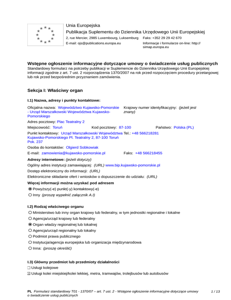 Unia Europejska Publikacja Suplementu do Dziennika Urzędowego Unii Europejskiej 2, rue Mercier, 2985 Luxembourg, Luksemburg Faks: +352 29 29 42 670 E-mail: [email protected] Informacje i formularze on-line: http:// simap.europa.eu Wstępne ogłoszenie informacyjne dotyczące umowy o świadczenie usług publicznych Standardowy formularz na potrzeby publikacji w Suplemencie do Dziennika Urzędowego Unii Europejskiej informacji zgodnie z art. 7 ust. 2 rozporządzenia 1370/2007 na rok przed rozpoczęciem procedury przetargowej lub rok przed bezpośrednim przyznaniem zamówienia. Sekcja I: Właściwy organ I.1) Nazwa, adresy i punkty kontaktowe: Oficjalna nazwa: Województwo Kujawsko-Pomorskie - Urząd Marszałkowski Województwa KujawskoPomorskiego Krajowy numer identyfikacyjny: (jeżeli jest znany) _____ Adres pocztowy: Plac Teatralny 2 Miejscowość: Toruń Kod pocztowy: 87-100 Państwo: Polska (PL) Punkt kontaktowy: Urząd Marszałkowski Województwa Tel.: +48 566218281 Kujawsko-Pomorskiego Pl. Teatralny 2, 87-100 Toruń Pok. 237 Osoba do kontaktów: Olgierd Sobkowiak E-mail: [email protected] Faks: +48 566218455 Adresy internetowe: (jeżeli dotyczy) Ogólny adres instytucji zamawiającej: (URL) www.bip.kujawsko-pomorskie.pl Dostęp elektroniczny do informacji: (URL) _____ Elektroniczne składanie ofert i wniosków o dopuszczenie do udziału: (URL) _____ Więcej informacji można uzyskać pod adresem Powyższy(-e) punkt(-y) kontaktowy(-e) Inny (proszę wypełnić załącznik A.I) I.2) Rodzaj właściwego organu Ministerstwo lub inny organ krajowy lub federalny, w tym jednostki regionalne i lokalne Agencja/urząd krajowy lub federalny Organ władzy regionalnej lub lokalnej Agencja/urząd regionalny lub lokalny Podmiot prawa publicznego Instytucja/agencja europejska lub organizacja międzynarodowa Inna: (proszę określić) I.3) Główny przedmiot lub przedmioty działalności Usługi kolejowe Usługi kolei miejskiej/kolei lekkiej, metra, tramwajów, trolejbusów lub autobusów PL Formularz standardowy T01 - 1370/07 – art. 7 ust. 2 - Wstępne ogłoszenie informacyjne dotyczące umowy o świadczenie usług publicznych 1 / 13 Żegluga morska lub śródlądowa Inny: (proszę określić) I.4) Udzielenie zamówienia w imieniu innych właściwych organów Właściwy organ dokonuje zakupu w imieniu innych właściwych organów: tak nie (jeżeli tak, więcej informacji o tych właściwych organach można podać w załączniku A.II) PL Formularz standardowy T01 - 1370/07 – art. 7 ust. 2 - Wstępne ogłoszenie informacyjne dotyczące umowy o świadczenie usług publicznych 2 / 13 Sekcja II: Przedmiot zamówienia II.1) Opis: II.1.1) Nazwa nadana zamówieniu: Wykonywanie publicznego transportu zbiorowego w przewozach drogowych II.1.2) Rodzaj zamówienia, dziedzina(-y), której(-ych) dotyczą usługi transportu publicznego: Kategoria usług: nr: T-05 (Zob. kategorie usług w załączniku B) Dziedziny, których dotyczą usługi transportu publicznego: Wykonywanie publicznego transportu zbiorowego w przewozach drogowych Kod NUTS: PL61 II.1.3) Krótki opis zamówienia: Wykonywanie publicznego transportu zbiorowego w przewozach drogowych na następujących liniach komunikacyjnych: LP. NR LINII LINIA 1. 100 BRODNICA - LIPNO 2. 104 BYDGOSZCZ - RADZIEJÓW 3. 110 INOWROCŁAW - ŻNIN 4. 111 TORUŃ - RADZIEJÓW 5. 112 TORUŃ - BRODNICA 6. 113 TORUŃ - GOLUB-DOBRZYŃ 7. 114 TORUŃ - INOWROCŁAW 8. 115 TORUŃ - LIPNO 9. 116 TORUŃ - RYPIN 10. 119 WŁOCŁAWEK - LIPNO 11. 121 WŁOCŁAWEK - RADZIEJÓW 12. 202 BYDGOSZCZ - MOGILNO 13. 207 BYDGOSZCZ - RYPIN 14. 208 INOWROCŁAW - MOGILNO 15. 209 INOWROCŁAW - STRZELNO 16. 211 MOGILNO - BARCIN 17. 212 MOGILNO - ŻNIN 18. 215 TORUŃ - CIECHOCINEK 19. 216 WŁOCŁAWEK- ALEKSANDRÓW KUJAWSKI 20. 217 WŁOCŁAWEK - INOWROCŁAW 21. 218 BYDGOSZCZ - JANOWIEC WIELKOPOLSKI 22. 219 WŁOCŁAWEK - RYPIN 23. 220 GOLUB-DOBRZYŃ - RYPIN 24. 221 ŻNIN - KCYNIA 25. 222 WŁOCŁAWEK - PIOTRKÓW KUJAWSKI II.1.4) Wspólny Słownik Zamówień (CPV) PL Formularz standardowy T01 - 1370/07 – art. 7 ust. 2 - Wstępne ogłoszenie informacyjne dotyczące umowy o świadczenie usług publicznych 3 / 13 Główny przedmiot Słownik główny 60112000 Słownik uzupełniający (jeżeli dotyczy) II.1.5) Informacje na temat podwykonawstwa Przewidywane jest zlecenie podwykonawstwa: tak nie (jeżeli tak) Wartość lub część zamówienia, które prawdopodobnie będzie zlecone stronom trzecim: minimalny procent: _____ (%), maksymalny procent: _____ (%) wartości zamówienia albo Nieznana Krótki opis wartości/części zamówienia, które będzie zlecone podwykonawcom: _____ II.2) Ilość i/lub wartość usług Opis: _____ km usług publicznych w zakresie transportu pasażerskiego: _____ Szacunkowy koszt bez VAT: (proszę podać wyłącznie dane liczbowe) _____ albo Zakres: między _____ i _____ Waluta: Waluta: II.3) Planowana data rozpoczęcia i czas trwania zamówienia lub termin realizacji Rozpoczęcie: 01/01/2017 (dd/mm/rrrr) Okres w miesiącach: 24 albo w dniach: _____ (od udzielenia zamówienia) PL Formularz standardowy T01 - 1370/07 – art. 7 ust. 2 - Wstępne ogłoszenie informacyjne dotyczące umowy o świadczenie usług publicznych 4 / 13 Sekcja III: Informacje o charakterze prawnym, ekonomicznym, finansowym i technicznym III.1) Warunki dotyczące zamówienia: III.1.1) Parametry kosztów w celu obliczenia rekompensaty: _____ III.1.2) Informacje o wyłącznych prawach: Przyznano wyłączne prawa tak nie (jeżeli tak) Wyszczególnienie przyznanych wyłącznych praw: _____ III.1.3) Podział przychodów ze sprzedaży biletów: Odsetek przydzielony podmiotowi świadczącemu usługi publiczne: _____ (%) (uznaje się, że pozostała część jest przyznawana właściwemu organowi) III.1.4) Standardy socjalne: (przejęcie personelu zgodnie z dyrektywą 2001/23/WE) Wykaz wymaganych standardów (w tym lista pracowników, których to dotyczy, szczegółowe informacje na temat umownych praw i zobowiązań p