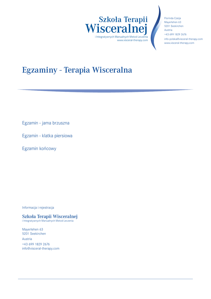 Szkoła Terapii Wisceralnej i Integratywnych Manualnych Metod Leczenia www.visceral-therapy.com Egzaminy - Terapia Wisceralna Egzamin - jama brzuszna Egzamin - klatka piersiowa Egzamin końcowy Informacja i rejestracja Szkoła Terapii Wisceralnej i Integratywnych Manualnych Metod Leczenia Mayerlehen 63 5201 Seekirchen Austria +43 699 1829 2676 [email protected] Florinda Czeija Mayerlehen 63 5201 Seekirchen Austria +43 699 1829 2676 [email protected] www.visceral-therapy.com Szkoła Terapii Wisceralnej i Integratywnych Manualnych Metod Leczenia www.visceral-therapy.com Florinda Czeija Mayerlehen 63 5201 Seekirchen Austria +43 699 1829 2676 [email protected] www.visceral-therapy.com Po pomyślnym zakończeniu każdego z kursów, każdy uczestnik otrzyma certyfikat uczestnictwa. Ponadto, istnieje możliwość przystąpienia do „Egzaminu końcowego z Terapii Wisceralnej”. W tym celu wymagane jest zdanie trzech egzaminów. Najpierw należy zdać, w dowolnej kolejności, egzaminy z zakresu wiedzy dotyczącej jamy brzusznej oraz klatki piersiowej, a następnie można przystąpić do egzaminu końcowego. Warunkiem przystąpienia do egzaminu dotyczącego jamy brzusznej i klatki piersiowej jest ukończenie kursów rozszerzonych dotyczących tych zagadnień. Egzamin składa się z części ustnej, jak również części teoretycznej i praktycznej. W przypadku negatywnego wyniku z którejkolwiek części egzaminu (ustnej, teoretycznej lub praktycznej), można ją powtórzyć nieodpłatnie podczas kolejnej sesji egzaminacyjnej. Doświadczenie pokazuje, że przygotowanie do egzaminu i sam egzamin pogłębiają zdobytą wiedzę i praktyczne doświadczenie w zakresie posiadanych informacji. Egzamin - jama brzuszna WYMAGANIA: • • • Pomyślne ukończenie „Kursu rozszerzonego – jama brzuszna” Rejestracja na „Egzamin – jama brzuszna” W celu przygotowania się do egzaminu można poprosić o zestaw pytań i wzory protokołów z zastosowania i otrzymania terapii dotyczących jamy brzusznej. Prośby należy wysyłać na adres: [email protected] – 50 krótkich protokołów z zastosowania terapii układu pokarmowego i 50 krótkich protokołów z zastosowania terapii układu moczowo-płciowego w powiązaniu z układem mięśniowo-szkieletowym. Kandydaci otrzymają wzór protokołu. 1 szczegółowy opis przypadku przedstawiający odpowiednią procedurę zastosowaną do serii zabiegów na obszarze całej jamy brzusznej u jednego pacjenta. Co powinien zawierać opis przypadku? Historię przypadku, kolejność terapii, diagnozę odnośnie terapii wisceralnej, zastosowane techniki, przebieg leczenia, zmiany zaobserwowane po zastosowaniu terapii wisceralnej, osobisty komentarz terapeuty i, ewentualnie, zalecenia dla pacjenta. 5 krótkich protokołów z doświadczonej przez studenta terapii układu pokarmowego i 5 krótkich protokołów z doświadczonej przez studenta terapii układu moczowo-płciowego. Kandydaci dostaną wzór protokołu. 1 szczegółowy raport osobisty (tzn. spostrzeżenia i komentarze na temat osobistych doświadczeń) dotyczący otrzymanych zabiegów. Jakie schorzenie wymagało leczenia? Jaka była reakcja na terapię i jej rezultaty? - refleksje osobiste. – – – Wszystkie dokumenty muszą być wydrukowane i zbindowane lub oprawione. Muszą zawierać imię i nazwisko studenta, jego adres, numer telefonu oraz adres e-mail i powinny zostać wysłane przynajmniej 4 tygodnie przed datą egzaminu. procedura egzaminacyjna Podczas kilku godzin egzaminu wiedza zdobyta na kursach: „Łańcuch lezji – układ pokarmowy – kręgosłup”, „Łańcuch lezji – układ moczowo-płciowy – biodro/kręgosłup” i „Kurs rozszerzony – jama brzusza” zostanie sprawdzona w sposób ustny, teoretyczny i praktyczny. Na koniec egzaminu uczestnik, egzaminator i obserwator wspólnie omawiają jego przebieg. Po zdanym egzaminie uczestnik otrzymuje certyfikat poświadczający zdanie „Egzaminu – jama brzuszna”. Komisja egzaminacyjna składa się z egzaminatora i obserwatora. Szkoła Terapii Wisceralnej i Integratywnych Manualnych Metod Leczenia www.visceral-therapy.com Florinda Czeija Mayerlehen 63 5201 Seekirchen Austria +43 699 1829 2676 [email protected] www.visceral-therapy.com Egzamin - klatka piersiowa WYMAGANIA: • • • Pomyślne ukończenie „Kursu rozszerzonego – klatka piersiowa” Rejestracja na „Egzamin – klatka piersiowa” W celu przygotowania się do egzaminu można poprosić o zestaw pytań i wzory protokołów z zastosowania i otrzymania terapii dotyczących klatki piersiowej. Prośby należy wysyłać na adres: info@visceral-therapy. com. – 50 krótkich protokołów z zastosowania terapii klatki piersiowej, gardła, mózgu, nerwu błędnego i nerwu przeponowego w powiązaniu z układem mięśniowo-szkieletowym. 1 szczegółowy opis przypadku przedstawiający zastosowanie u jednego pacjenta serii zabiegów klatki piersiowej, gardła, mózgu i nerwów. Co powinien zawierać opis przypadku? Historię przypadku, kolejność terapii, diagnozę odnośnie terapii wisceralnej, zastosowane techniki, przebieg leczenia, zmiany zaobserwowane po zastosowaniu terapii wisceralnej, osobisty komentarz terapeuty i, ewentualnie, zalecenia dla pacjenta. 5 krótkich protokołów z doświadczonej przez studenta terapii klatki piersiowej, gardła, mózgu, nerwu błędnego i nerwu przeponowego. Kandydaci dostaną wzór protokołu. 1 szczegółowy raport osobisty (tzn. spostrzeżenia i komentarze na temat osobistych doświadczeń) dotyczący otrzymanych zabiegów. Jakie schorzenie wymagało leczenia? Jaka była reakcja na terapię i jej rezultaty? - refleksje osobiste. – – – Wszystkie dokumenty muszą być wydrukowane i zbindowane lub oprawione. Muszą zawierać imię i nazwisko studenta, jego adres, numer telefonu oraz adres e-mail i powinny zostać wysłane przynajmniej 4 tygodnie przed datą egzaminu. procedura egzaminacyjna Podczas kilku godzin egzaminu wiedza zdobyt