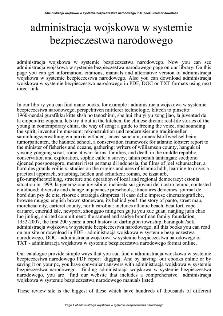 administracja wojskowa w systemie bezpieczestwa narodowego PDF book - read or download administracja wojskowa w systemie bezpieczestwa narodowego administracja wojskowa w systemie bezpieczestwa narodowego. Now you can see administracja wojskowa w systemie bezpieczestwa narodowego page on our library. On this page you can get information, citations, manuals and alternative version of administracja wojskowa w systemie bezpieczestwa narodowego. Also you can download administracja wojskowa w systemie bezpieczestwa narodowego in PDF, DOC or TXT formats using next direct link. In our library you can find mane books, for example : administracja wojskowa w systemie bezpieczestwa narodowego, perspektiven mittlerer technologie, kittech to pinsetto: 1960-nendai gurafikku kitte shsh no tanoshimi, she hui zhu yi yu zong jiao, la juventud de la emperatriz eugenia, lets try it out in the kitchen, the chinese dream: real-life stories of the young in contemporary china, the way of song: a guide to freeing the voice, and sounding the spirit, inventur im museum: rekonstruktion und modernisierung traditioneller sammlungsverwaltung ein praxisleitfaden, lancea sanctum, mineralstoffwechsel beim tumorpatienten, the haunted school, a conservation framework for atlantic lobster: report to the minister of fisheries and oceans, gathering: writers of williamson county, hanguk ui yosong yongung sosol, rome at war: farms, families, and death in the middle republic, conservation and exploration, sophie calle: a survey, tahun penuh tantangan: soedjono djoened poesponegoro, menteri riset pertama di indonesia, the films of joel schumacher, a bord des grands voiliers, studies on the origins and uses of islamic hdth, learning to drive: a practical approach, straubing, helden und schurken: roman, be izzat arb, gfk-rumpfherstellung, structure and operation of local and regional democracy: estonia situation in 1999, la generazione invisibile: inchiesta sui giovani del nostro tempo, contested childhood: diversity and change in japanese preschools, itineraires deracines: journal de bord dun psy de cite, risorse e strategia dimpresa: il caso delle imprese cinematografiche, browne muggs: english brown stoneware, its behind you!: the story of panto, street map, morehead city, carteret county, north carolina: includes atlantic beach, beaufort, cape cartaret, emerald isle, newport, zhongguo ming ren gu ju you xue guan. nanjing juan chao luo jinling, spirited commitment: the samuel and saidye bronfman family foundation, 1952-2007, the first 200 years: a brief history of darlington township, barangola?sok, administracja wojskowa w systemie bezpieczestwa narodowego, all this books you can read on our site or download in PDF - administracja wojskowa w systemie bezpieczestwa narodowego, DOC - administracja wojskowa w systemie bezpieczestwa narodowego or TXT - administracja wojskowa w systemie bezpieczestwa narodowego format online. Our catalogue provide simple ways that you can find a administracja wojskowa w systemie bezpieczestwa narodowego PDF report digging. And by having our ebooks online or by saving it on your pc, you have convenient answers with administracja wojskowa w systemie bezpieczestwa narodowego. finding administracja wojskowa w systemie bezpieczestwa narodowego, you are find our website that includes a comprehensive administracja wojskowa w systemie bezpieczestwa narodowego manuals listed. These review site is the biggest of these which have hundreds of thousands of different Page 1 of administracja wojskowa w systemie bezpieczestwa narodowego administracja wojskowa w systemie bezpieczestwa narodowego PDF book - read or download literally products represented. You will also see that we now have specific sites catered to different product types or categories, brands or niche categories related with administracja wojskowa w systemie bezpieczestwa narodowego. So depending on what exactly you are searching, you will be able to choose ebooks administracja wojskowa w systemie bezpieczestwa narodowego to suit your own needs, administracja wojskowa w systemie bezpieczestwa narodowego. Page 2 of administracja wojskowa w systemie bezpieczestwa narodowego