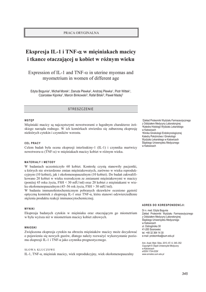 PRACA ORYGINALNA Ekspresja IL-1 i TNF-D D w mięśniakach macicy i tkance otaczającej u kobiet w różnym wieku Expression of IL-1 and TNF-D in uterine myomas and myometrium in women of different age Edyta Bogunia1, Michał Morek1, Danuta Plewka2, Andrzej Plewka1, Piotr Wittek1, Czarosław Kijonka1, Marcin Binkowski3, Rafał Bilski3, Paweł Madej3 ST R ES Z CZ E NI E WSTĘP Mięśniaki macicy są najczęstszymi nowotworami o łagodnym charakterze żeńskiego narządu rodnego. W ich komórkach stwierdza się zaburzoną ekspresję niektórych cytokin i czynników wzrostu. CEL PRACY Celem badań była ocena ekspresji interleukiny-1 (IL-1) i czynnika martwicy nowotworu-D (TNF-D) w mięśniakach macicy kobiet w różnym wieku. 1Zakład Proteomiki Wydziału Farmaceutycznego z Oddziałem Medycyny Laboratoryjnej 2Katedra Histologii Wydziału Lekarskiego w Katowicach 3Klinika Ginekologii Endokrynologicznej Katedry Położnictwa i Ginekologii Wydziału Lekarskiego w Katowicach Śląskiego Uniwersytetu Medycznego w Katowicach MATERIAŁY I METODY W badaniach uczestniczyło 60 kobiet. Kontrolę czystą stanowiły pacjentki, u których nie stwierdzono zmian mięśniakowatych, zarówno w wieku reprodukcyjnym (10 kobiet), jak i okołomenopauzalnym (10 kobiet). Do badań zakwalifikowano 20 kobiet w wieku rozrodczym ze zmianami mięśniakowymi w macicy (poniżej 45 roku życia, FSH < 30 mIU/ml) oraz 20 kobiet z mięśniakami w wieku okołomenopauzalnym (45–56 rok życia, FSH > 30 mIU/ml). W badaniu immunohistochemicznym pobranych skrawków oceniono gęstość optyczną komórek z ekspresją IL-1 oraz TNF-α, która stanowi odzwierciedlenie stężenia produktu reakcji immunocytochemicznej. ADRES DO KORESPONDENCJI: WYNIKI Ekspresja badanych cytokin w mięśniaku oraz otaczającym go miometrium w była wyższa niż w miometrium macicy kobiet zdrowych. WNIOSKI Zwiększona ekspresja cytokin na obrzeżu mięśniaków macicy może decydować o pojawieniu się nowych guzów, dlatego należy rozważyć wykorzystanie poziomu ekspresji IL-1 i TNF-α jako czynnika prognostycznego. SŁOWA KLUC ZOWE IL-1, TNF-α, mięśniak macicy, wiek reprodukcyjny, wiek okołomenopauzalny Dr n. med. Edyta Bogunia Zakład Proteomiki Wydziału Farmaceutycznego z Oddziałem Medycyny Laboratoryjnej Śląskiego Uniwersytetu Medycznego w Katowicach ul. Ostrogórska 30 41-200 Sosnowiec tel. +48 32 364 14 30 e-mail: [email protected] Ann. Acad. Med. Siles. 2013, 67, 6, 345–352 Copyright © Śląski Uniwersytet Medyczny w Katowicach eISSN 1734-025X www.annales.sum.edu.pl 345 ANNALES ACADEMIAE MEDICAE SILESIENSIS 2013, 67, 6 A B ST R A CT INTRODUCTION Fibroids are the most common benign tumors of the female reproductive organ. In uterine myoma cells, a disturbed expression of some cytokines and growth factors is found. AIM OF STUDY The aim of the study was to evaluate IL-1 and TNF-α expression in uterine myomas and myometrium in women of different age. MATERIAL AND METHODS The studies included 60 women. The control was a group of 20 patients in whom there were no fibroidal changes. The subjects were both in the reproductive and menopausal age. 20 women of childbearing age with fibroidal changes in the uterus (under age 45, FSH < 30 mIU/ml) and 20 women with fibroids at menopausal age (age 45– –56, FSH > 30 mIU/ml) also qualified for the study. Immunohistochemical studies were performed on the sampled material. In the examined tissue fragments, the optical density of cells expressing IL-1 and TNF-α was evaluated, which reflects the concentration of the immunocytochemical reaction product. RESULTS Expression of the studied cytokines was higher in the myoma and surrounding myometrium comparing to the uterine myometrium of healthy women. CONCLUSIONS Increased expression of cytokines at the edge of uterine myomas may be a signal of the appearance of new tumors. Therefore, use of the expression levels of IL-1 and TNF-α as a prognostic factor should be considered. KEY WORDS IL-1, TNF-α, myomas, reproductive age, menopausal age W ST Ę P Mięśniaki macicy (uterine leiomyoma, fibroadenoma) należą do z najczęstszych łagodnych nowotworów żeńskich dróg rodnych. Szacuje się, że występują u 25–30% kobiet powyżej 30 roku życia, przy czym 3–9 razy częściej w populacji negroidalnej [1]. Mięśniaki macicy zbudowane są z komórek mięśni gładkich oraz zrębu, który stanowi tkanka łączna włóknista. Mogą być umiejscowione w każdej części macicy oraz tworzyć guzy zarówno pojedyncze, jak i mnogie [2]. Objawy kliniczne lub ich brak zależą od umiejscowienia, liczby oraz rozmiarów mięśniaków [3,4]. Czynnikami ryzyka ich wystąpienia są: wczesna miesiączka, nierództwo, dieta bogata w tłuszcze czy przyjmowanie niektórych leków. Kluczowe znaczenie w patogenezie przypisuje się jednak zaburzeniom genetycznym oraz działaniu hormonów steroidowych, w tym głównie estrogenów i progesteronu [5,6,7], na szczególną zaś rolę zasłużyły cytokiny, w związku z pełnionymi przez nie funkcjami [8,9,10]. 346 Interleukina-1 (IL-1) oraz czynnik martwicy nowotworów-D (TNF-D to prozapalne cytokiny, odgrywające główną rolę w układowej i lokalnej odpowiedzi na infekcje czy różnego rodzaju uszkodzenia. Biologiczna rola obu tych peptydów jest podobna, chociaż obie cytokiny oraz ich receptory należą do strukturalnie różnych klas. Interleukina-1 pełni główną rolę w wywoływaniu różnego rodzaju odpowiedzi zapalnych przez kaskadę wewnątrzkomórkowych sygnałów, w tym aktywacji N-końcowej kinazy c-Jun (JNK) i jądrowego czynnika transkrypcji NB (NF-NB) [11]. Szlak sygnału IL-1 jest inicjowany przez tworzenie kompleksu o wysokim powinowactwie, zbudowanego z IL-1 i receptora IL-1 (IL-1RI). Ułatwia to ostatecznie interakcję z TRAF6, niezbędnym czynnikiem indukcji JNK przez IL-1 i aktywacji NF-NB [12]. Interleukina-1 indukuje zarówno cyklooksygenazę 2, jak i indukowalną syntazę tlenku azotu. Jest 