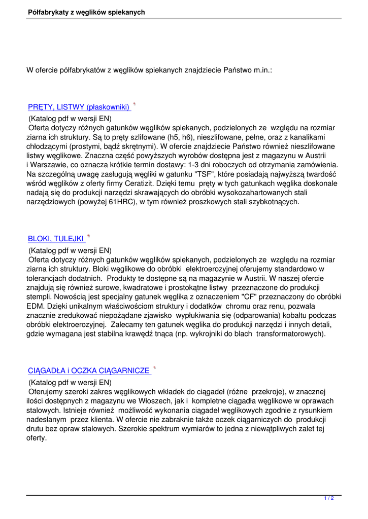 Półfabrykaty z węglików spiekanych W ofercie półfabrykatów z węglików spiekanych znajdziecie Państwo m.in.: PRĘTY, LISTWY (płaskowniki) (Katalog pdf w wersji EN) Oferta dotyczy różnych gatunków węglików spiekanych, podzielonych ze względu na rozmiar ziarna ich struktury. Są to pręty szlifowane (h5, h6), nieszlifowane, pełne, oraz z kanalikami chłodzącymi (prostymi, bądź skrętnymi). W ofercie znajdziecie Państwo również nieszlifowane listwy węglikowe. Znaczna część powyższych wyrobów dostępna jest z magazynu w Austrii i Warszawie, co oznacza krótkie termin dostawy: 1-3 dni roboczych od otrzymania zamówienia. Na szczególną uwagę zasługują węgliki w gatunku "TSF", które posiadają najwyższą twardość wśród węglików z oferty firmy Ceratizit. Dzięki temu pręty w tych gatunkach węglika doskonale nadają się do produkcji narzędzi skrawających do obróbki wysokozahartowanych stali narzędziowych (powyżej 61HRC), w tym również proszkowych stali szybkotnących. BLOKI, TULEJKI (Katalog pdf w wersji EN) Oferta dotyczy różnych gatunków węglików spiekanych, podzielonych ze względu na rozmiar ziarna ich struktury. Bloki węglikowe do obróbki elektroerozyjnej oferujemy standardowo w tolerancjach dodatnich. Produkty te dostępne są na magazynie w Austrii. W naszej ofercie znajdują się również surowe, kwadratowe i prostokątne listwy przeznaczone do produkcji stempli. Nowością jest specjalny gatunek węglika z oznaczeniem "CF" przeznaczony do obróbki EDM. Dzięki unikalnym właściwościom struktury i dodatków chromu oraz renu, pozwala znacznie zredukować niepożądane zjawisko wypłukiwania się (odparowania) kobaltu podczas obróbki elektroerozyjnej. Zalecamy ten gatunek węglika do produkcji narzędzi i innych detali, gdzie wymagana jest stabilna krawędź tnąca (np. wykrojniki do blach transformatorowych). CIĄGADŁA i OCZKA CIĄGARNICZE (Katalog pdf w wersji EN) Oferujemy szeroki zakres węglikowych wkładek do ciągadeł (różne przekroje), w znacznej ilości dostępnych z magazynu we Włoszech, jak i kompletne ciągadła węglikowe w oprawach stalowych. Istnieje również możliwość wykonania ciągadeł węglikowych zgodnie z rysunkiem nadesłanym przez klienta. W ofercie nie zabraknie także oczek ciągarniczych do produkcji drutu bez opraw stalowych. Szerokie spektrum wymiarów to jedna z niewątpliwych zalet tej oferty. 1/2 Półfabrykaty z węglików spiekanych KRĄŻKI POD FREZY PIŁKOWE (Katalog pdf w wersji EN) Firma Ceratizit zajmuje się również produkcją przygotówek frezów piłkowych. Produkty te w wersji nieszlifowanej dostępne są z magazynu w Austrii (zakres średnic zewnętrznych: od Fi 10,0 mm aż do Fi 350,5 mm). Na życzenie klienta dostarczamy również powyższe produkty w wersji szlifowanej. Frezy piłkowe z węglików spiekanych doskonale się sprawdząją przy wykonywaniu m.in. rowków, zwłaszcza na stalach narzędziowych i konstrukcyjnych o twardościach do 55HRC. NARZĘDZIA DO KUCIA GWOŹDZI (Katalog pdf w wersji EN) Firma Ceratizit oferuje kompletne zestawy narzędzi węglikowych (oprawki, matryce, noże, stemple gładkie, "w kratkę", z literami, popychacze) przeznaczone do kucia gwoździ dla następujących maszyn: - Wafios N1, N2, N11, N21, N3, N31, N4, N41, N5, N51, N6, N61, N80, N80D, N80R, N90, N90A, ND90, ND91, ND92-S, - Encotec Duża część powyższych narzędzi dostępna jest z magazynu producenta we Włoszech. W przypadku matryc termin dostawy wynosi około 4 tygodni od momentu określenia przez klienta interesujących go wymiarów. DETALE „NA GOTOWO”, WG RYSUNKÓW 2/2