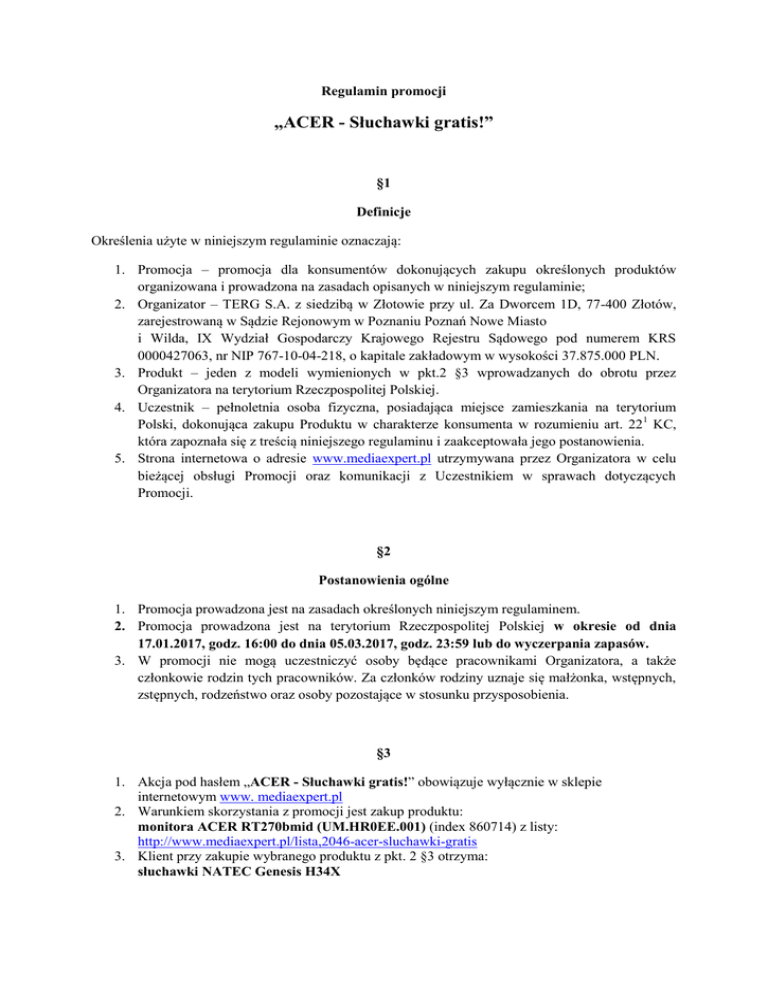 Regulamin promocji „ACER - Słuchawki gratis!” §1 Definicje Określenia użyte w niniejszym regulaminie oznaczają: 1. Promocja – promocja dla konsumentów dokonujących zakupu określonych produktów organizowana i prowadzona na zasadach opisanych w niniejszym regulaminie; 2. Organizator – TERG S.A. z siedzibą w Złotowie przy ul. Za Dworcem 1D, 77-400 Złotów, zarejestrowaną w Sądzie Rejonowym w Poznaniu Poznań Nowe Miasto i Wilda, IX Wydział Gospodarczy Krajowego Rejestru Sądowego pod numerem KRS 0000427063, nr NIP 767-10-04-218, o kapitale zakładowym w wysokości 37.875.000 PLN. 3. Produkt – jeden z modeli wymienionych w pkt.2 §3 wprowadzanych do obrotu przez Organizatora na terytorium Rzeczpospolitej Polskiej. 4. Uczestnik – pełnoletnia osoba fizyczna, posiadająca miejsce zamieszkania na terytorium Polski, dokonująca zakupu Produktu w charakterze konsumenta w rozumieniu art. 22 1 KC, która zapoznała się z treścią niniejszego regulaminu i zaakceptowała jego postanowienia. 5. Strona internetowa o adresie www.mediaexpert.pl utrzymywana przez Organizatora w celu bieżącej obsługi Promocji oraz komunikacji z Uczestnikiem w sprawach dotyczących Promocji. §2 Postanowienia ogólne 1. Promocja prowadzona jest na zasadach określonych niniejszym regulaminem. 2. Promocja prowadzona jest na terytorium Rzeczpospolitej Polskiej w okresie od dnia 17.01.2017, godz. 16:00 do dnia 05.03.2017, godz. 23:59 lub do wyczerpania zapasów. 3. W promocji nie mogą uczestniczyć osoby będące pracownikami Organizatora, a także członkowie rodzin tych pracowników. Za członków rodziny uznaje się małżonka, wstępnych, zstępnych, rodzeństwo oraz osoby pozostające w stosunku przysposobienia. §3 1. Akcja pod hasłem „ACER - Słuchawki gratis!” obowiązuje wyłącznie w sklepie internetowym www. mediaexpert.pl 2. Warunkiem skorzystania z promocji jest zakup produktu: monitora ACER RT270bmid (UM.HR0EE.001) (index 860714) z listy: http://www.mediaexpert.pl/lista,2046-acer-sluchawki-gratis 3. Klient przy zakupie wybranego produktu z pkt. 2 §3 otrzyma: słuchawki NATEC Genesis H34X 4. Aby skorzystać z promocji należy dodać wybrany monitor do koszyka, w którym automatycznie zostaną dodane słuchawki NATEC Genesis H34X w cenie 1 zł przy czym kwota 1zł będzie pomniejszać cenę wybranego ekspresu. 5. W przypadku zwrotu zakupionego produktu, zwrotowi podlega również produkt gratisowy, otrzymany wraz z produktem głównym. 6. W przypadku zakupu na raty w okresie obowiązywania akcji warunkiem skorzystania z aktualnych promocji ratalnych jest indywidualna ocena zdolności kredytowej Klienta przez bank. W przypadku negatywnej odpowiedzi banku na wniosek kredytowy Klienta zostaną zaproponowane inne alternatywne formy płatności. (Wysokość rat zaprezentowanych w akcji nie zawiera ubezpieczenia. RRSO dla kredytu w opcji bez ubezpieczenia wynosi 0%. Minimalna wartość brutto towaru nabywanego w systemie ratalnym wynosi 100zł. Ubezpieczenie spłaty kredytu ma charakter dobrowolny i stanowi zabezpieczenie pożyczki/kredytu w momencie zgody Klienta na zawarcie umowy ubezpieczenia kredytu. Stopa procentowa dla kredytu 0% w zakresie od 3 do 40 miesięcy wynosi od 0% do 32,6% w zależności od wybranego banku i rodzaju ubezpieczenia.) 7. Materiały reklamowe zaprezentowane na stronie www.mediaexpert.pl nie stanowią oferty w rozumieniu art.66§ 1K.C §4 Reklamacje 1. Reklamacje związane z Promocją mogą być zgłaszane mailowo na adres: [email protected]., przez cały czas trwania promocji, jednak nie później niż w terminie 21 dni od dnia jej zakończenia. 2. Reklamacje spóźnione nie będą rozpatrywane. Organizator rozpatruje reklamacje oraz przekazuje informacje zainteresowanemu w terminie do 14 (czternastu) dni od daty wpłynięcia reklamacji. Za przekazanie odpowiedzi na reklamację w terminie 14 uznaje się wysłanie listu poleconego w tym terminie. §5 Ochrona danych osobowych 1. Administratorem danych osobowych jest Organizator. 2. Dane osobowe Uczestników przetwarzane będą przy zachowaniu zasad określonych w ustawie z dnia 29 sierpnia 1997 r. o ochronie danych osobowych (Dz. U. 2002 Nr 101 poz. 926 z póź. zm.) w celu przeprowadzenia Promocji i wyłonienia osób nagrodzonych. Podanie danych osobowych jest dobrowolne, jednak jest niezbędne w celu wzięcia udziału w Promocji, przyznania i odbioru nagród i prezentów. Uczestnikowi przysługuje prawo wglądu do danych osobowych, ich poprawiania oraz żądania ich usunięcia. 3. Przetwarzanie danych osobowych obejmować będzie zakres danych wskazanych w formularzu rejestracyjnym. Za odrębną zgodą Uczestnika wyrażoną w zgłoszeniu Organizatorowi przysługiwać będzie prawo do przetwarzania danych osobowych w celach marketingowych oraz prawo przesyłania informacji handlowej drogą elektroniczną. 4. Uczestnik jest zobowiązany do informowania Organizatora na piśmie o każdej zmianie w zakresie danych osobowych. Niezależnie od innych postanowień niniejszego regulaminu, w przypadku nie dokonania aktualizacji danych osobowych przez Uczestnika Organizator nie ponosi odpowiedzialności za opóźnienie lub brak działania spowodowany brakiem takiej aktualizacji, a w szczególności za niemożność wydania nagrody w konkursie lub prezentu. §7 Postanowienia końcowe 1. Regulamin wchodzi w życie z dniem 17.01.2017 i będzie dostępny w okresie trwania Promocji w siedzibie Organizatora oraz na Stronie internetowej: http://www.mediaexpert.pl/lp,2046-acer-sluchawki-gratis 2. Tytuły poszczególnych punktów regulaminu mają charakter informacyjny i nie stanowią części regulaminu. 3. We wszystkich sprawach dotyczących Promocji, a nieuregulowanych regulaminem mają zastosowanie przepisy prawa polskiego. 4. Niniejsza Promocja nie jest grą losową ani zakładem wzajemnym, których wynik zależy od przypadku (przeprowadzenie losowania) w rozumieniu art. 2 ustawy z dnia 19 listopada 2009 roku o grach ha
