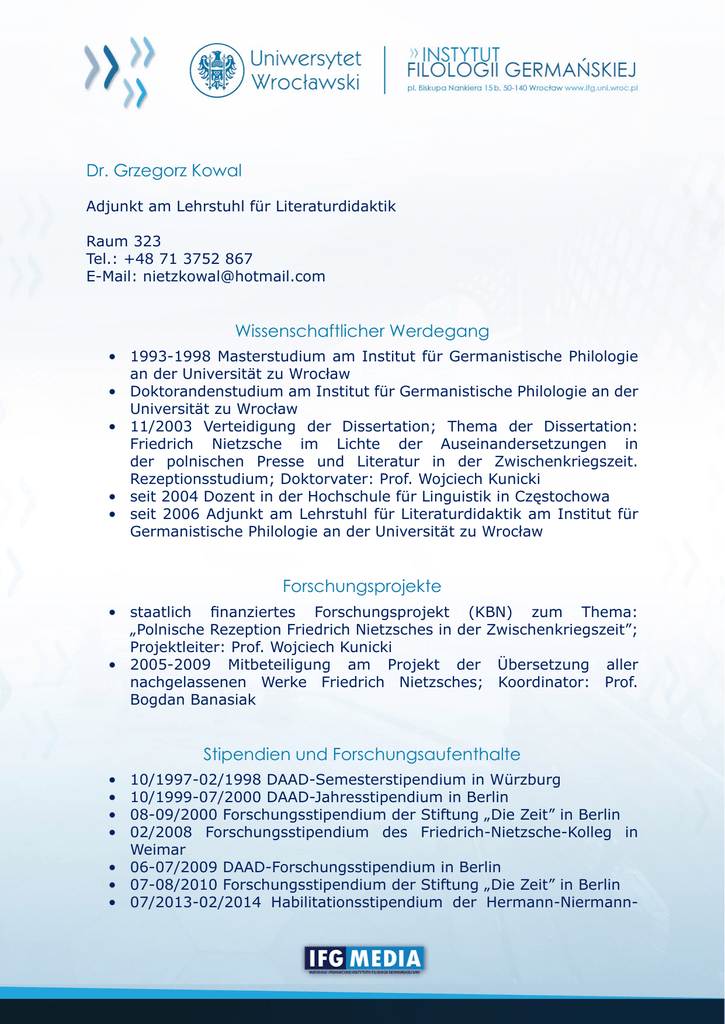 Dr. Grzegorz Kowal Adjunkt am Lehrstuhl für Literaturdidaktik Raum 323 Tel.: +48 71 3752 867 E-Mail: [email protected] Wissenschaftlicher Werdegang • 1993-1998 Masterstudium am Institut für Germanistische Philologie an der Universität zu Wrocław • Doktorandenstudium am Institut für Germanistische Philologie an der Universität zu Wrocław • 11/2003 Verteidigung der Dissertation; Thema der Dissertation: Friedrich Nietzsche im Lichte der Auseinandersetzungen in der polnischen Presse und Literatur in der Zwischenkriegszeit. Rezeptionsstudium; Doktorvater: Prof. Wojciech Kunicki • seit 2004 Dozent in der Hochschule für Linguistik in Częstochowa • seit 2006 Adjunkt am Lehrstuhl für Literaturdidaktik am Institut für Germanistische Philologie an der Universität zu Wrocław Forschungsprojekte • staatlich finanziertes Forschungsprojekt (KBN) zum Thema: „Polnische Rezeption Friedrich Nietzsches in der Zwischenkriegszeit”; Projektleiter: Prof. Wojciech Kunicki • 2005-2009 Mitbeteiligung am Projekt der Übersetzung aller nachgelassenen Werke Friedrich Nietzsches; Koordinator: Prof. Bogdan Banasiak Stipendien und Forschungsaufenthalte • • • • 10/1997-02/1998 DAAD-Semesterstipendium in Würzburg 10/1999-07/2000 DAAD-Jahresstipendium in Berlin 08-09/2000 Forschungsstipendium der Stiftung „Die Zeit” in Berlin 02/2008 Forschungsstipendium des Friedrich-Nietzsche-Kolleg in Weimar • 06-07/2009 DAAD-Forschungsstipendium in Berlin • 07-08/2010 Forschungsstipendium der Stiftung „Die Zeit” in Berlin • 07/2013-02/2014 Habilitationsstipendium der Hermann-Niermann- Stiftung in Würzburg Populärwissenschaftliche Aktivitäten • seit 2006 Veranstaltung von Begegnungen deutschsprachiger Autoren und Wissenschaftler mit Germanistikstudenten der Universität Wrocław, darunter mit Wolfgang Bittner, Therese Chromik, Bodo Heimann, Jenny Erpenbeck, Rolf Hochhuth, Fredrik Vahle, Klaus Werner, Rolf Fieguth, Mehmet Öztürk • seit 2006 Präsentation der deutschen Kultur und Literatur in Form von öffentlichen Vorträgen, u.a. für Studenten der Soziologie und Philosophie der Universität Wrocław, niederschlesische Bibliothekare und Mitglieder von Lesegemeinschaften • seit 2006 Durchführung von Schulungen, u.a. für Deutschlehrer in Brzeg und Wrocław • seit 2006 Mitherausgabe von drei wissenschaftlichen Reihen: „Poetae Silesiae”, „Dobre Książki z Niemiec” und „Colloquia Orientalia Bialostocensia” Lehrtätigkeit am Instutit für Germanische Philologie an der Universität zu Wrocław • Proseminare: Die Welt der Aphorismen Friedrich Nietzsches, Friedrich Nietzsche in der europäischen Literatur, Lebensweisheiten nach Arthur Schopenhauer, Leben und Legende von Janusz Korczak • Übungen: Sprechübungen, Textdidaktik, Textarbeit, Hörverstehen an der Hochschule für Linguistik in Częstochowa • Vorlesungen: Geschichte der deutschen Literatur, EU als politisches und wirtschaftliches System, Einführung in die Literaturwissenschaft, Literaturtheorie • Übungen: Sprechübungen, Schreiben, Übersetzen, Leseverstehen, Geschichte der deutschen Literatur • Master- und Bachelorseminare Wissenschaftliche Konferenzen • Vortrag Die Personifizierung des Übermenschen in der Gestalt des polnischen Marschalls Józef Piłsudski während der in Poznań vom 9.-10. Oktober 2003 organisierten Konferenz Philosophie Friedrich Nietzsches • Vortrag Nietzsche und die polnische Avantgarde in der Zwischenkriegszeit. Witkacy – Gombrowicz – Schulz während der in Kudowa Zdrój vom 9.-13. Juni 2004 organisierten Konferenz Nietzsche und Schopenhauer. Rezeptionsphänomene der Wendezeiten • Vortrag Entbildung bei Friedrich Nietzsche und Thomas Mann während der in Nysa vom 19.-23. Oktober 2005 organisierten Konferenz Bildung. Facetten der wissenschaftlichen Kommunikation • Vortrag Legendäre Legende. Nietzsche während der in Lewin Kłodzki vom 11.-16. September 2007 organisierten Konferenz Rund um Nietzsche • Vortrag Polnische Rezeption des Willens zur Macht Friedrich Nietzsches als Werk und Gedanke während der in Weimar vom 13.-16. Dezember 2007 organisierten Konferenz Der späte Nietzsche oder die Frage nach dem Willen zur Macht • Vortrag Dionysosfigur in der Tradition vor und nach Nietzsche während der am 3. Dezember 2008 in Nysa organisierten Konferenz Dionysos und das Dionysische. Mythos, Literatur, Philosophie, Wissenschaft • Vortrag Ernst Jünger – homo autocreatus während der in Wrocław vom 10.-14. Juni 2009 organisierten Konferenz Ernst Jünger – Versuch einer Bilanz • Vortrag Słowacki – Selbtdarsteller während der in Białystok vom 6.-9. Mai 2009 organisierten Konferenz Die Schönheit Słowackis • Vortrag Polnische Rezeption Martin Pollacks während der in Wrocław und Wałbrzych vom 28.-29. April 2010 organisierten Konferenz Österreichische Literatur in Polen in den Jahren 1980-2009 • Vortrag Galizien. Multikulturalitat einer Provinz als Fallbeispiel des Kulturtransfers während der in Wrocław vom 18.-20.. Oktober 2012 organisierten Konferenz Die Hauptfaktoren und Grundzäsuren des deutsch-polnischen Kulturtransfers im 19. und 20. Jahrhundert • Vortrag Hermeneutischer Zirkel: Theorie und Praxis während der in Legnica vom 24.-25. April 2014 organisierten Konferenz Fremdsprachen und Literatur in der Zeit der Krise der Geisteswissenschaften • Vortrag Das Ende der symbolischen Legende? Janusz Korczak als Fallbeispiel während der in Olsztyn vom 8.-9. Mai 2014 organisierten Konferenz Imaginationen des Endes • Vortrag Schwarze Legende Nietzsches während der in Częstochowa vom 16.-17. Oktober 2014 organisierten Konferenz Rezeption der deutschsprachigen Literatur nach 1968 in deutschsprachigem Raum und Polen – Ähnlichkeiten und Unterschiede • Vortrag Affinität zwischen Mythos und Kind während der vom 14.–15. Mai 2015 in Wrocław organisierten Konferenz Die mythische Zeit der Moderne (wie sie sich in Literatur und Philosp